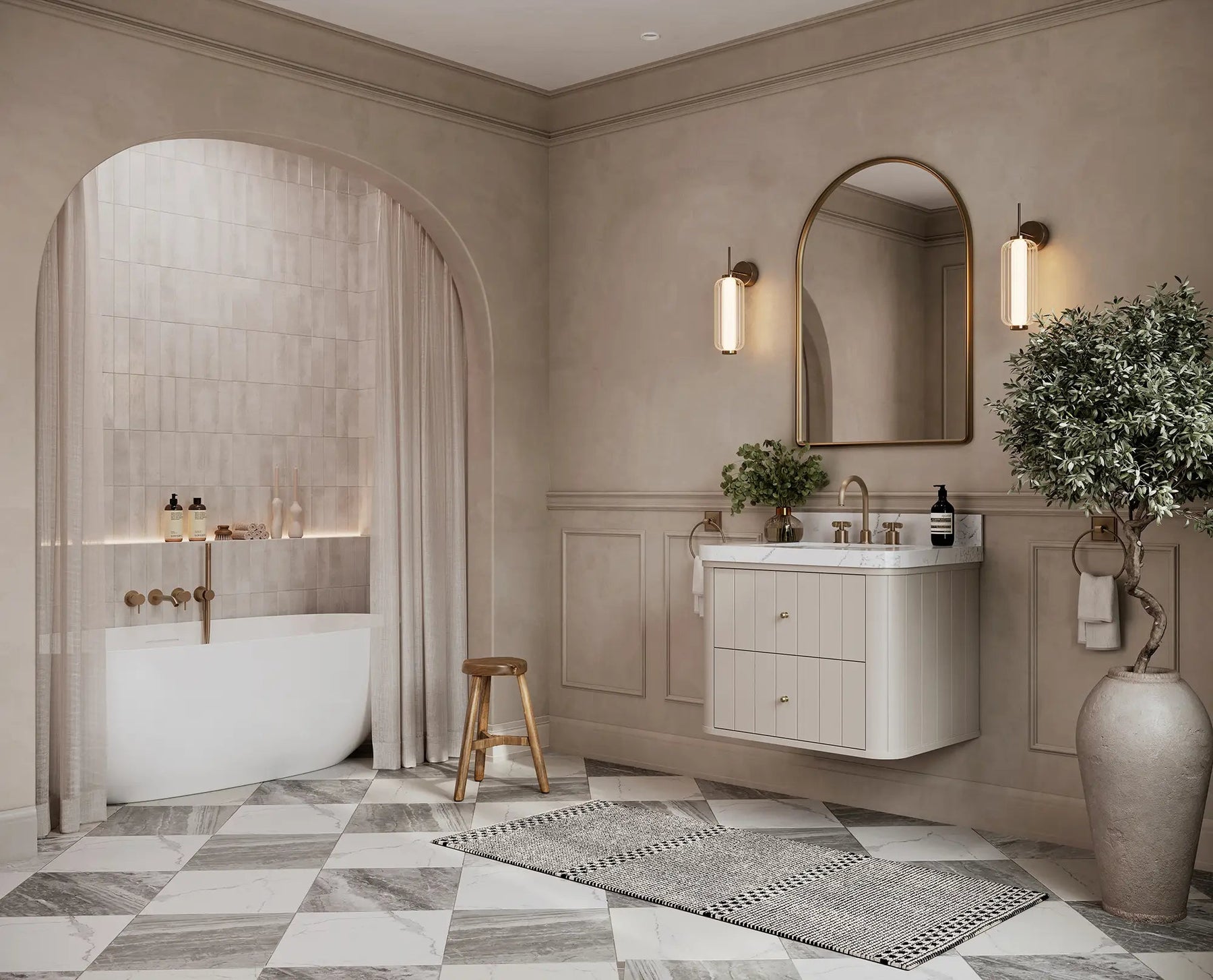 Premium countertop options – quartz or marble surfaces with eased, rounded edges that mirror the vanity’s gentle curves.