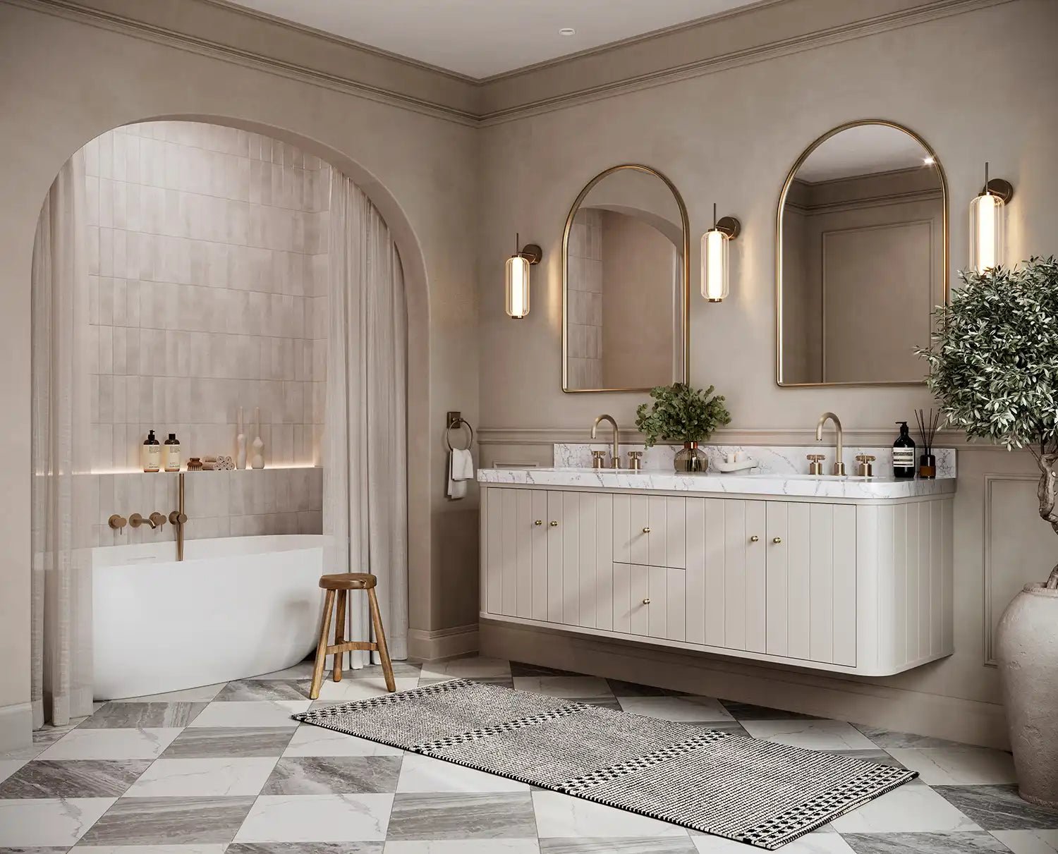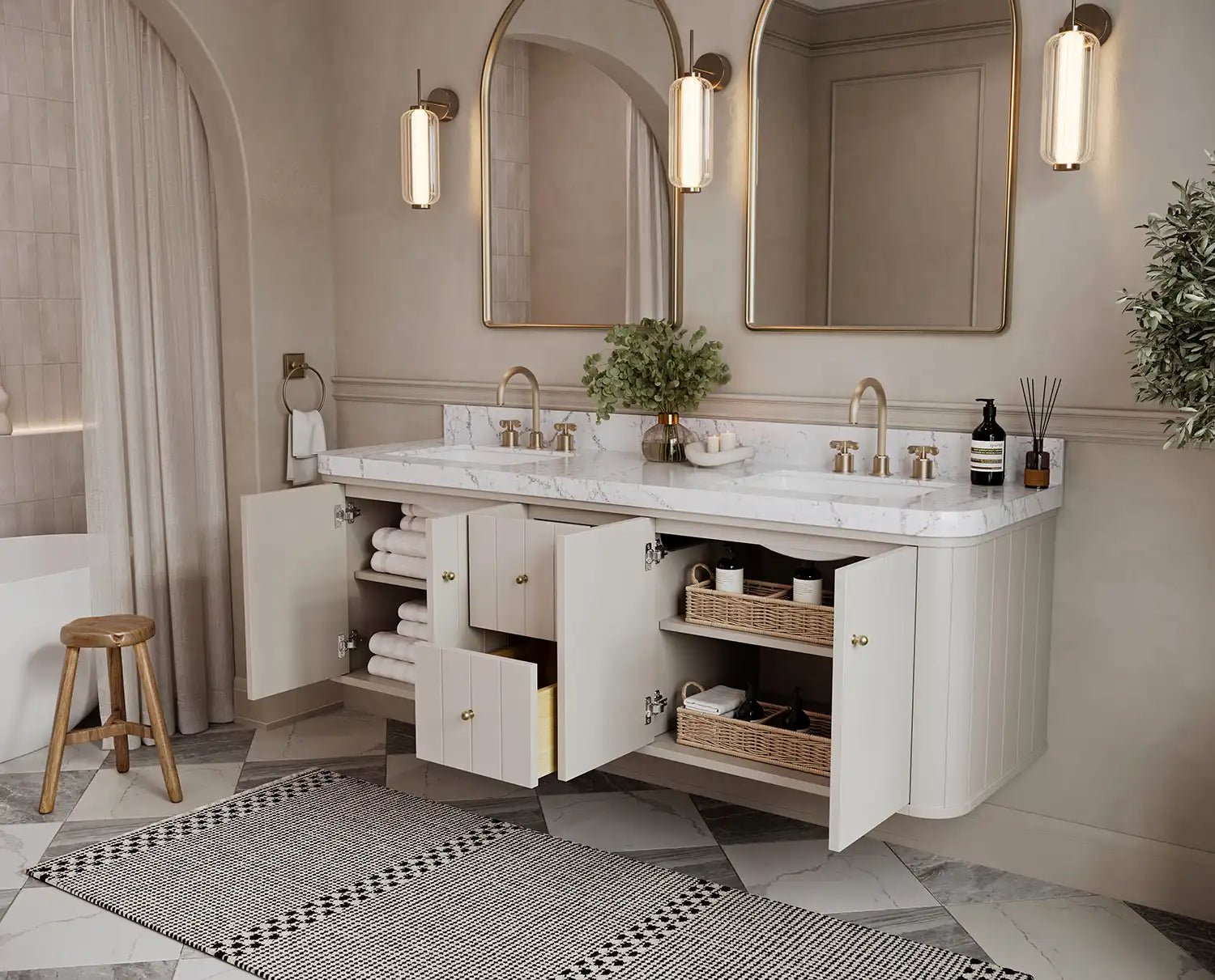 Vanity Countertops options: For Calacatta Laza Quartz, Calacatta Gold Quartz, Empira White Quartz, Pure White Quartz, Palissandro Quartz, Calacatta Nuvo Quartz, Carrara Marble, Carrara Quartz, Calacatta Sienna Quartz, Terrazzo Arctic Breeze, Terrazzo Golden Dusk we have Rounded - Edge option.