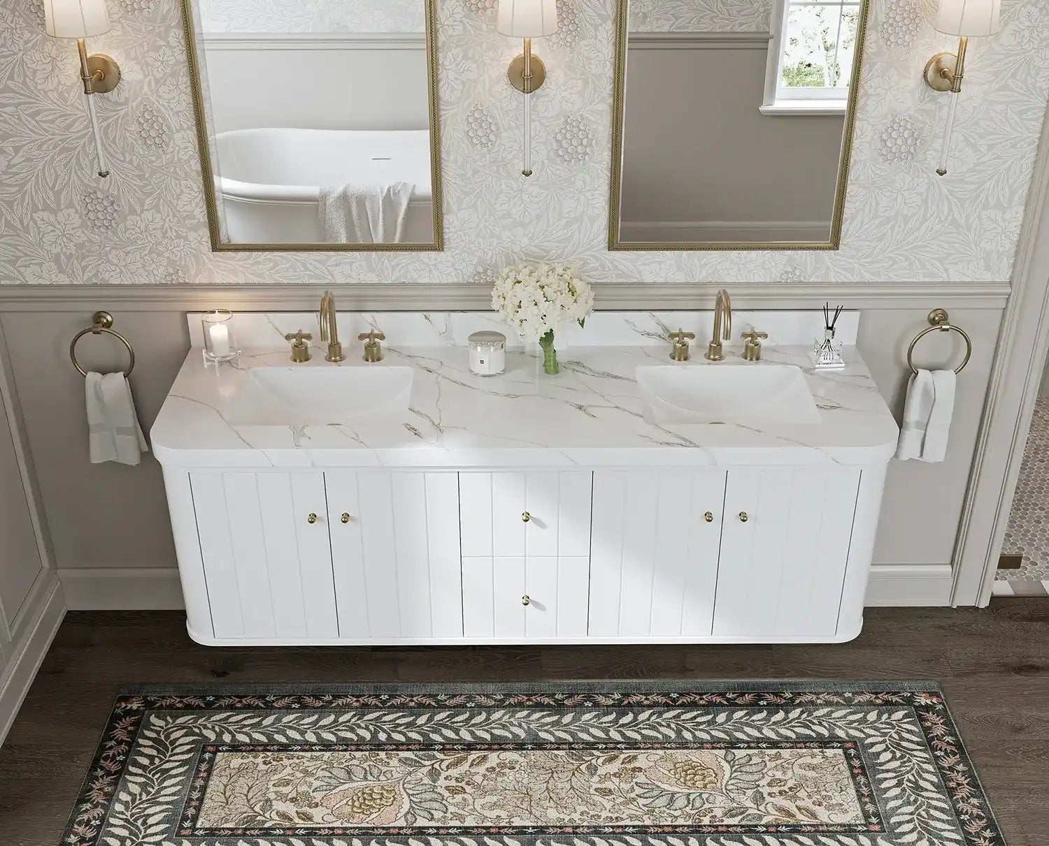 Premium countertop options – quartz or marble surfaces with eased, rounded edges that mirror the vanity’s gentle curves.