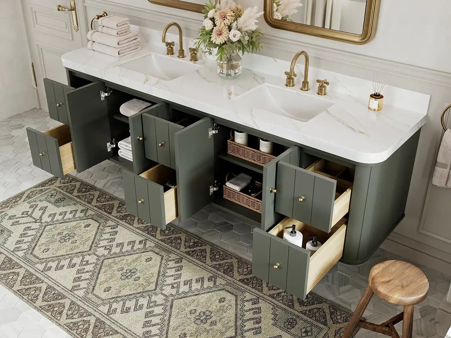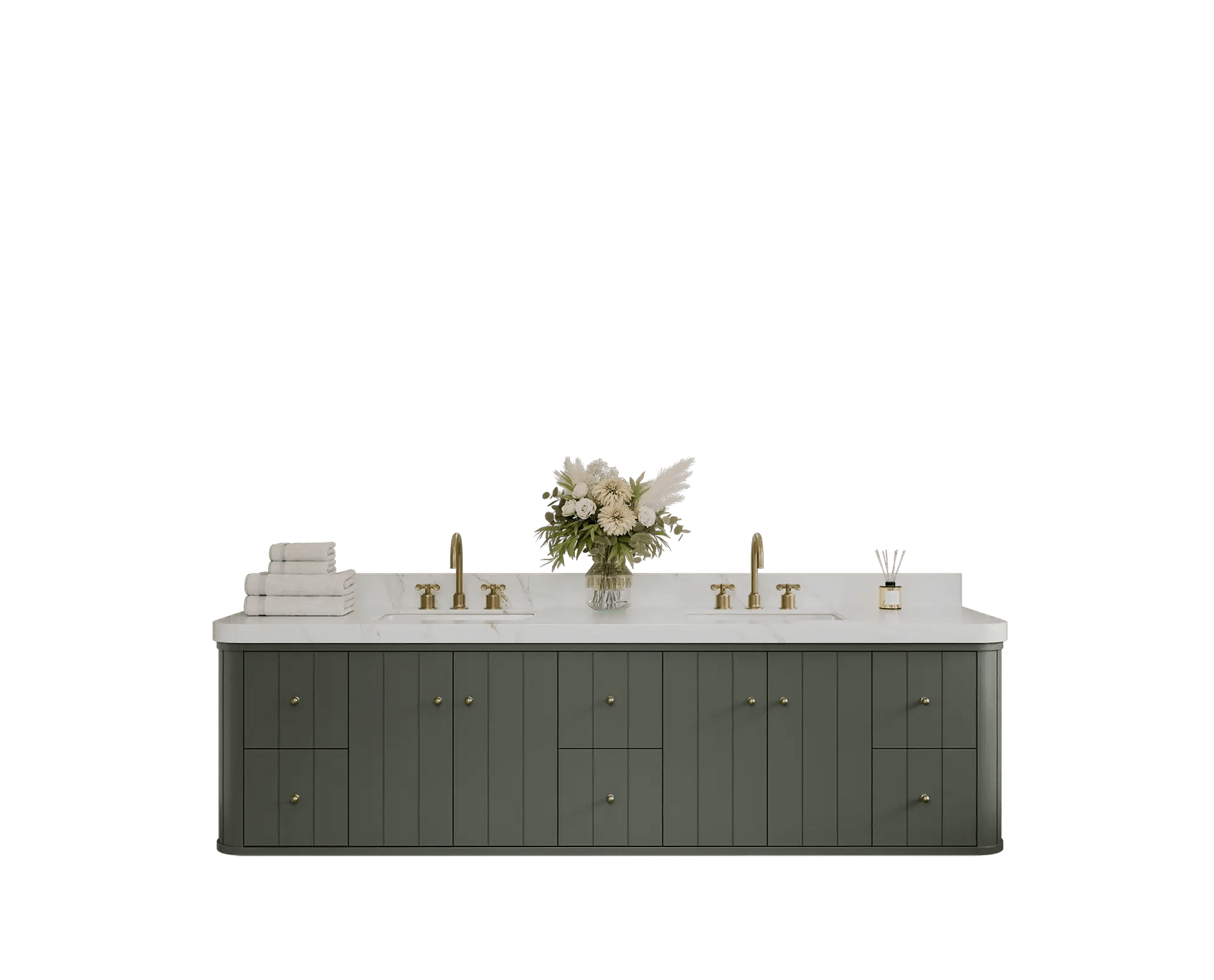 Vanity Countertops options: For Calacatta Laza Quartz, Calacatta Gold Quartz, Empira White Quartz, Pure White Quartz, Palissandro Quartz, Calacatta Nuvo Quartz, Carrara Marble, Carrara Quartz, Calacatta Sienna Quartz, Terrazzo Arctic Breeze, Terrazzo Golden Dusk we have Rounded - Edge option.