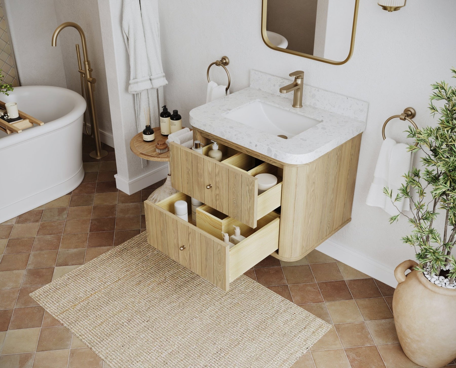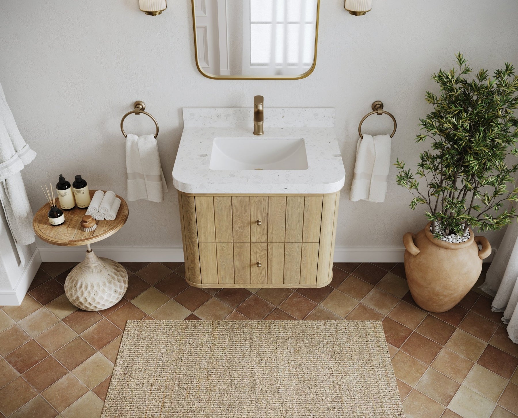 Vanity Countertops options: For Calacatta Laza Quartz, Calacatta Gold Quartz, Empira White Quartz, Pure White Quartz, Palissandro Quartz, Calacatta Nuvo Quartz, Carrara Marble, Carrara Quartz, Calacatta Sienna Quartz, Terrazzo Arctic Breeze, Terrazzo Golden Dusk we have Rounded - Edge option.