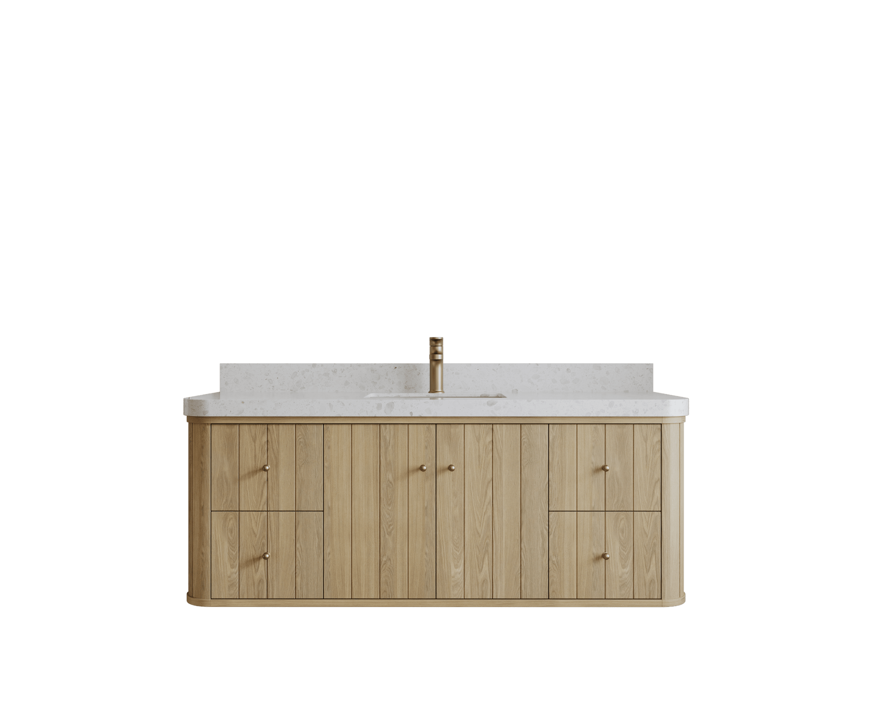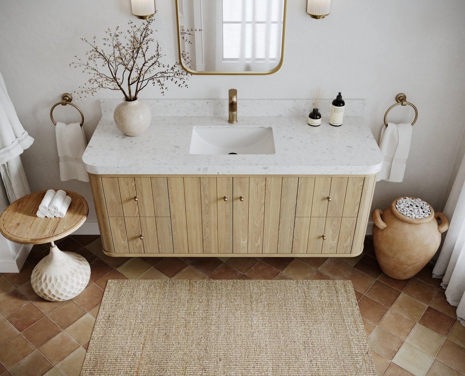 Vanity Countertops options: For Calacatta Laza Quartz, Calacatta Gold Quartz, Empira White Quartz, Pure White Quartz, Palissandro Quartz, Calacatta Nuvo Quartz, Carrara Marble, Carrara Quartz, Calacatta Sienna Quartz, Terrazzo Arctic Breeze, Terrazzo Golden Dusk we have Rounded - Edge option.
