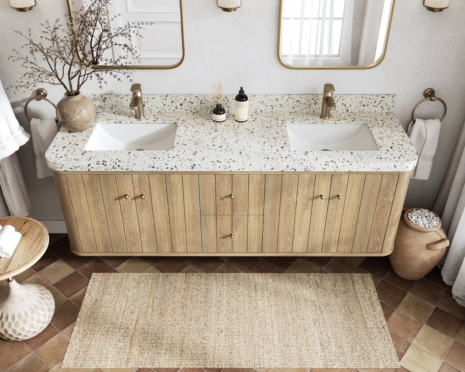 Vanity Countertops options: For Calacatta Laza Quartz, Calacatta Gold Quartz, Empira White Quartz, Pure White Quartz, Palissandro Quartz, Calacatta Nuvo Quartz, Carrara Marble, Carrara Quartz, Calacatta Sienna Quartz, Terrazzo Arctic Breeze, Terrazzo Golden Dusk we have Rounded - Edge option.