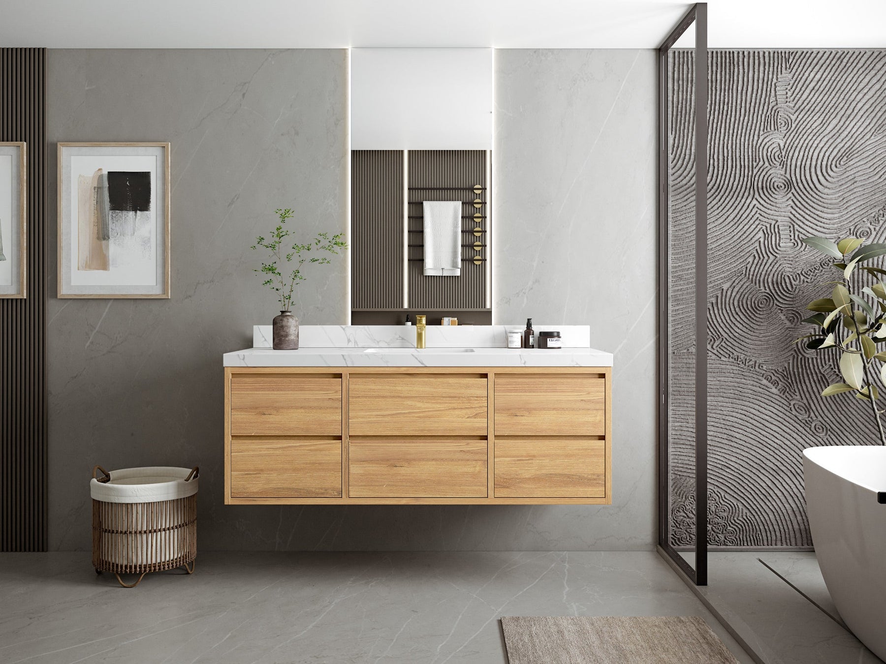 Madison Floating Teak 60 in. W x 22 in. D Single Sink Bathroom Vanity in Light Natural with 1.5 in Calacatta Laza Quartz Countertop