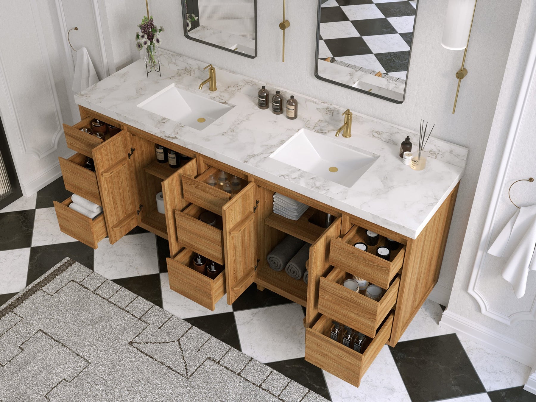 1. Traditional style with a modern twist - made from teak wood, this bathroom vanity features a clean, contemporary design with soft-close hardware and antique brass hardware.