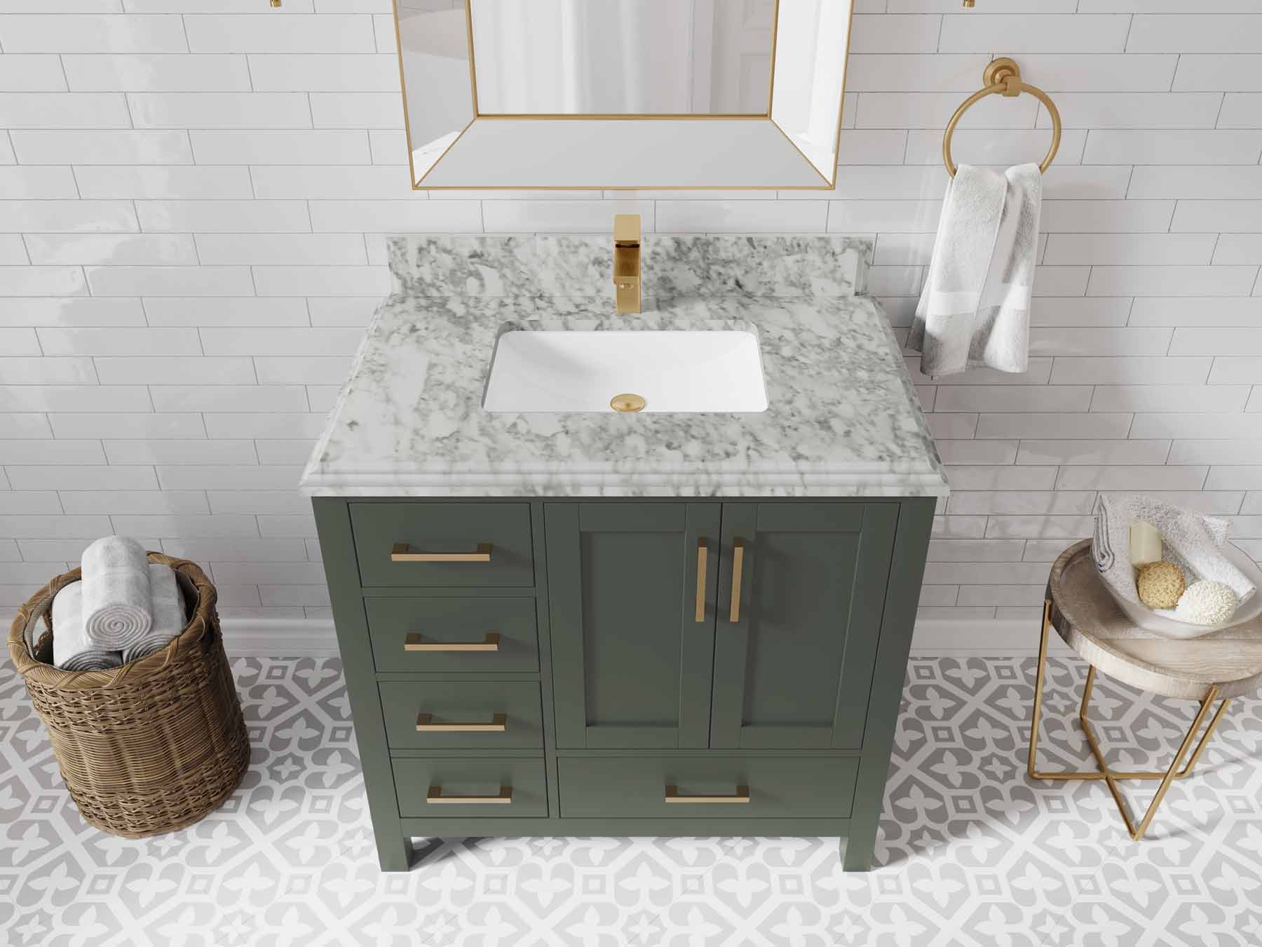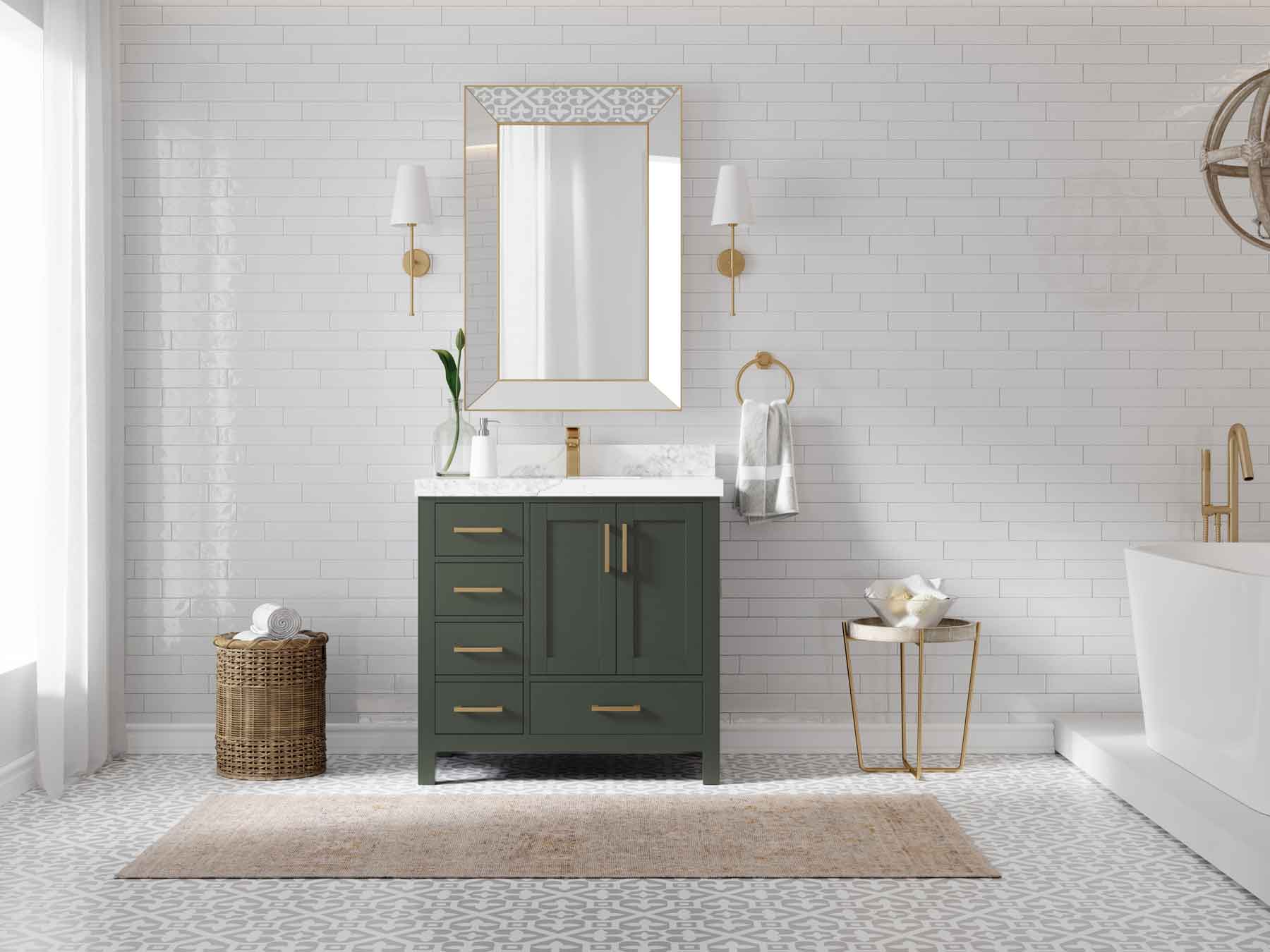 1. Traditional style with a modern twist - made from birch tree and plywood, this bathroom vanity features a clean, contemporary design with soft-close hardware and gold and nickel brushed hardware.