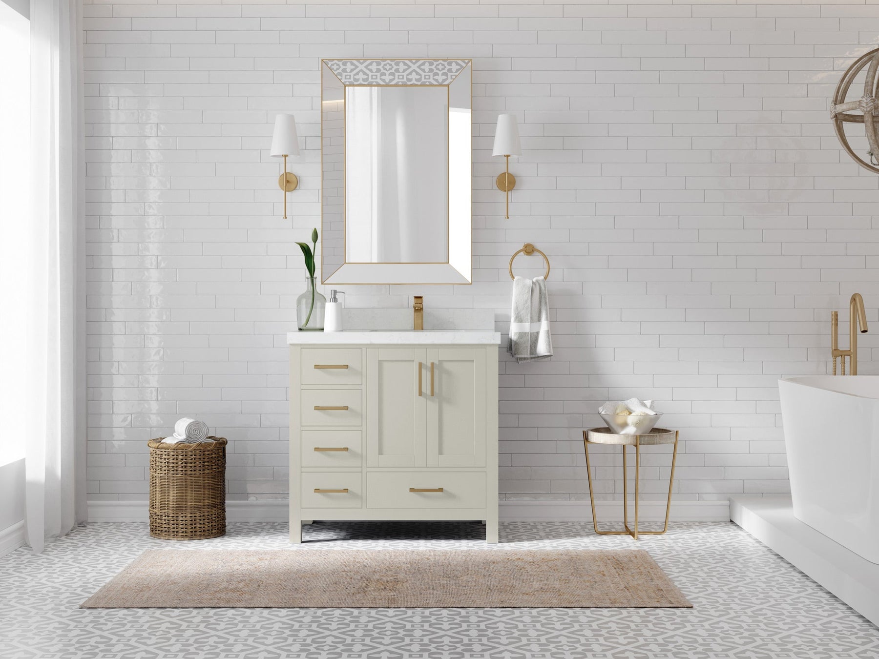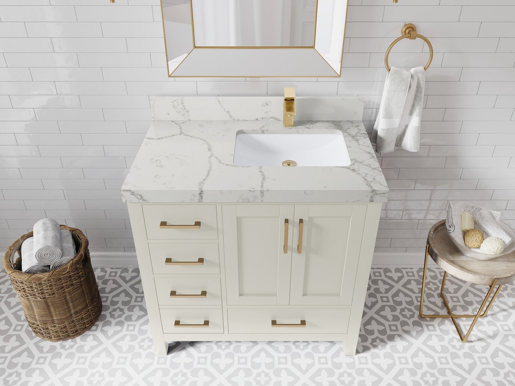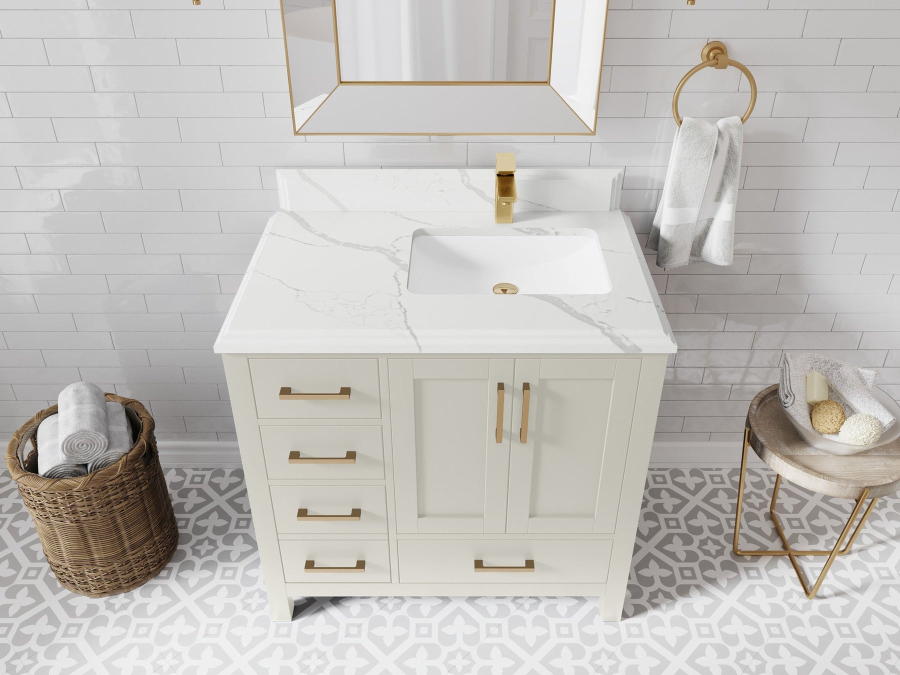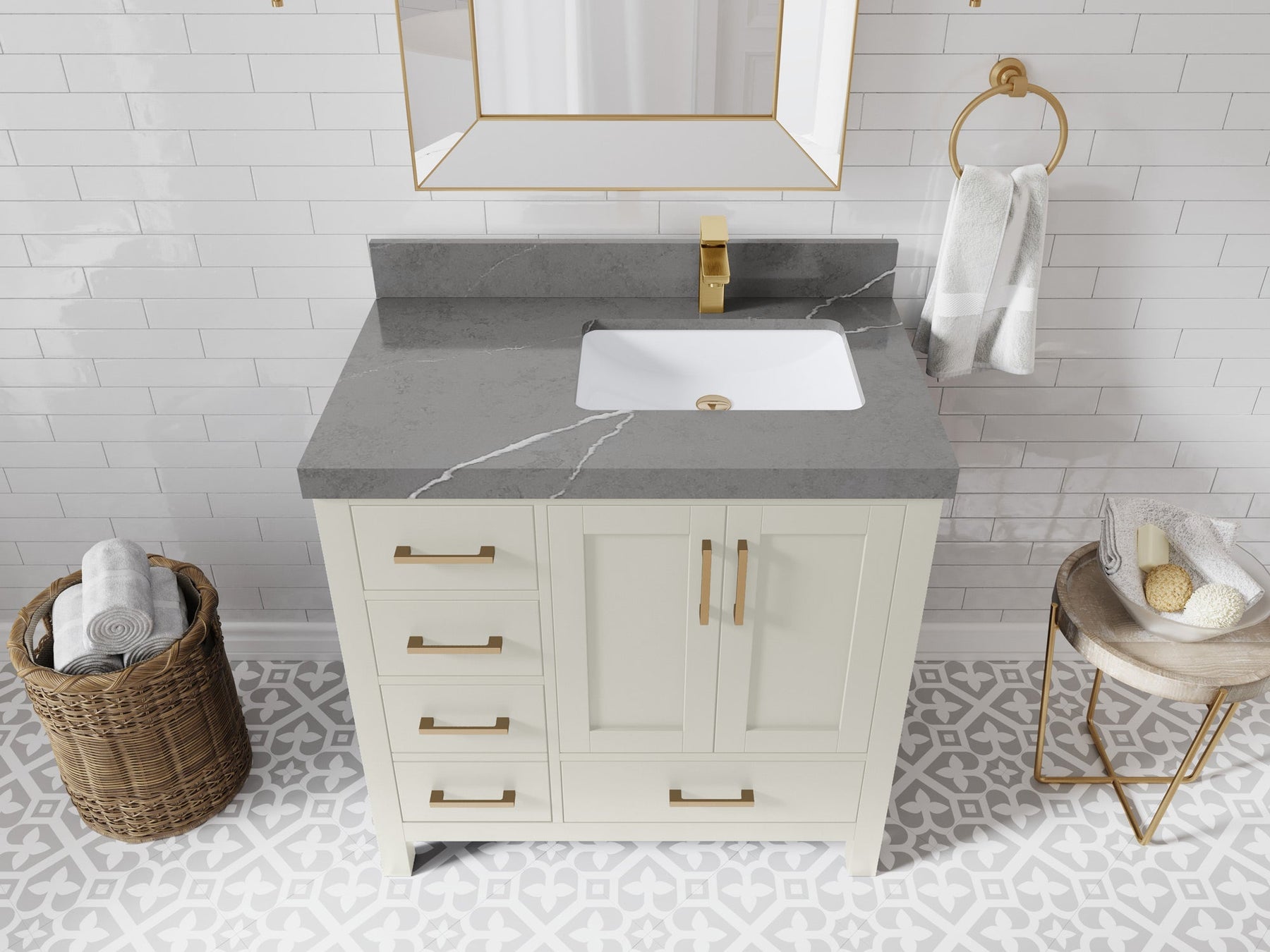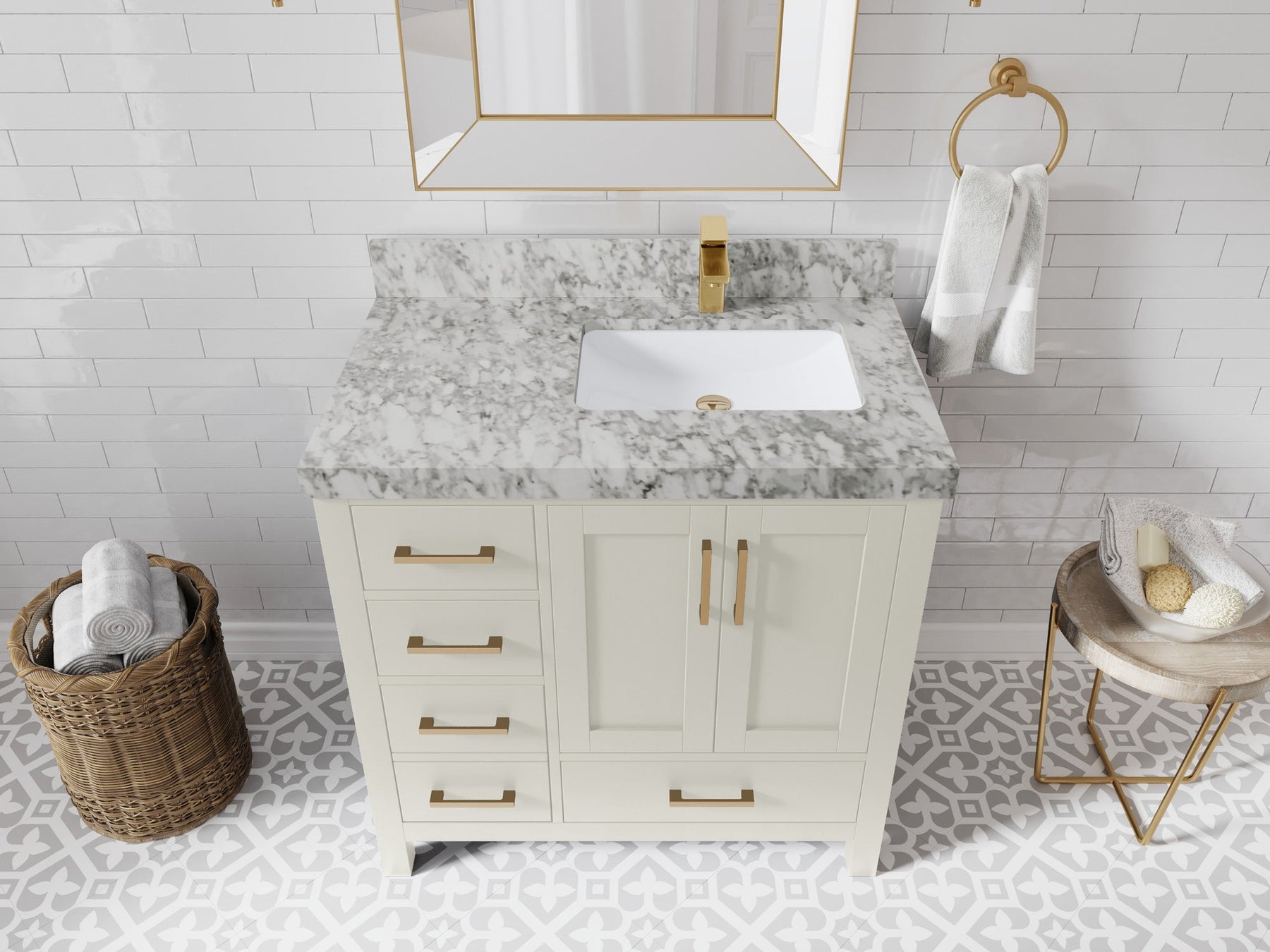1. Traditional style with a modern twist - made from birch tree and plywood, this bathroom vanity features a clean, contemporary design with soft-close hardware and gold and nickel brushed hardware.