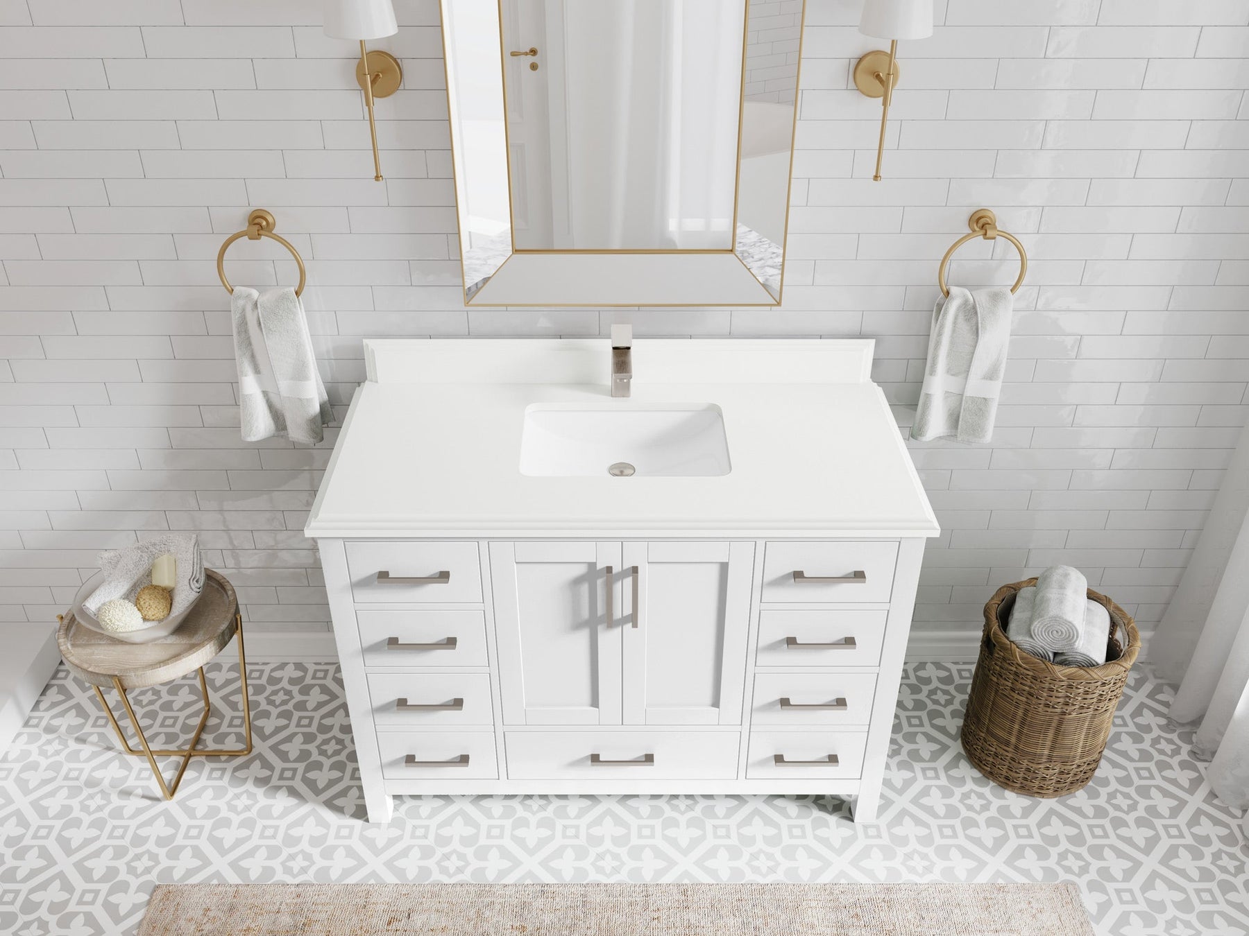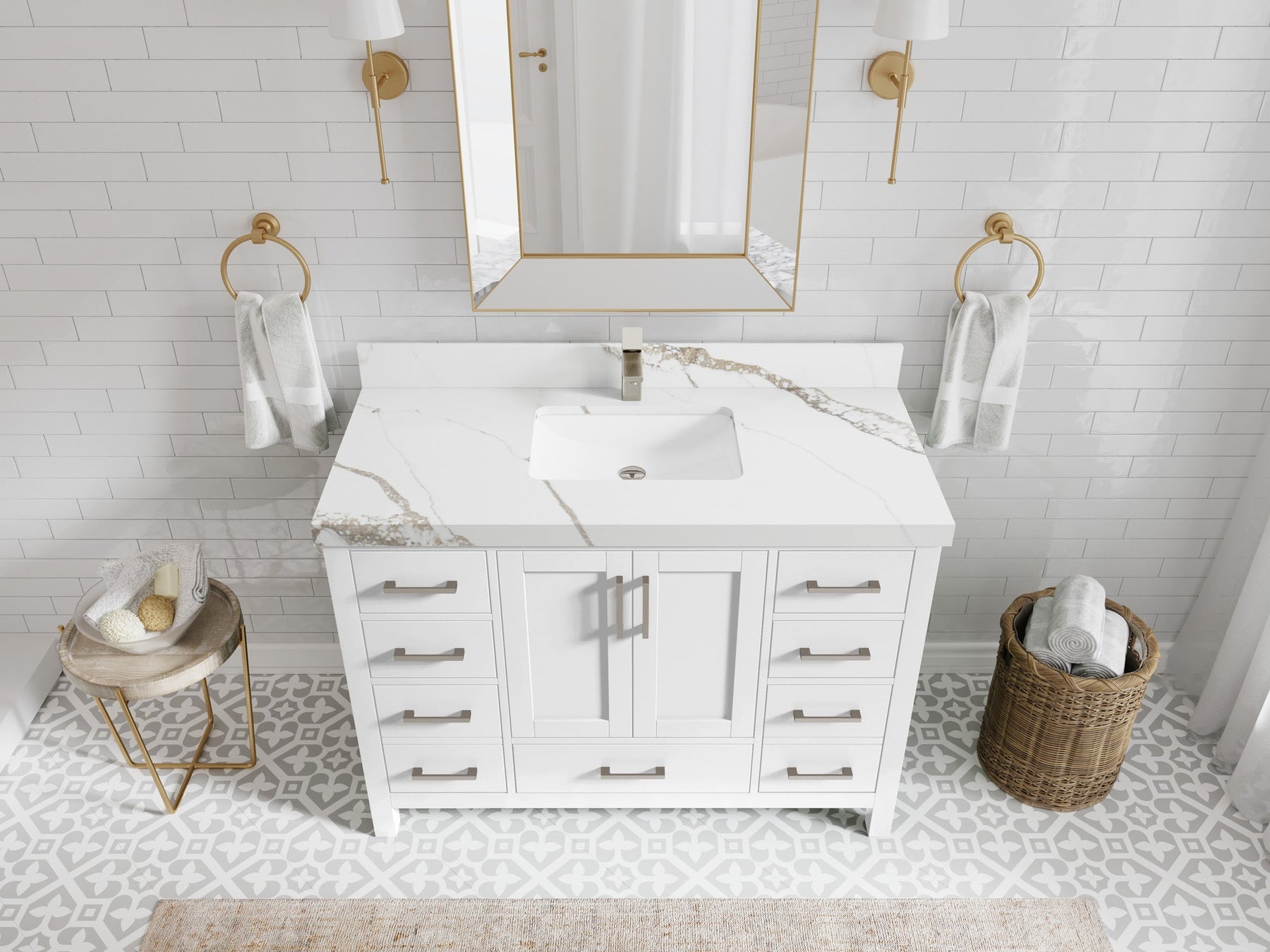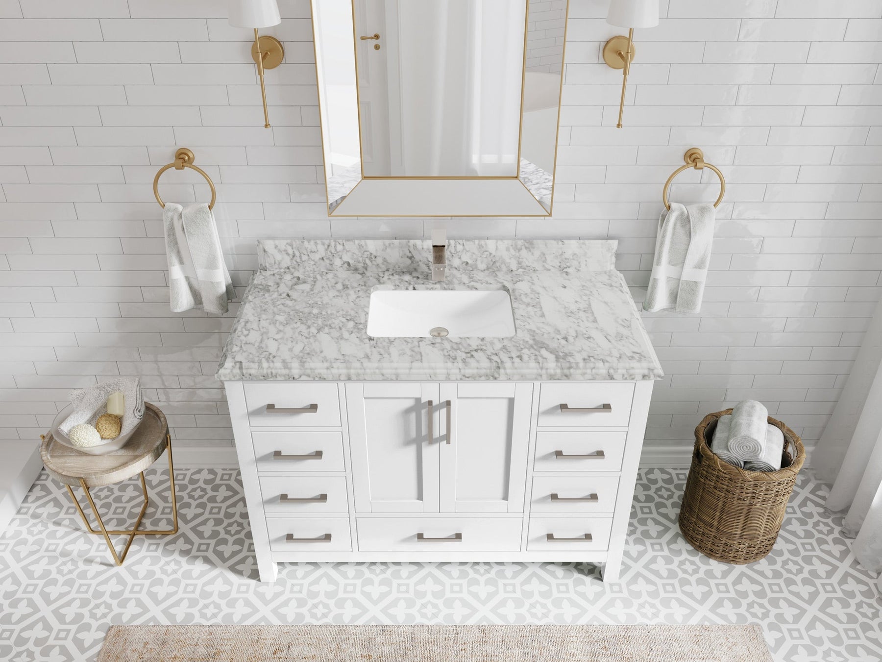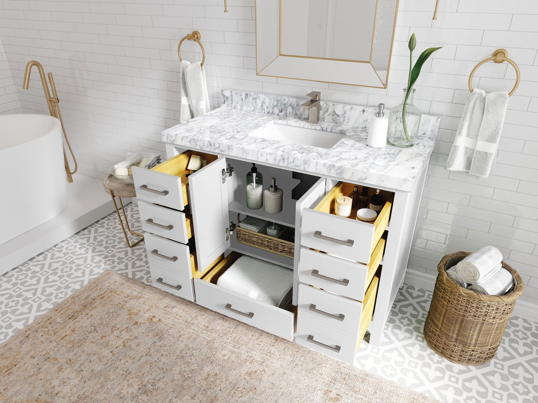 1. Traditional style with a modern twist - made from birch tree and plywood, this bathroom vanity features a clean, contemporary design with soft-close hardware and gold and nickel brushed hardware.