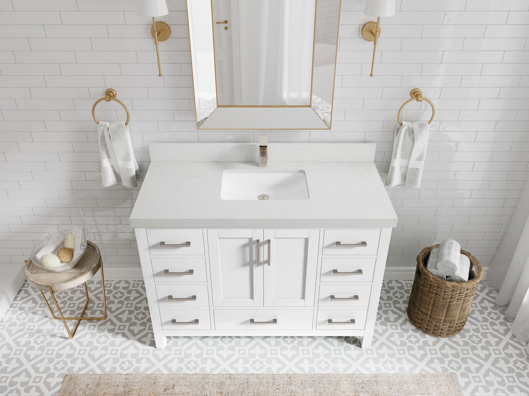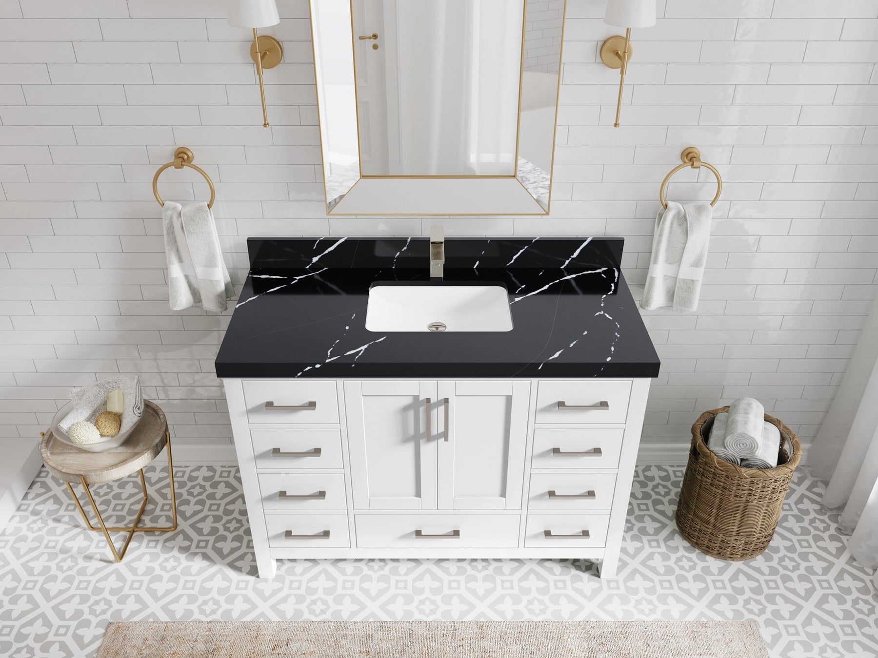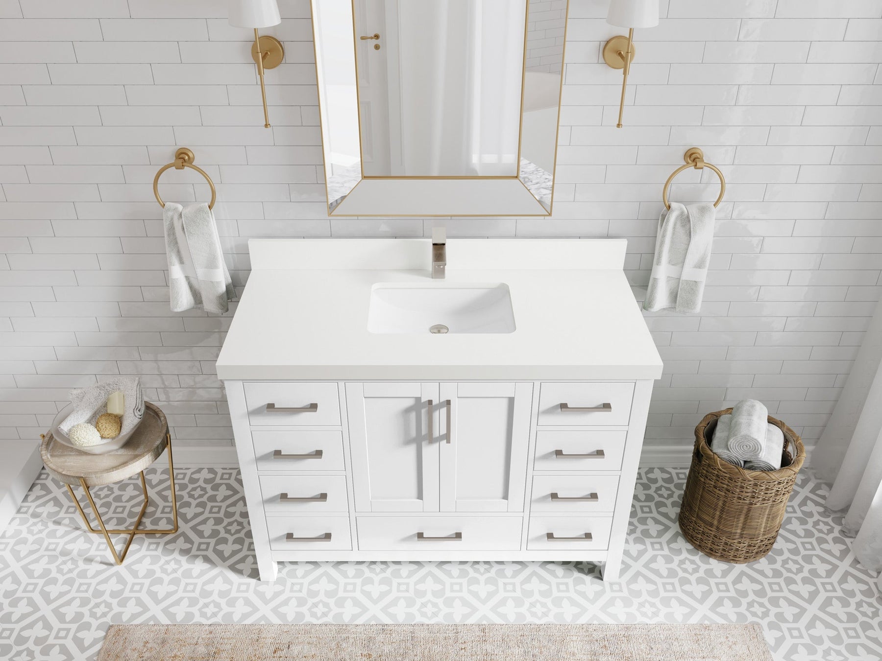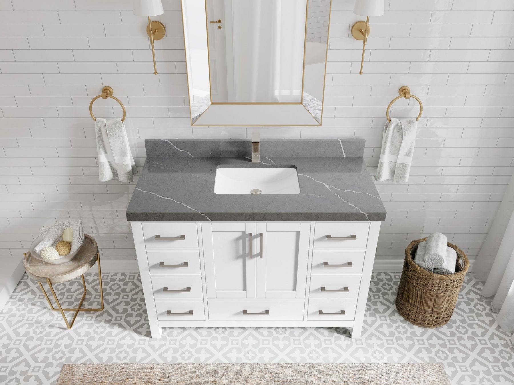 1. Traditional style with a modern twist - made from birch tree and plywood, this bathroom vanity features a clean, contemporary design with soft-close hardware and gold and nickel brushed hardware.