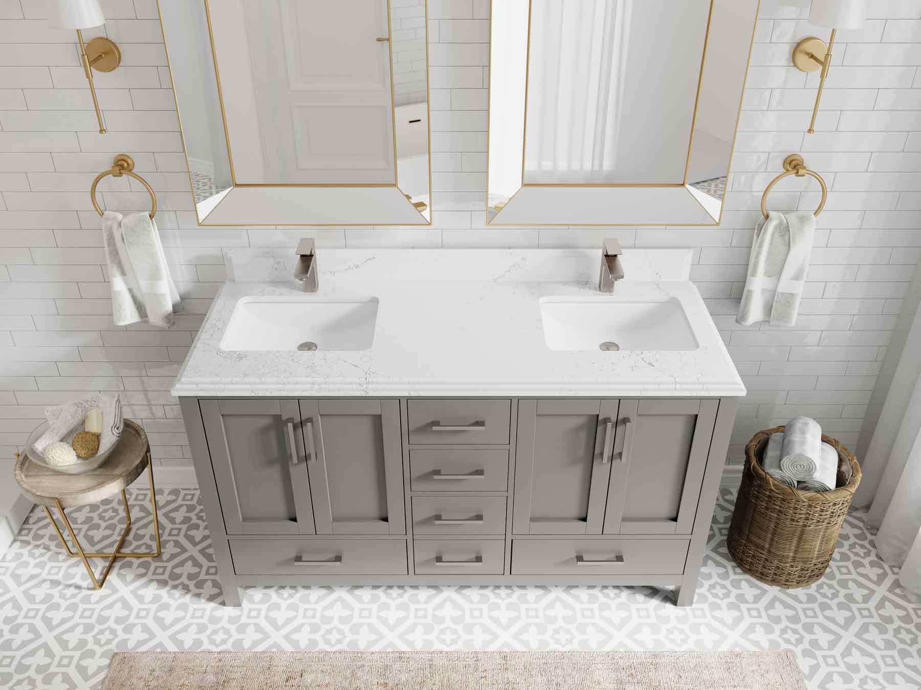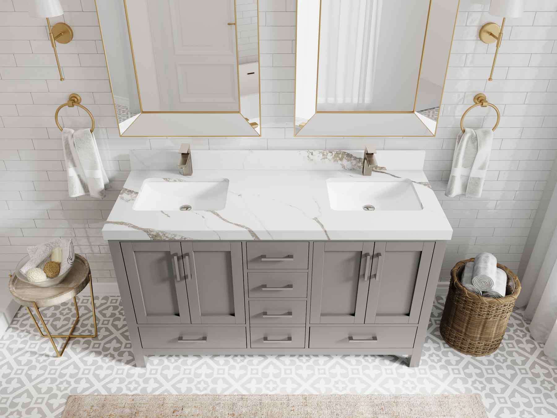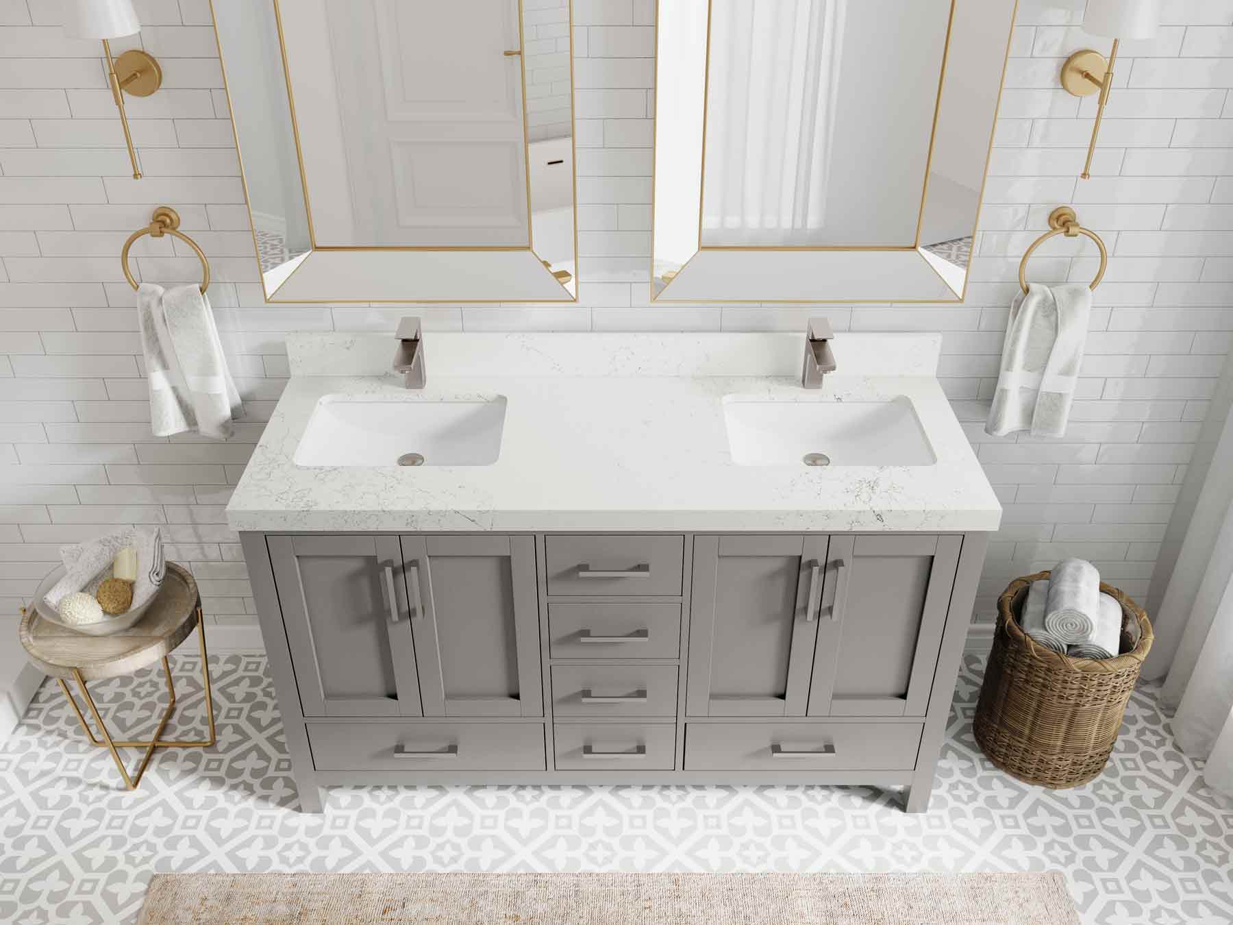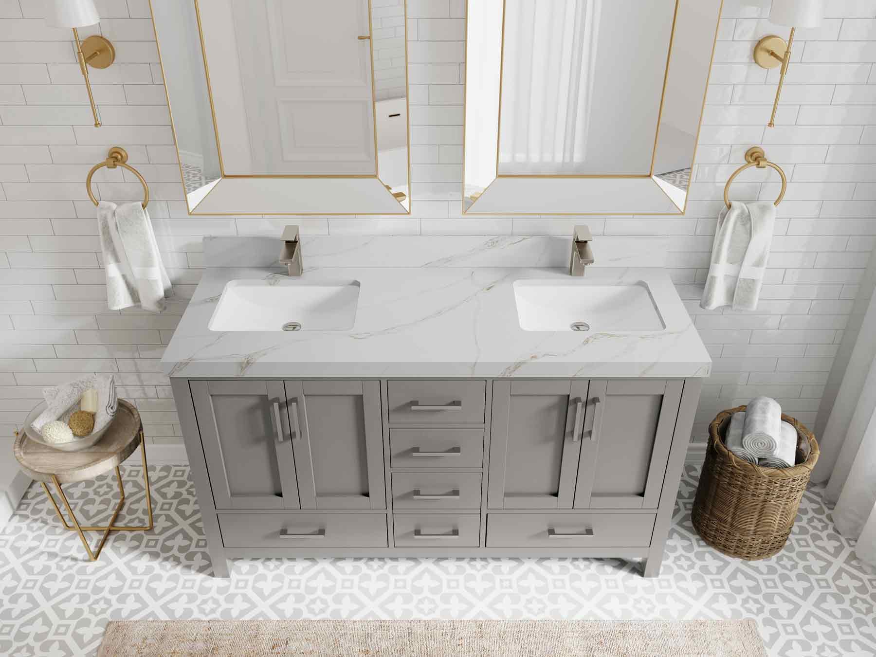 1. Traditional style with a modern twist - made from birch tree and plywood, this bathroom vanity features a clean, contemporary design with soft-close hardware and gold and nickel brushed hardware.