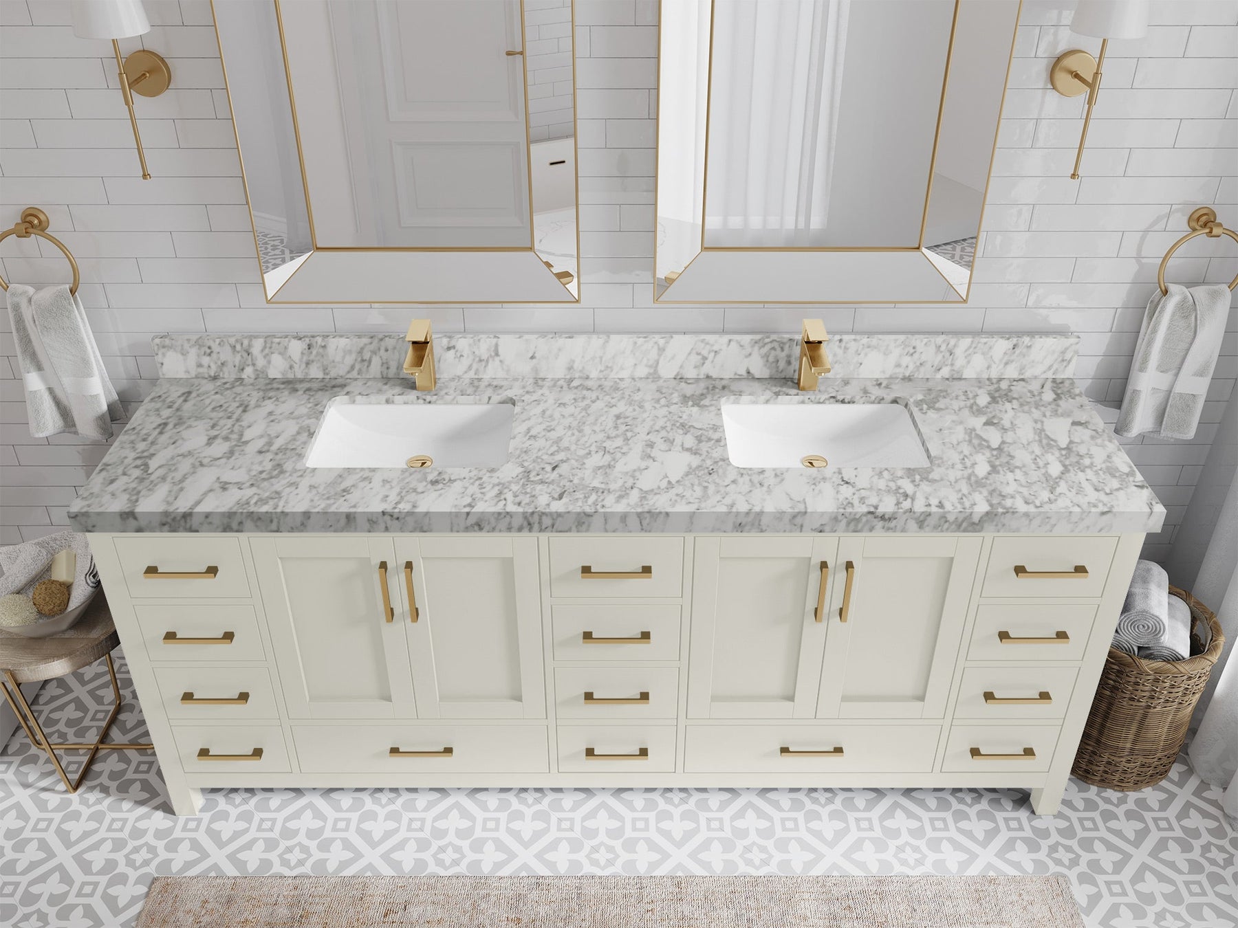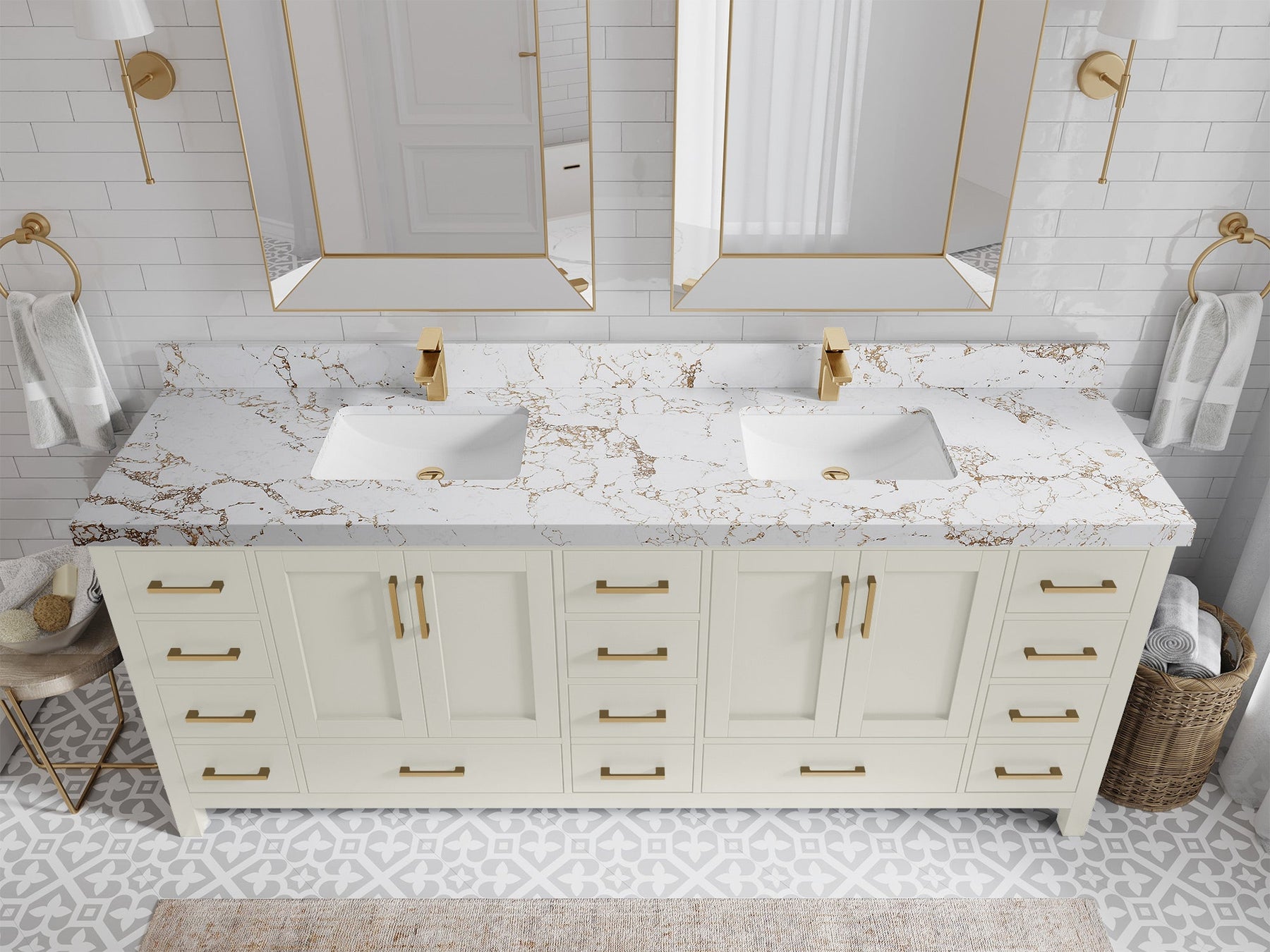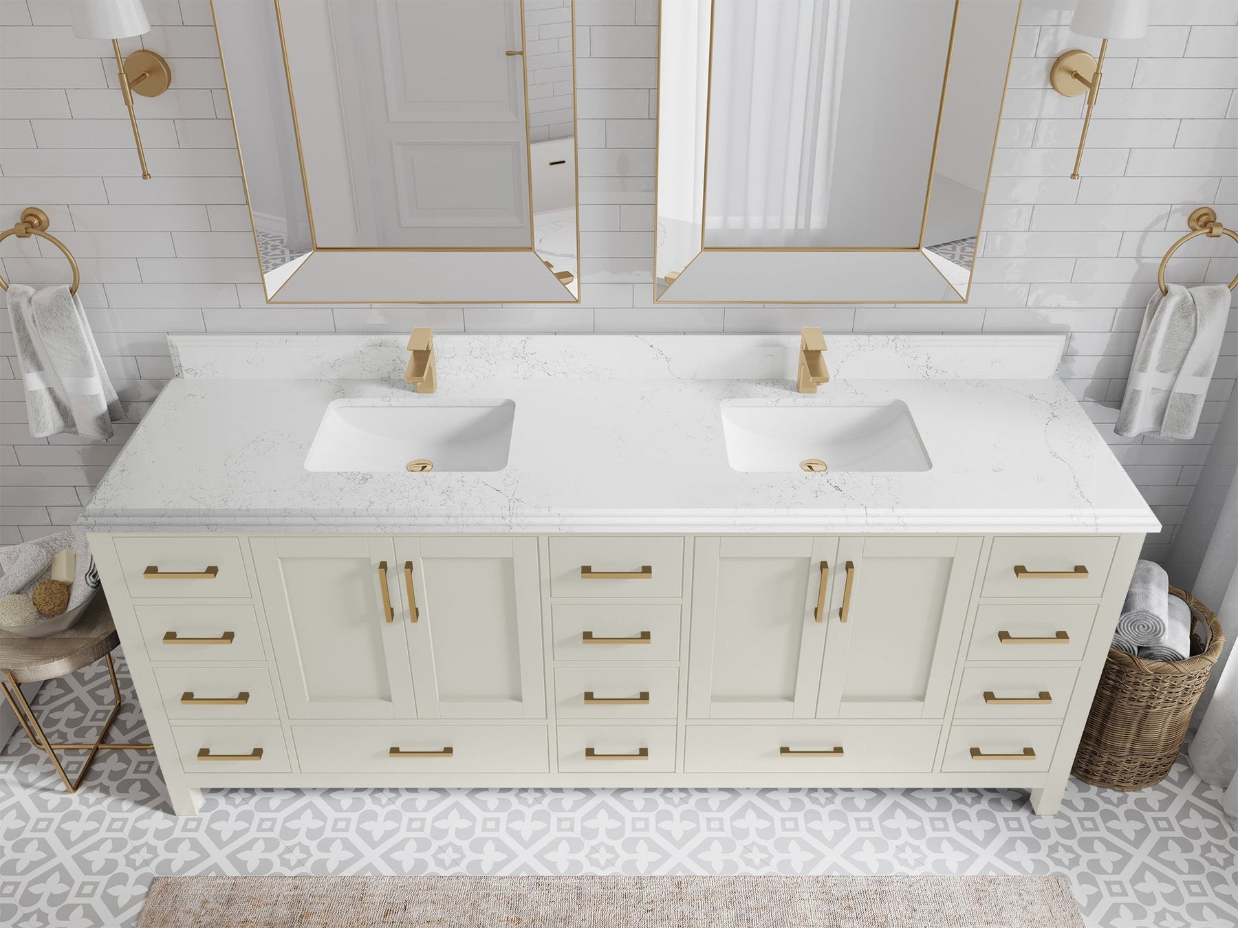 1. Traditional style with a modern twist - made from birch tree and plywood, this bathroom vanity features a clean, contemporary design with soft-close hardware and gold and nickel brushed hardware.
