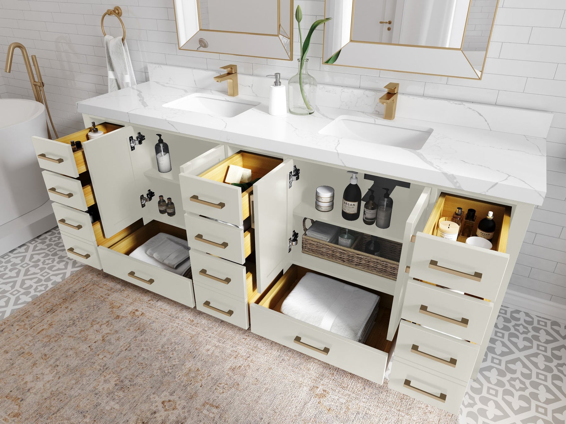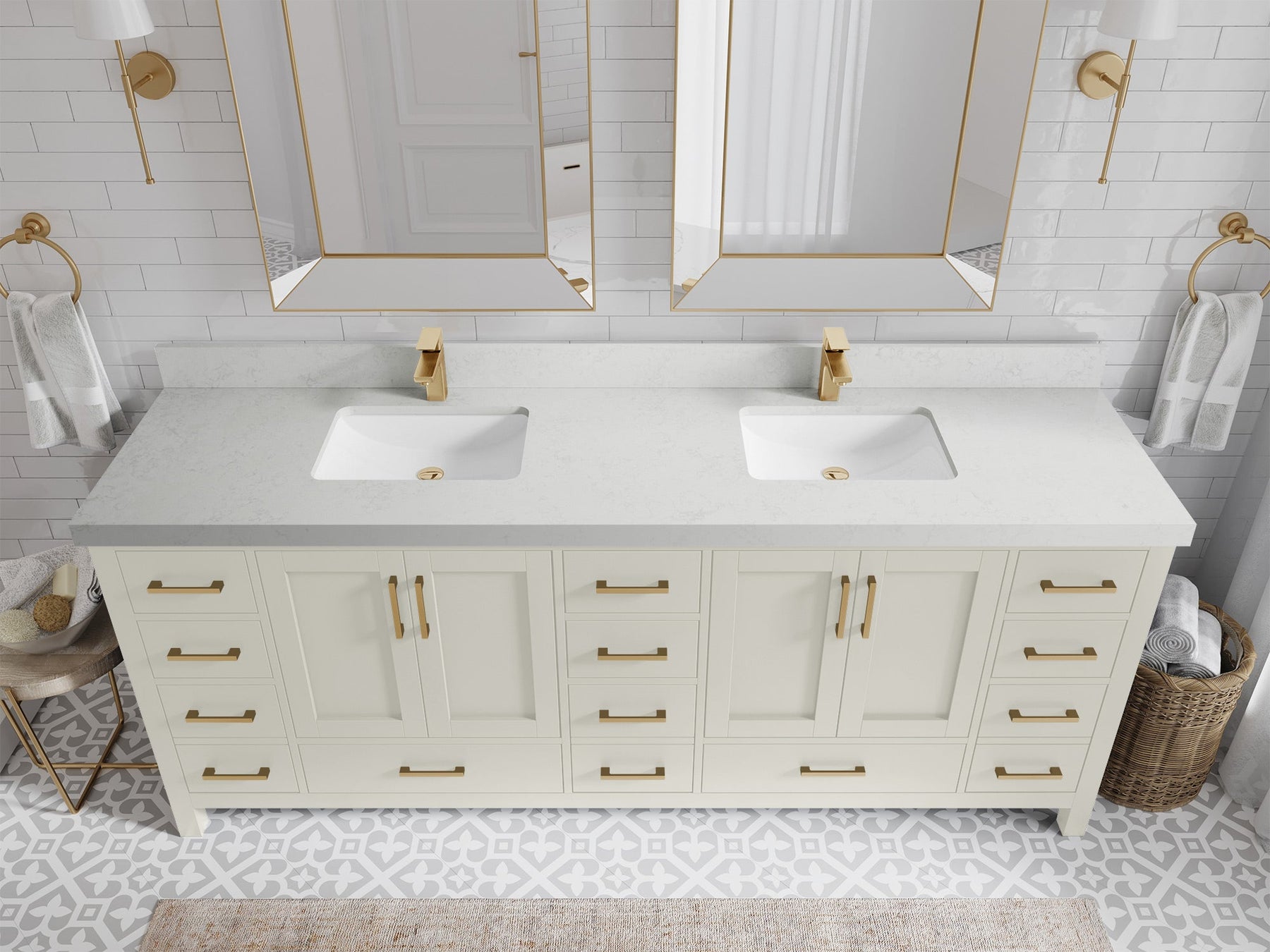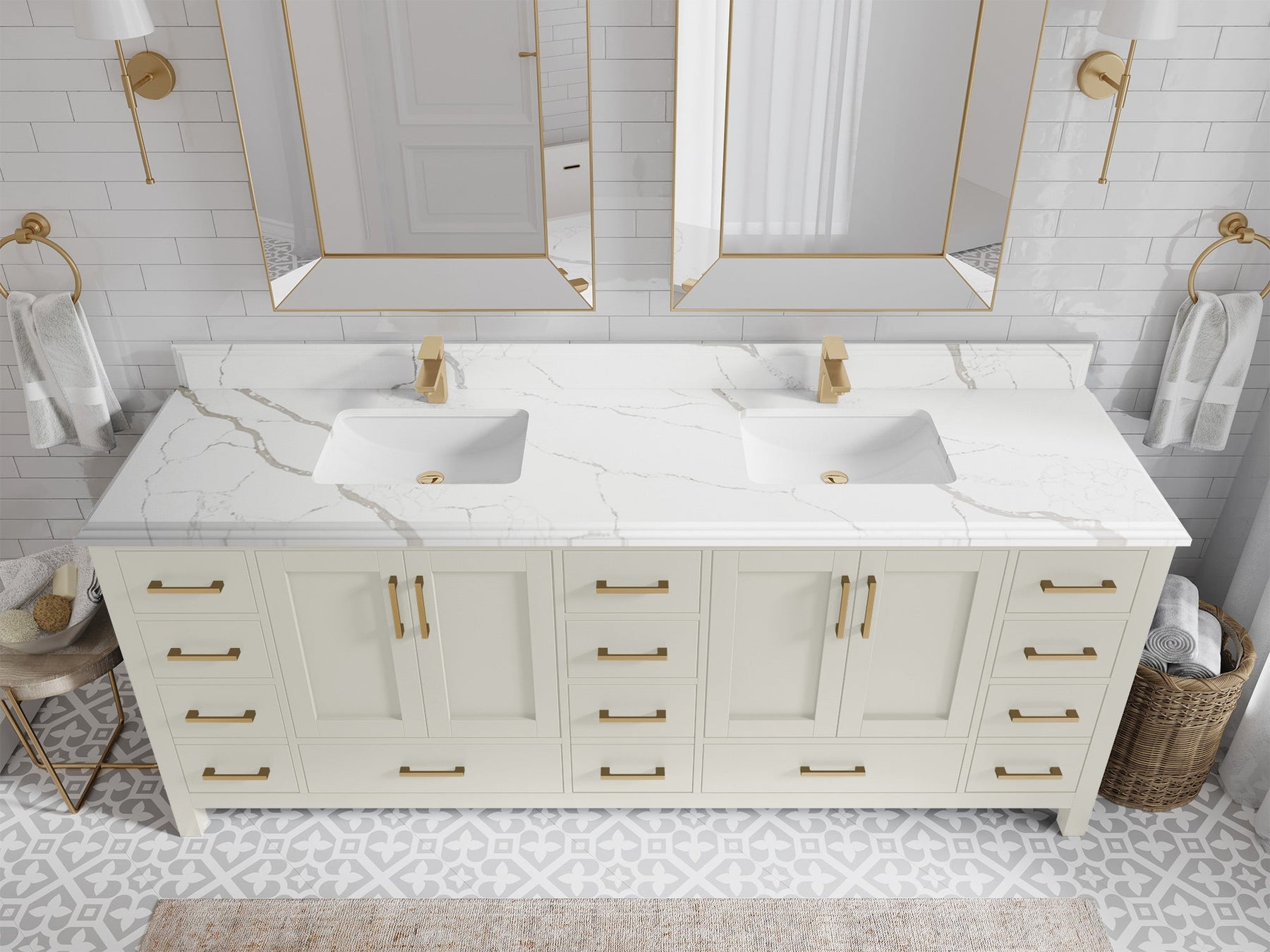 1. Traditional style with a modern twist - made from birch tree and plywood, this bathroom vanity features a clean, contemporary design with soft-close hardware and gold and nickel brushed hardware.