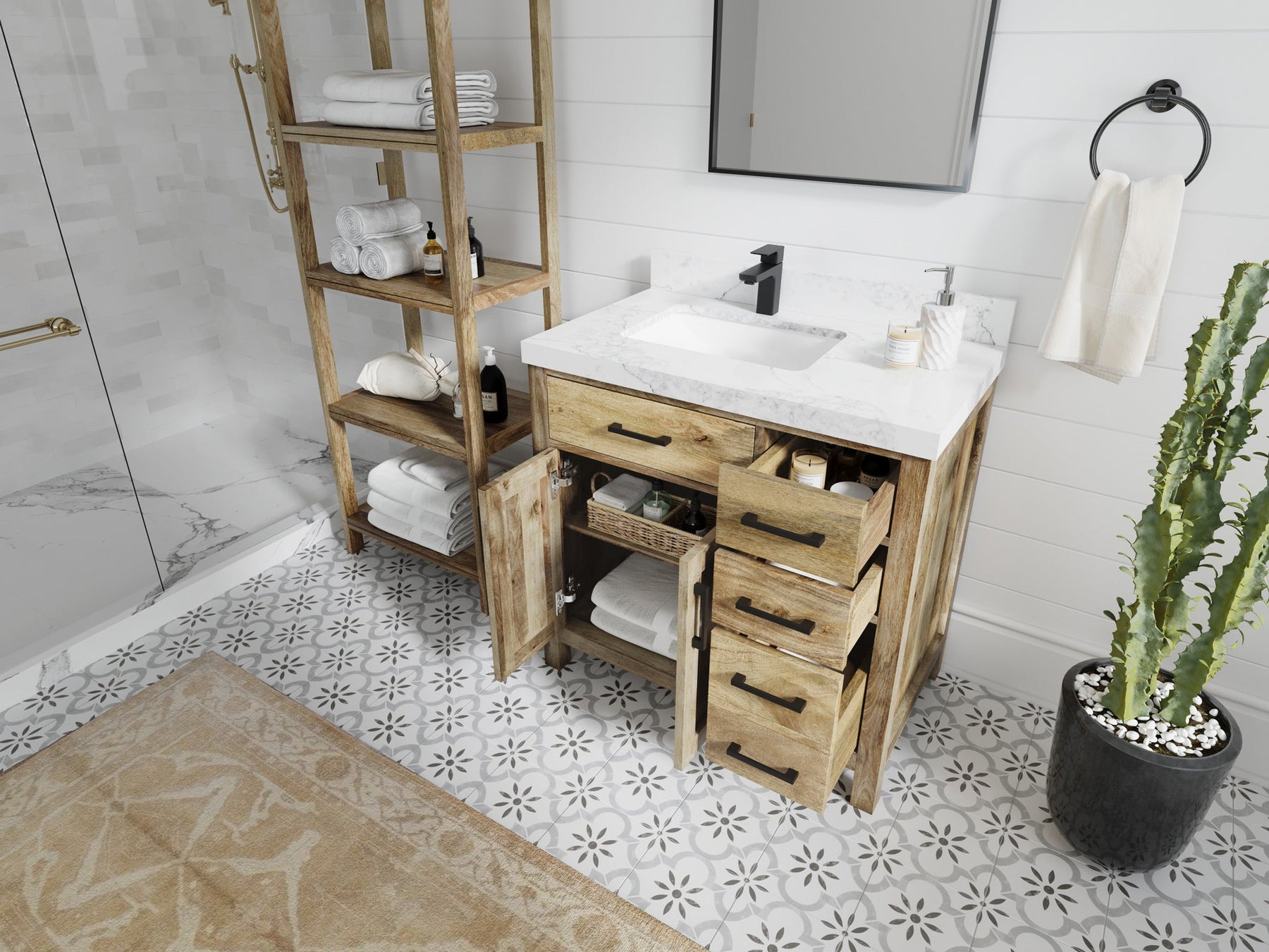 1. Sleek & Minimalist - made from Mango Wood, this vanity features sleek and minimalist design creates a modern and uncluttered look in the bathroom.
