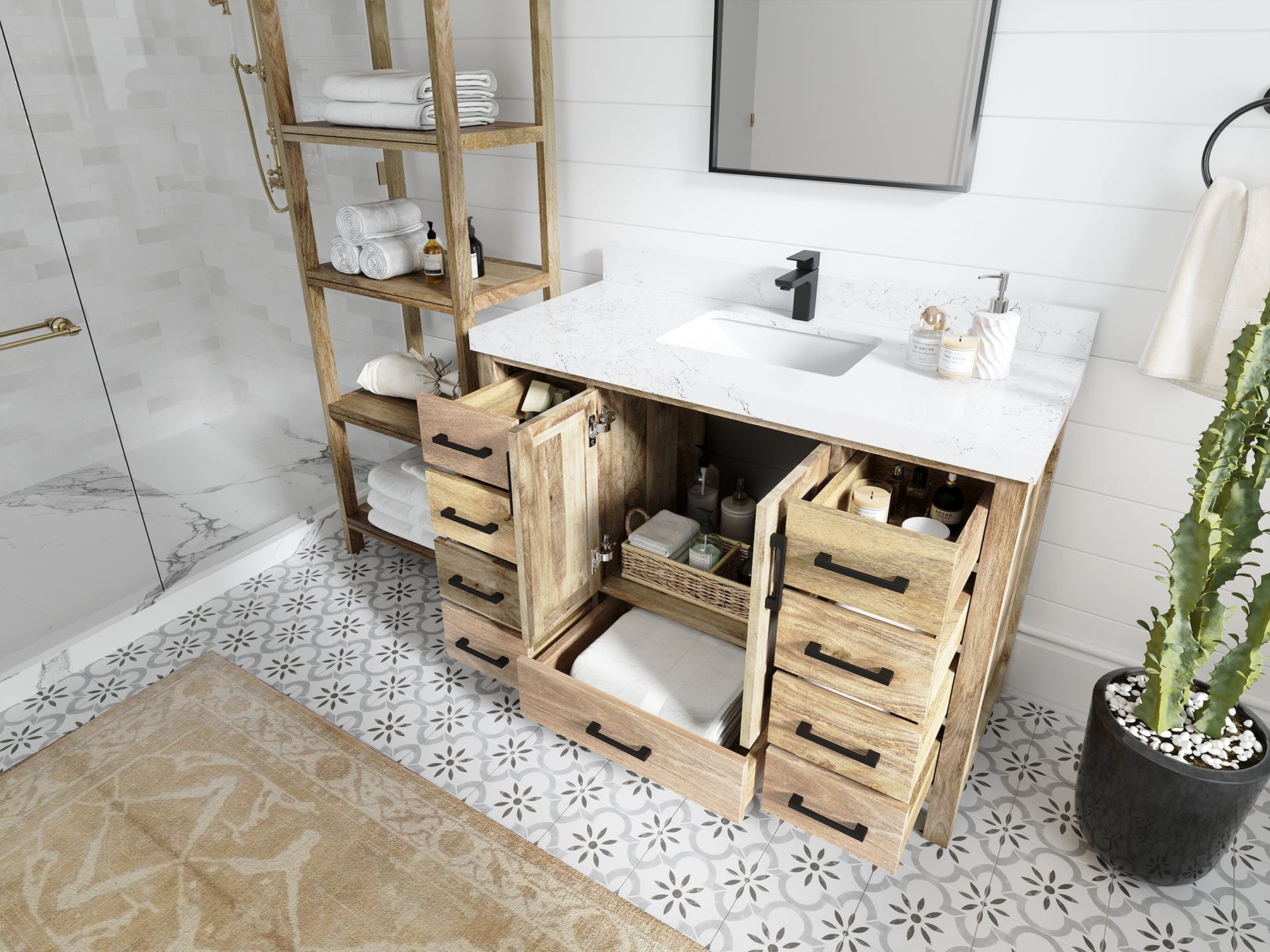 1. Sleek & Minimalist - made from Mango Wood, this vanity features sleek and minimalist design creates a modern and uncluttered look in the bathroom.