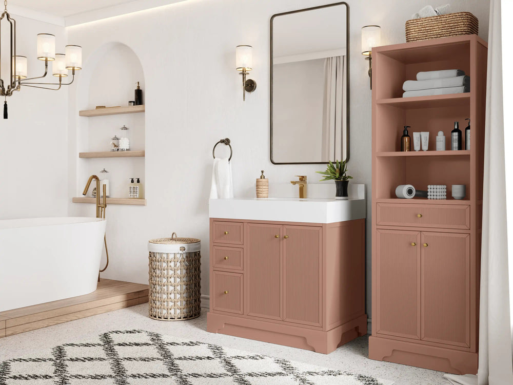 Vanity Countertops options: Straight edge (Calacatta Laza Quartz, Calacatta Nuvo Quartz, Arabescato Marble, Carrara Quartz, Empira White Quartz, Palissandro Quartz, White Quartz, Terrazzo Arctic Breeze, Terrazzo Golden Dusk)