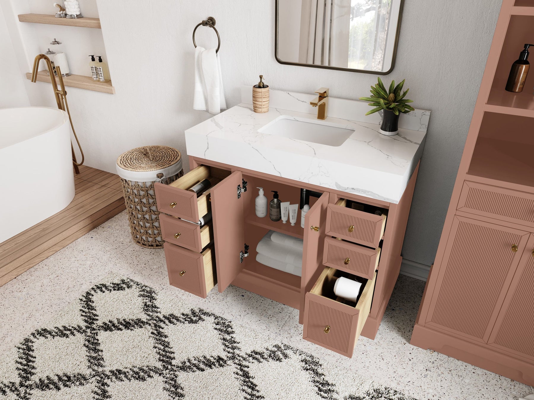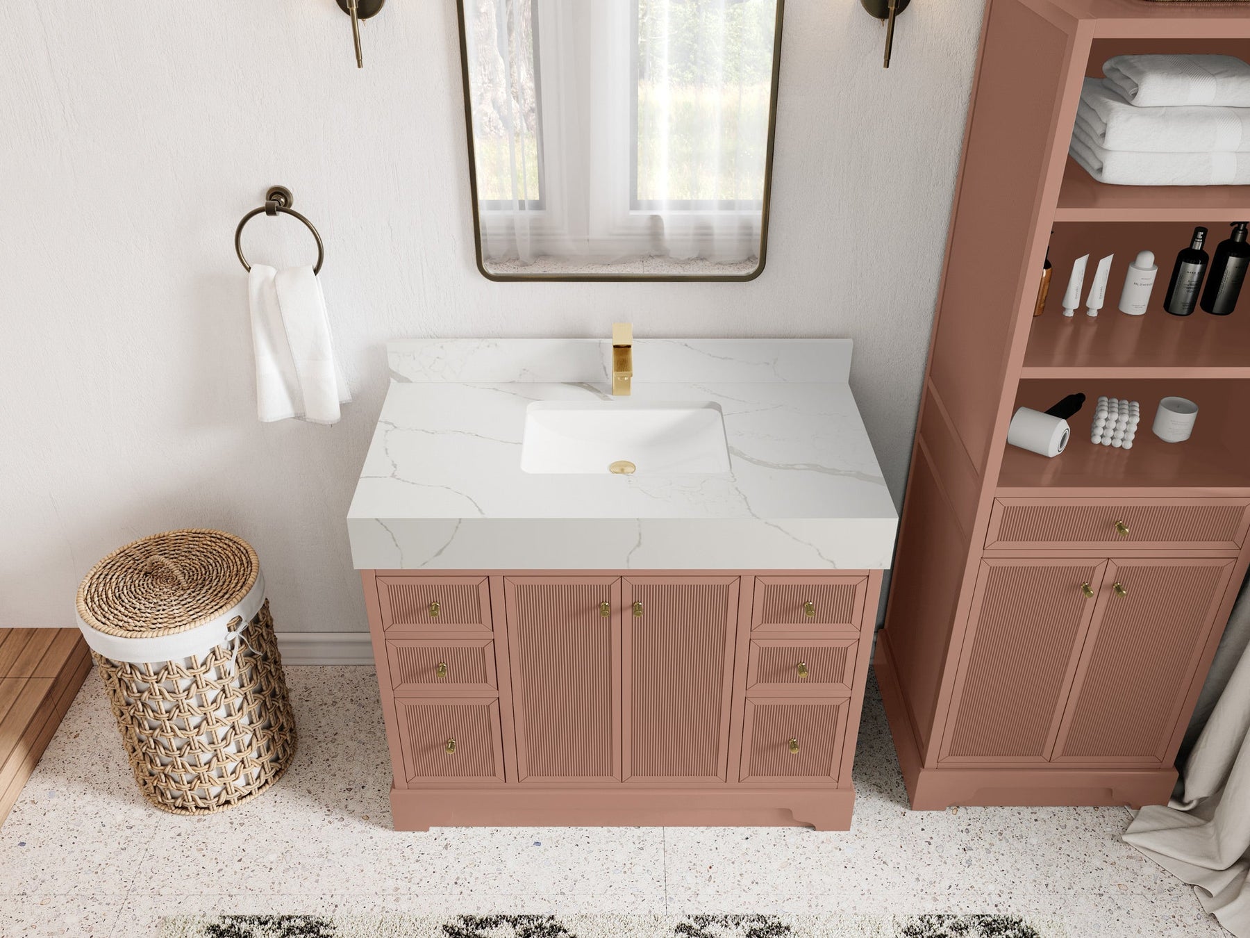 Vanity Countertops options: Straight edge (Calacatta Laza Quartz, Calacatta Nuvo Quartz, Arabescato Marble, Carrara Quartz, Empira White Quartz, Palissandro Quartz, White Quartz, Terrazzo Arctic Breeze, Terrazzo Golden Dusk)