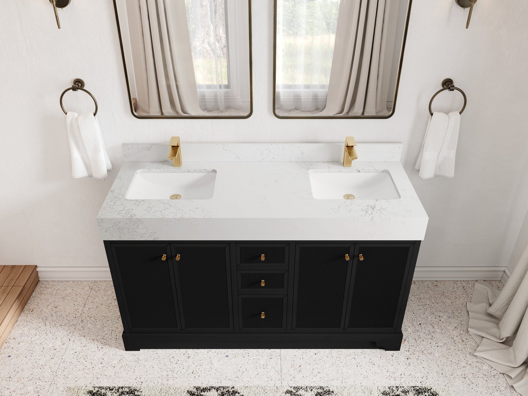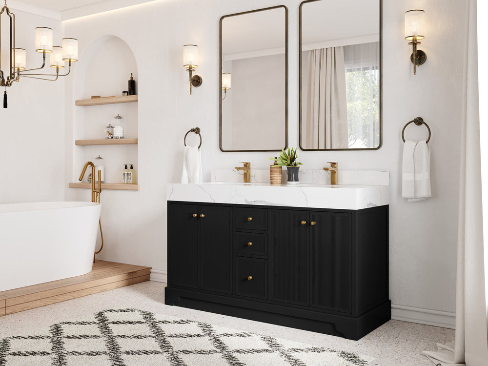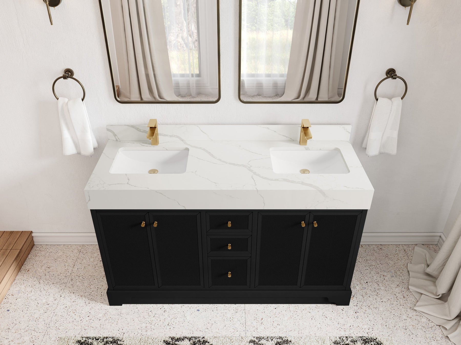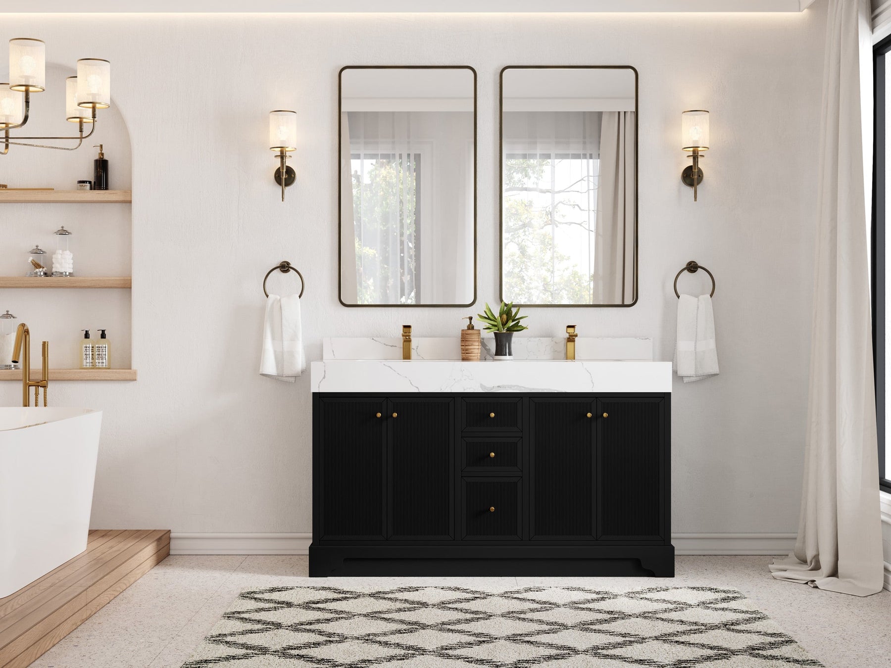 Vanity Countertops options: Straight edge (Calacatta Laza Quartz, Calacatta Nuvo Quartz, Arabescato Marble, Carrara Quartz, Empira White Quartz, Palissandro Quartz, White Quartz, Terrazzo Arctic Breeze, Terrazzo Golden Dusk)