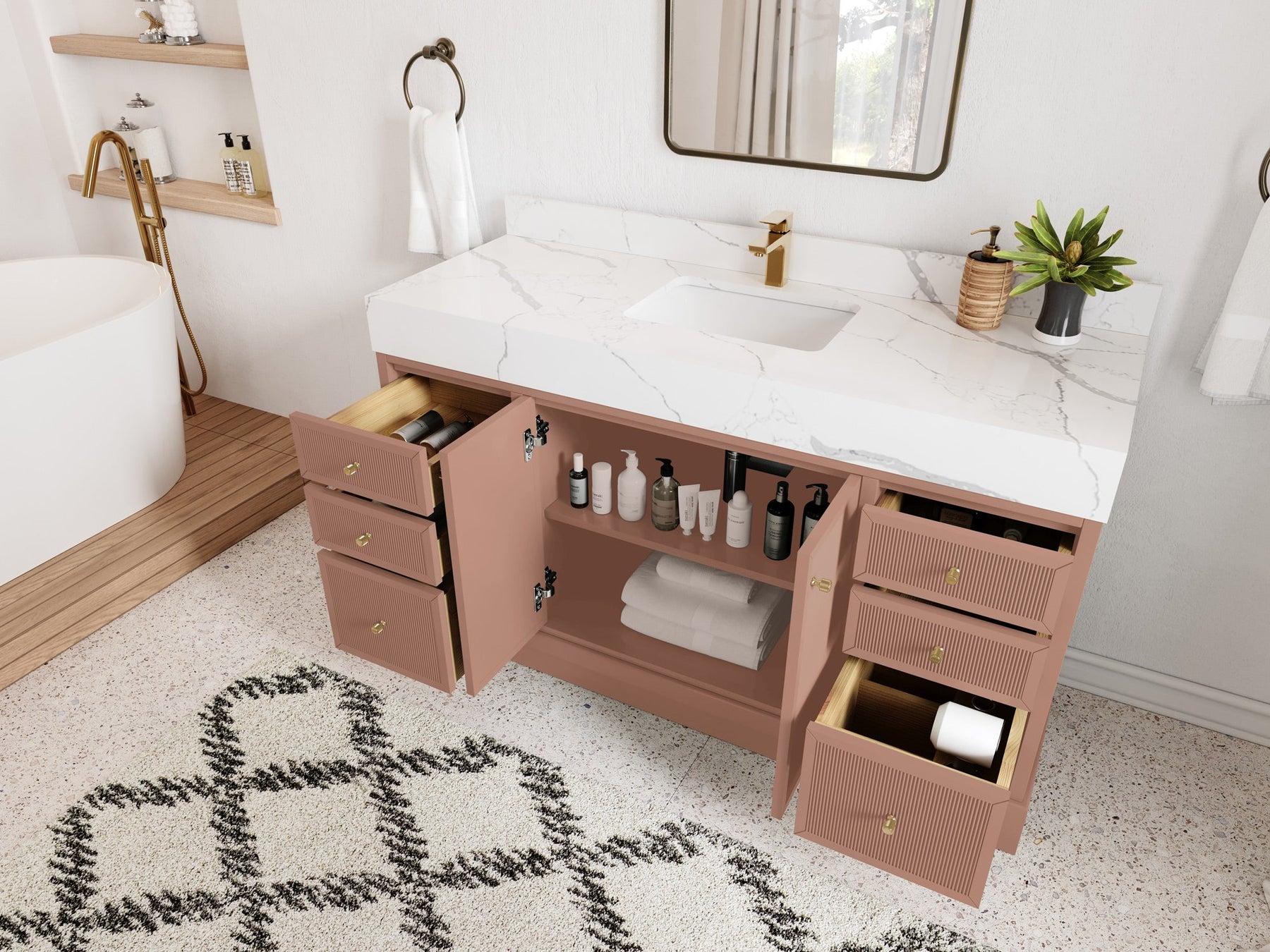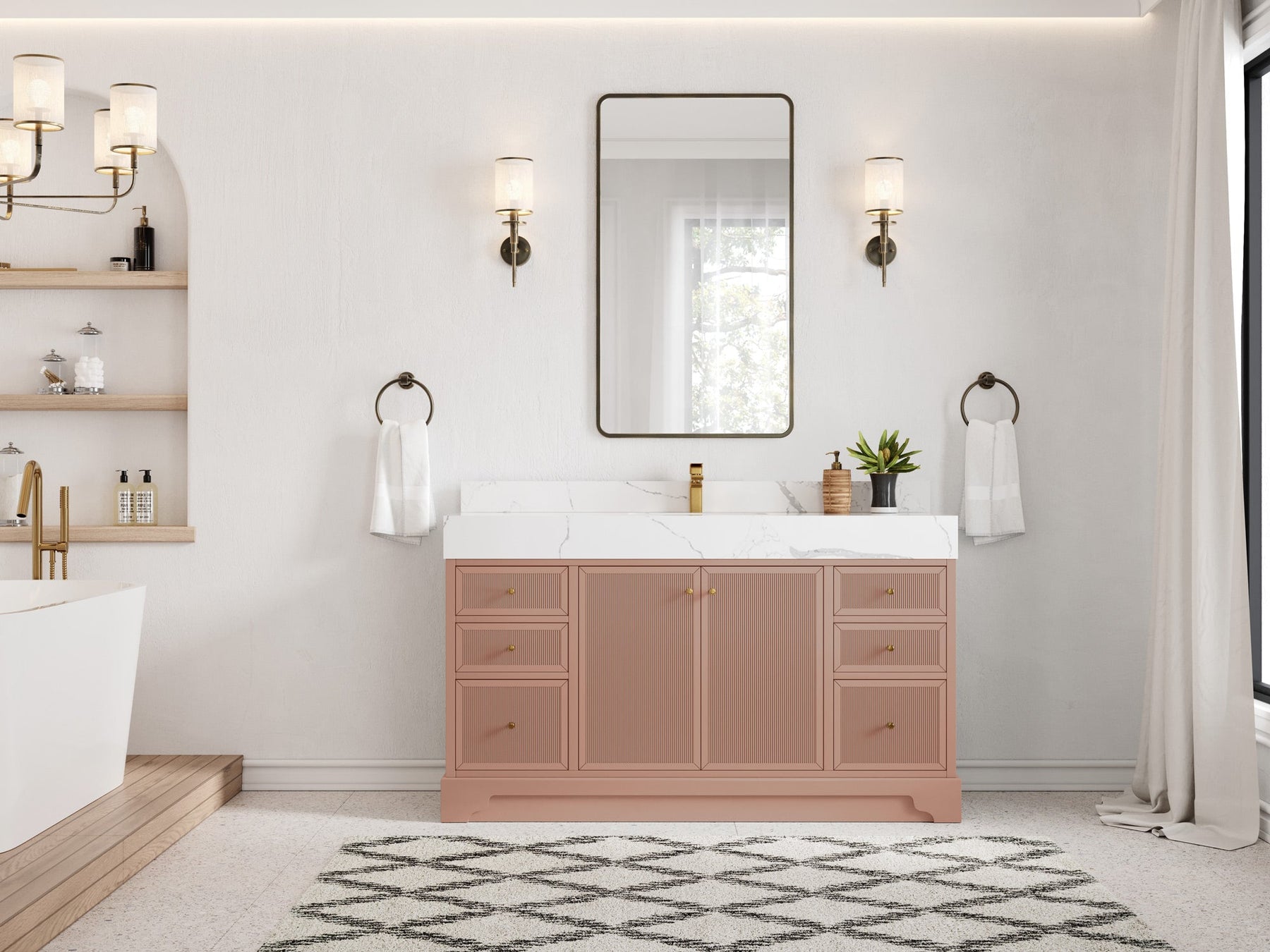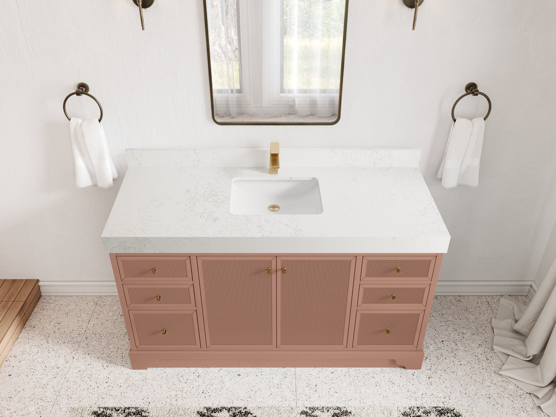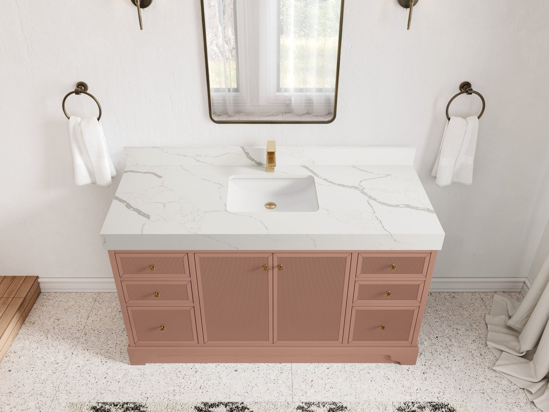 Vanity Countertops options: Straight edge (Calacatta Laza Quartz, Calacatta Nuvo Quartz, Arabescato Marble, Carrara Quartz, Empira White Quartz, Palissandro Quartz, White Quartz, Terrazzo Arctic Breeze, Terrazzo Golden Dusk)