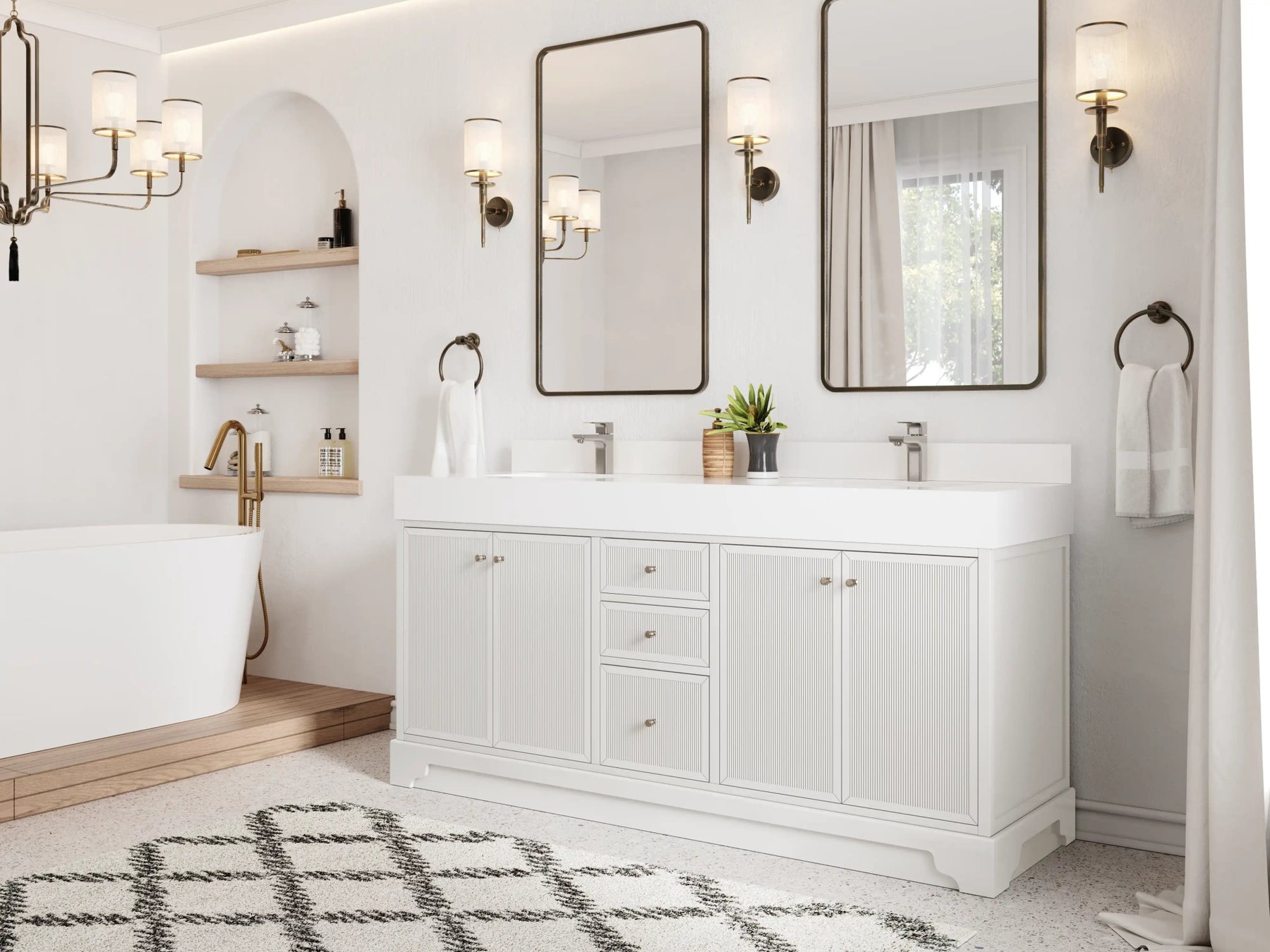 Vanity Countertops options: Straight edge (Calacatta Laza Quartz, Calacatta Nuvo Quartz, Arabescato Marble, Carrara Quartz, Empira White Quartz, Palissandro Quartz, White Quartz, Terrazzo Arctic Breeze, Terrazzo Golden Dusk)