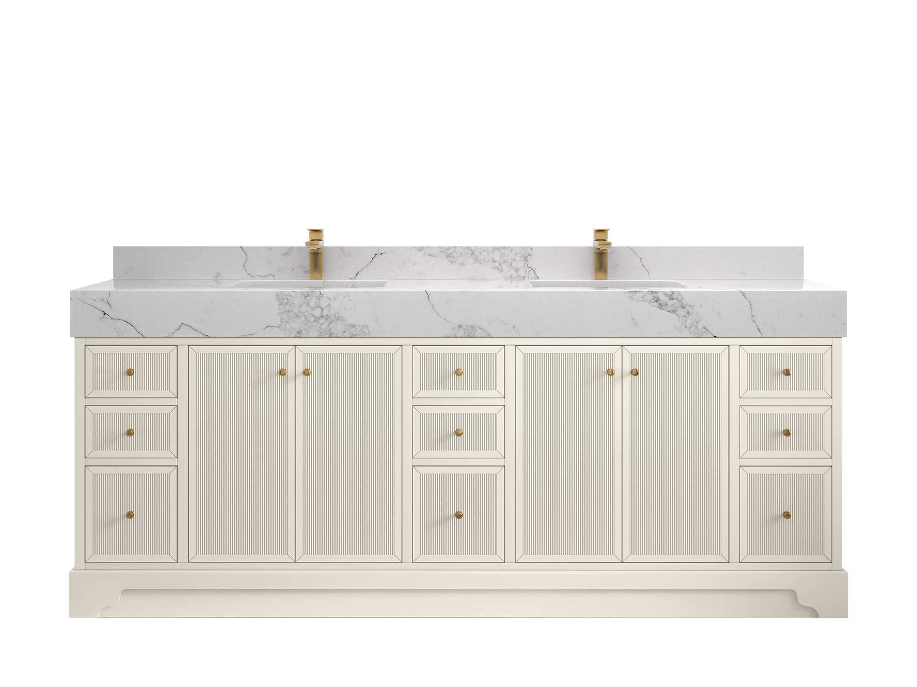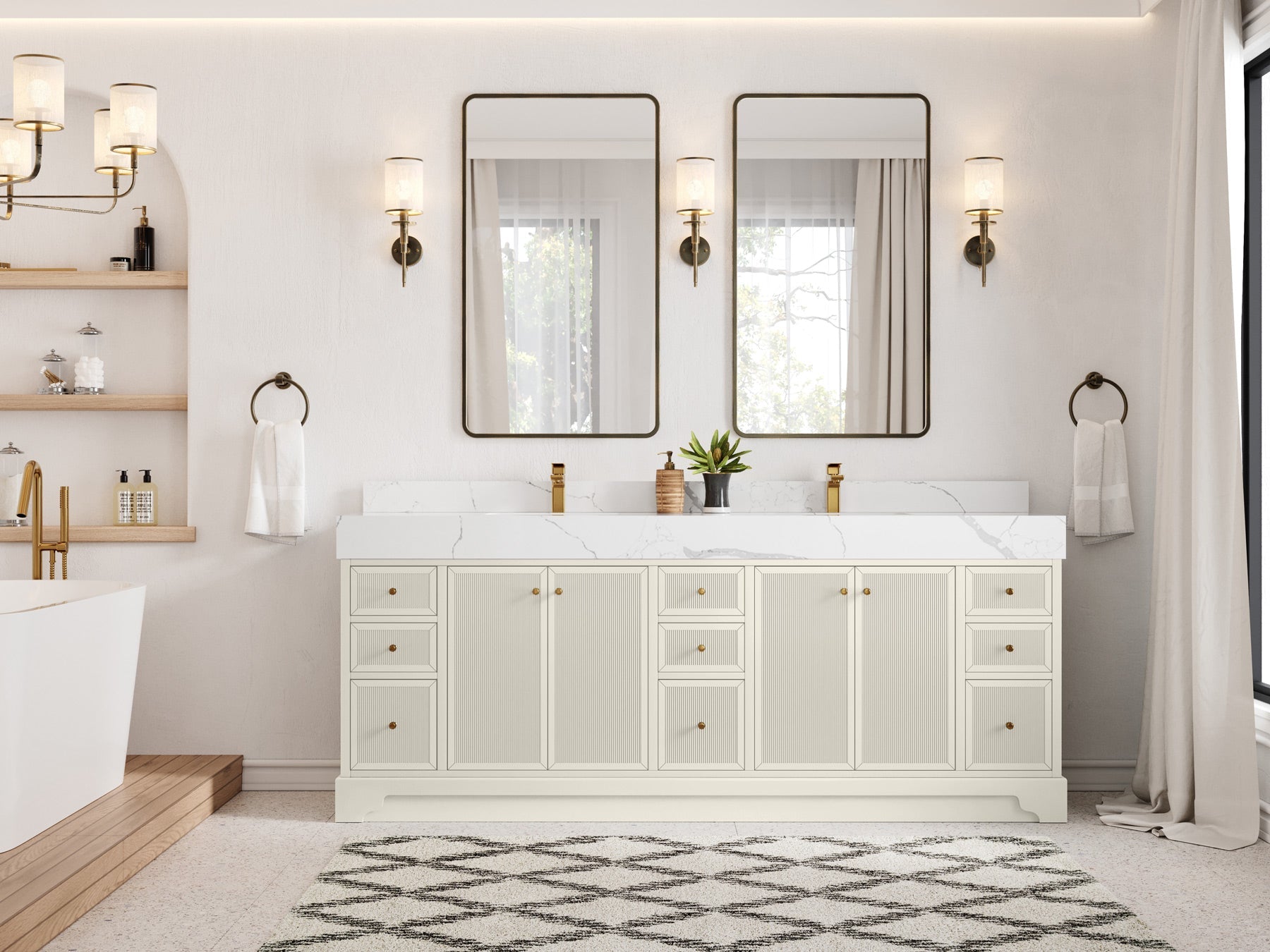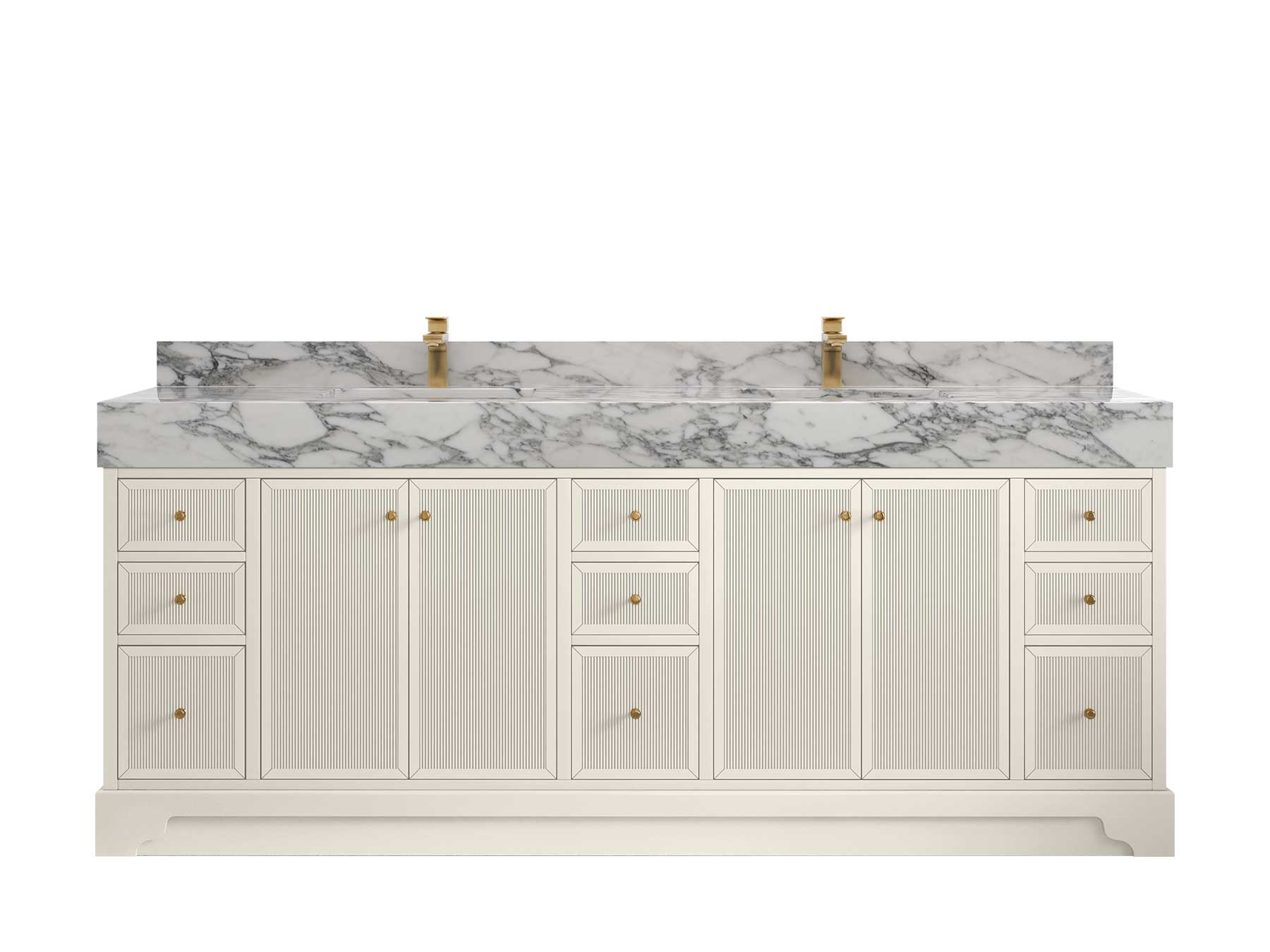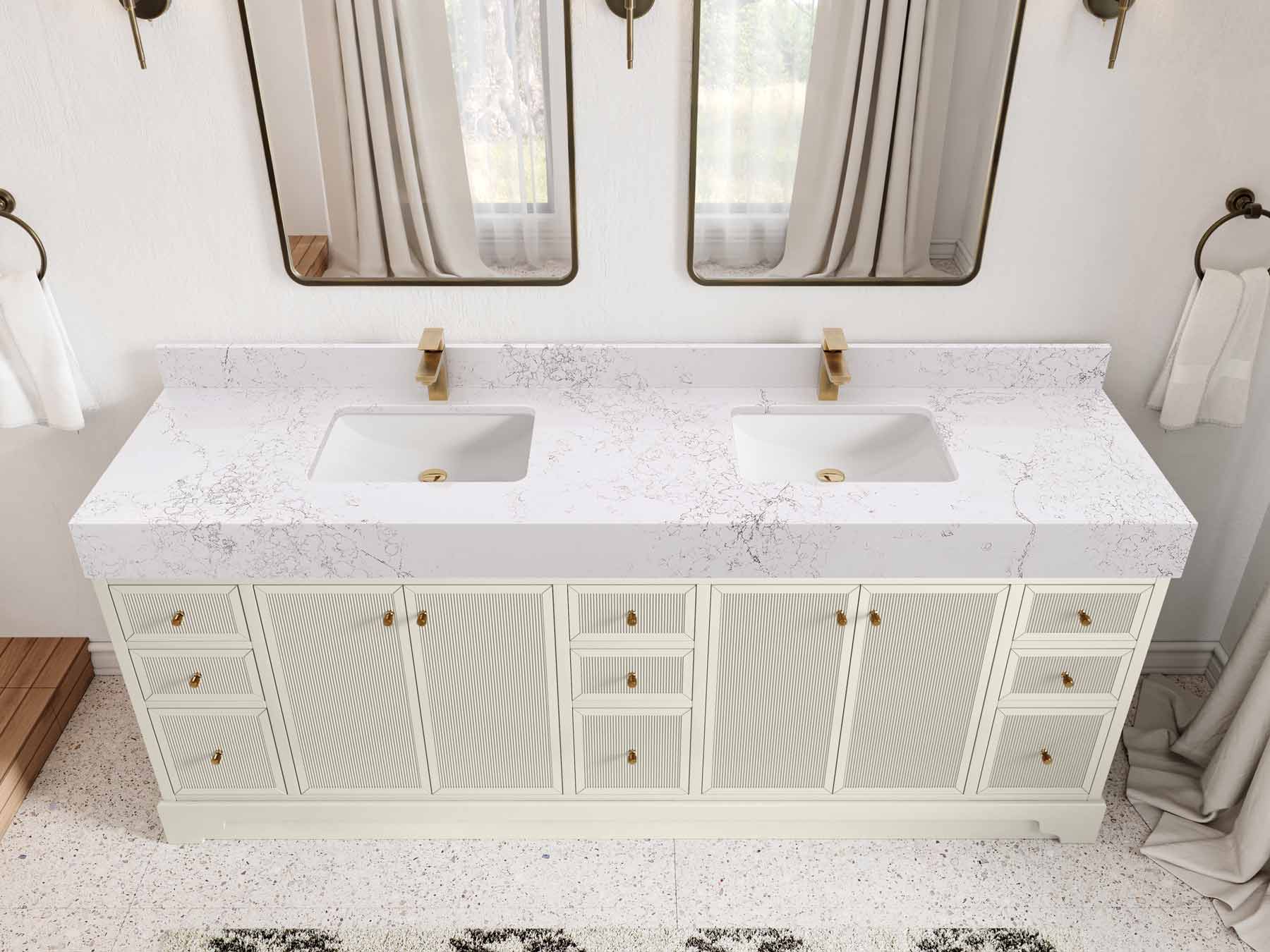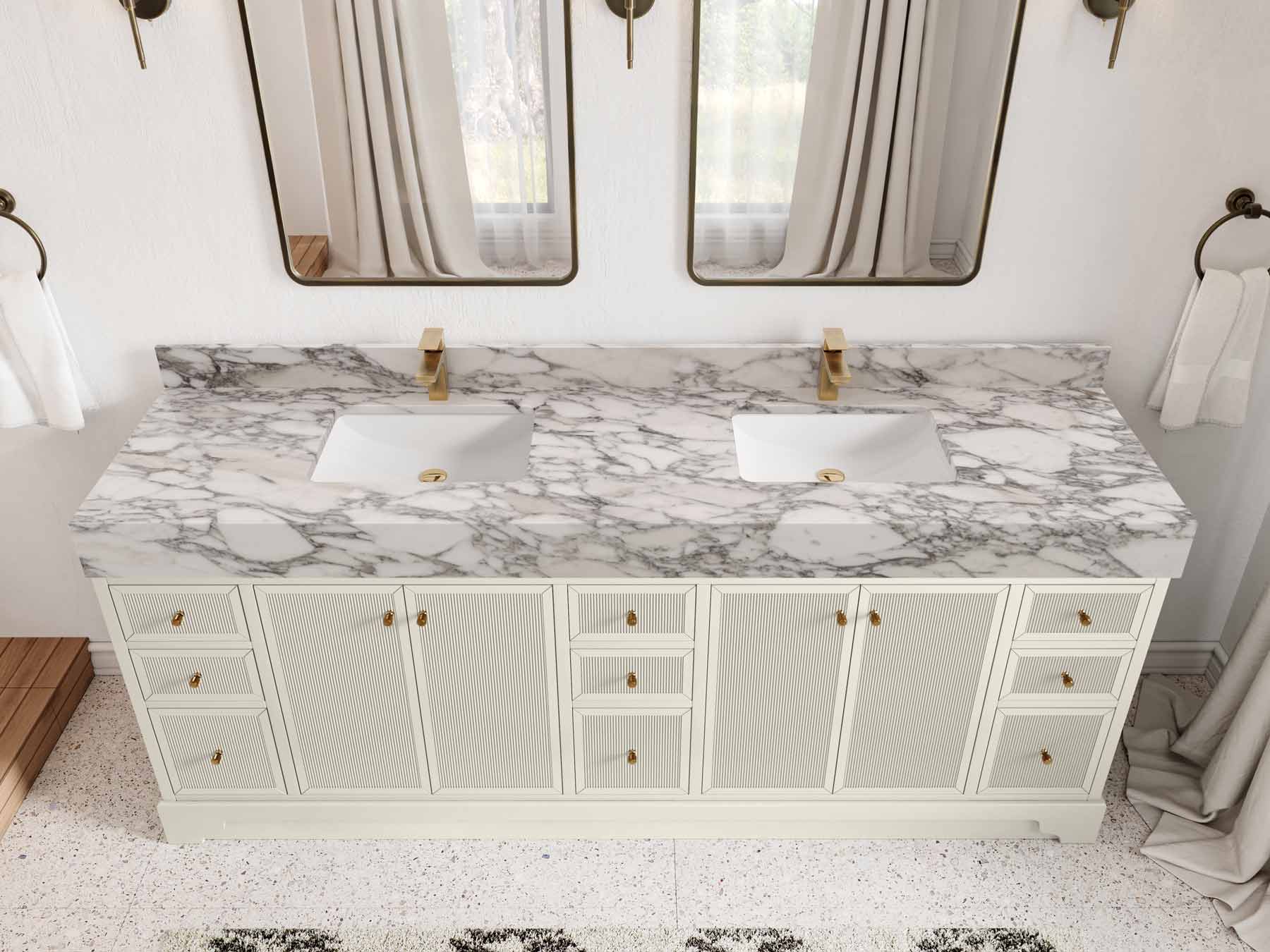 Vanity Countertops options: Straight edge (Calacatta Laza Quartz, Calacatta Nuvo Quartz, Arabescato Marble, Carrara Quartz, Empira White Quartz, Palissandro Quartz, White Quartz, Terrazzo Arctic Breeze, Terrazzo Golden Dusk)