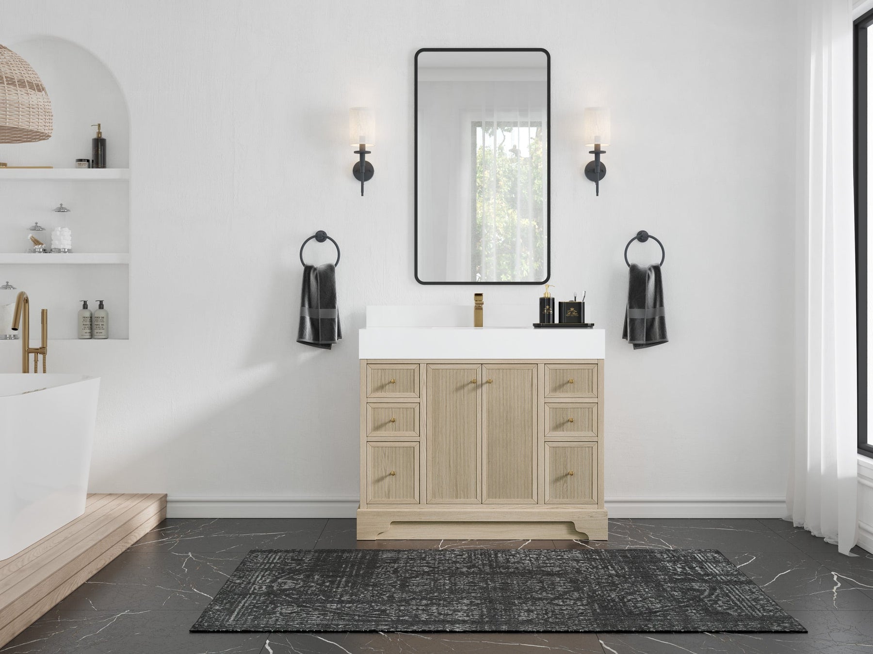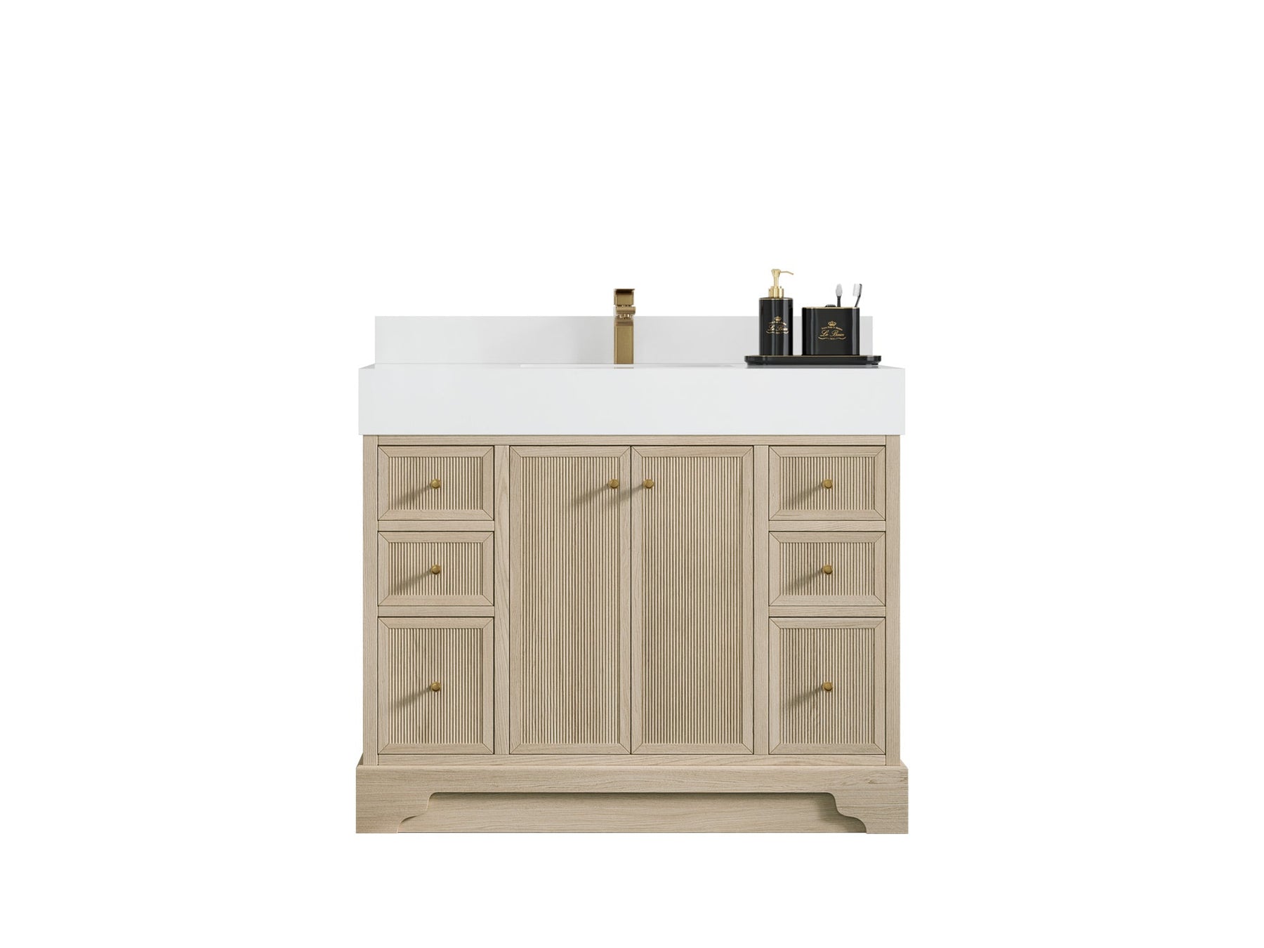 The Manhattan Collection is a modern and stylish addition to any bathroom. It is made from white oak wood and plywood, a strong and durable material that will last for years to come. The reeded design adds a sophisticated touch to the vanity, making it a statement piece in any bathroom. The thick countertop adds an extra layer of strength and durability, making it perfect for a busy bathroom. The white oak wood gives the vanity a clean, contemporary look that will complement any modern bathroom decor. The spacious countertop provides plenty of space for all of your bathroom essentials, and the deep drawer with built-in power station and organizer allows you to keep everything organized and easily accessible. The power station and organizer feature outlets and USB ports to charge your devices, as well as compartments for organizing your personal items. The strong and sturdy construction of this vanity makes it a reliable and functional addition to any bathroom.