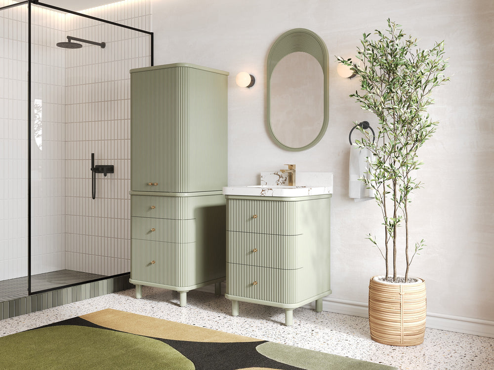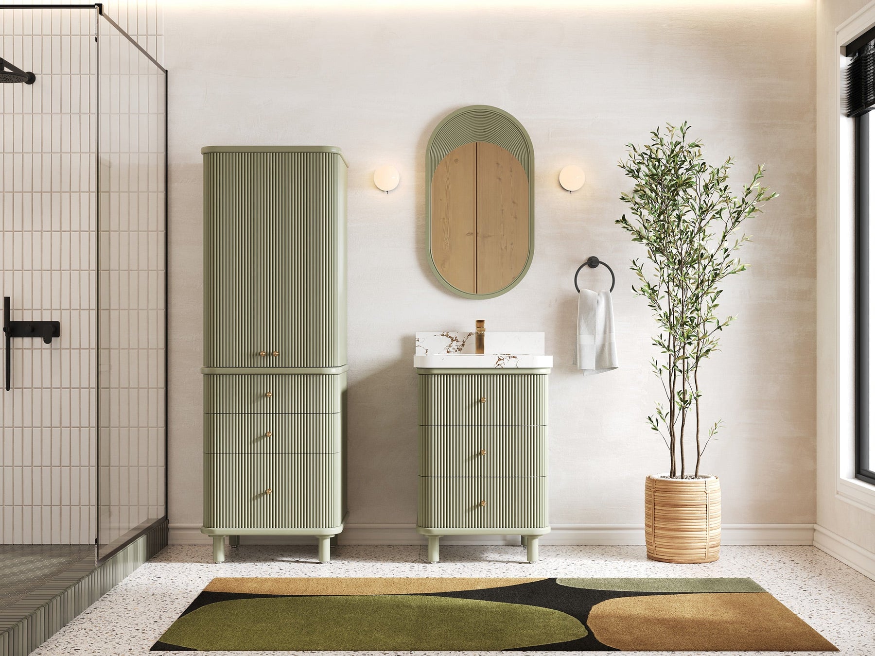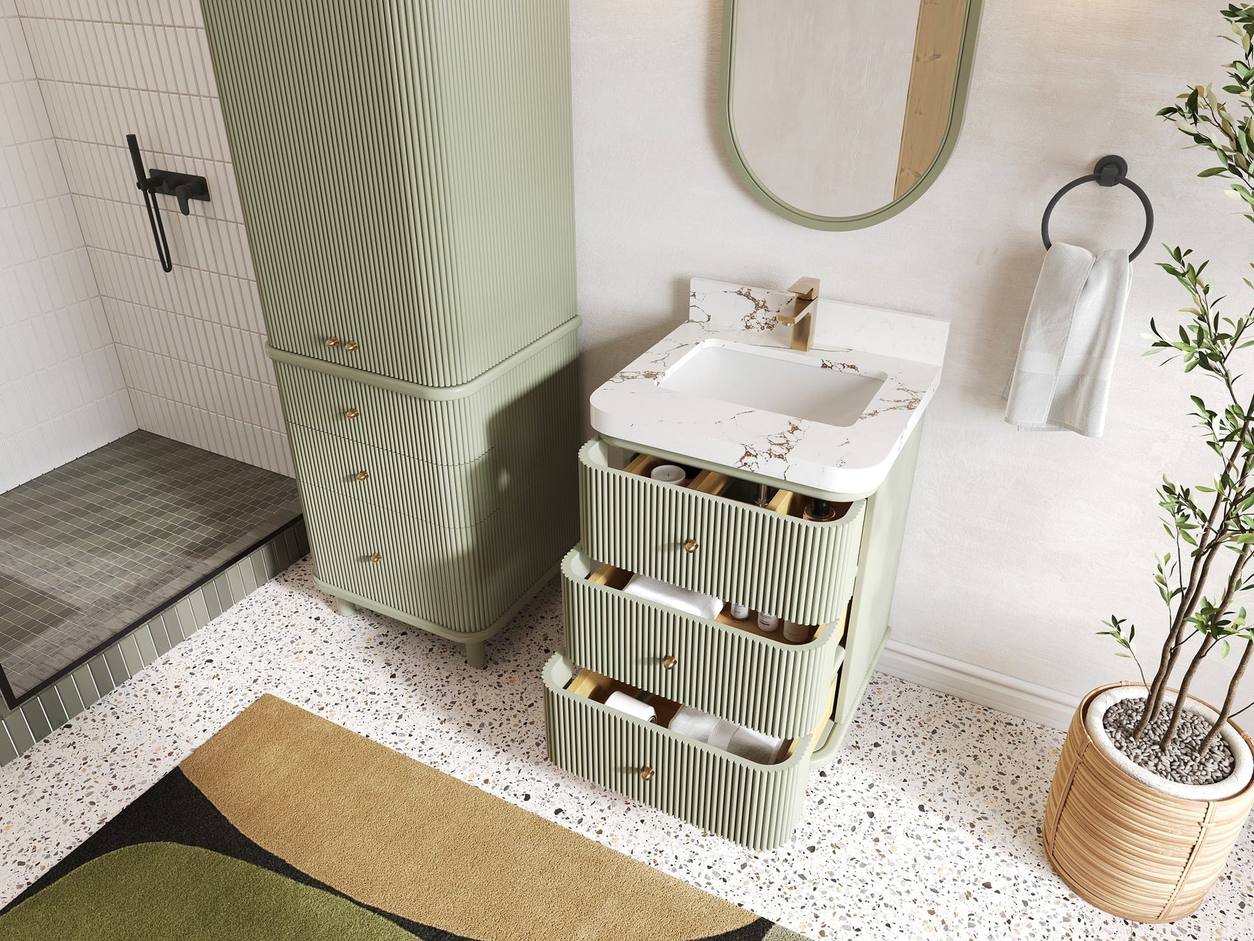 The Miami Vanity is an elegant centerpiece inspired by Miami’s iconic blend of contemporary flair and classic Art Deco charm. Featuring striking fluted detailing, softly rounded edges, and sleek, modern legs, this vanity delivers a luxurious yet approachable style. Its thoughtfully designed interior includes practical organizers and an integrated power station, making everyday routines effortlessly organized. Available in various sizes, beautiful color choices, and countertop materials like quartz, marble, quartzite, or terrazzo, the Miami Vanity easily adapts to your personal aesthetic. Complete with spacious soft-close drawers and premium hardware, this vanity brings functionality, refined design, and exceptional quality to your bathroom space.