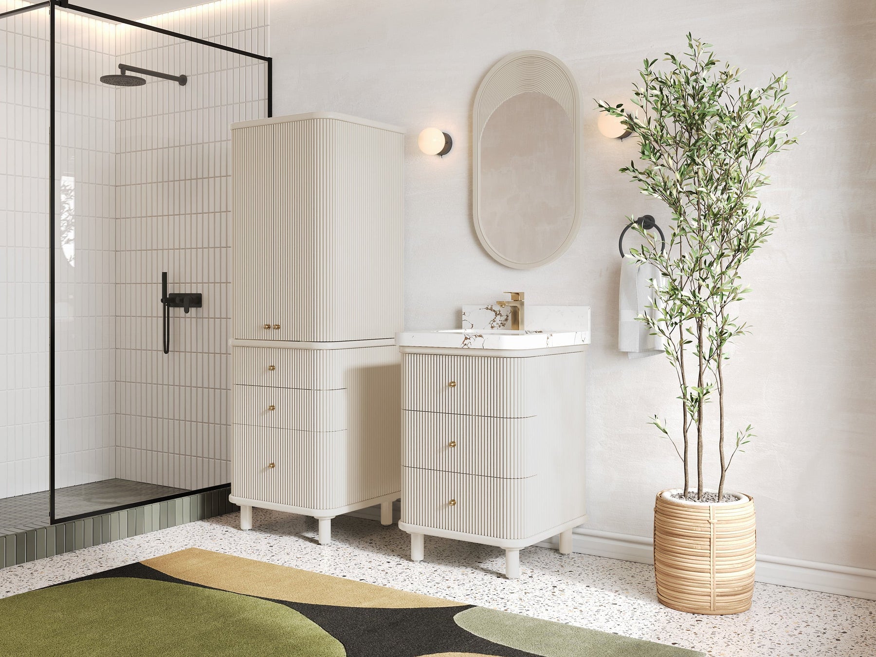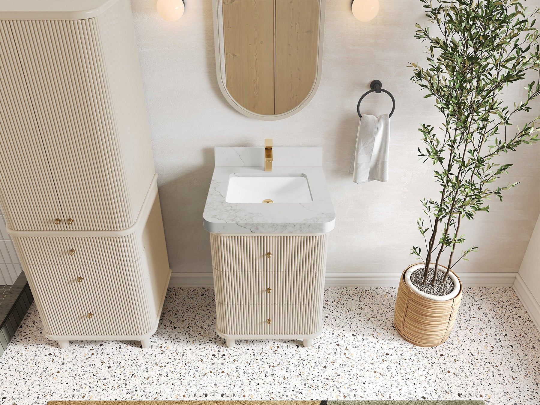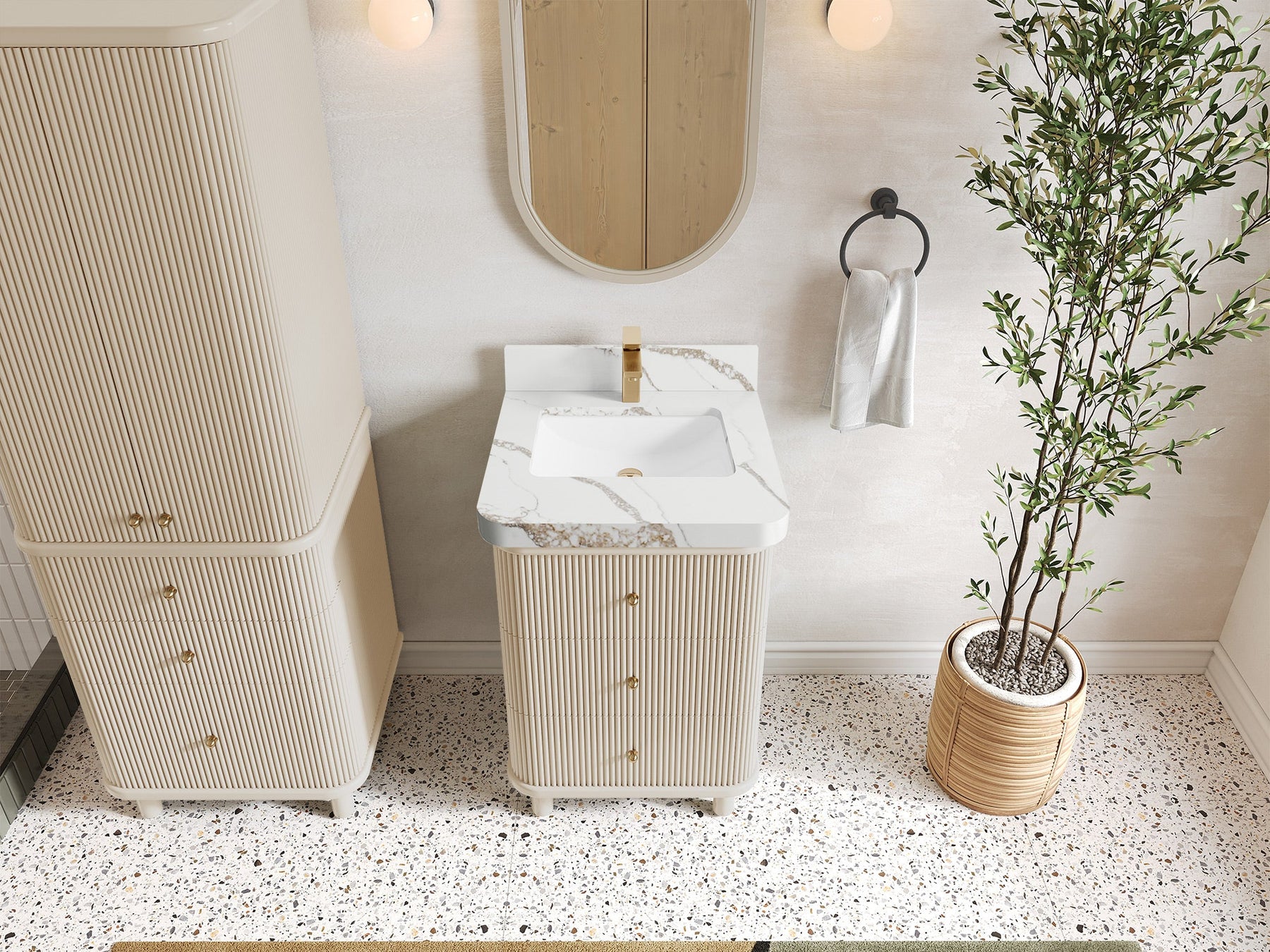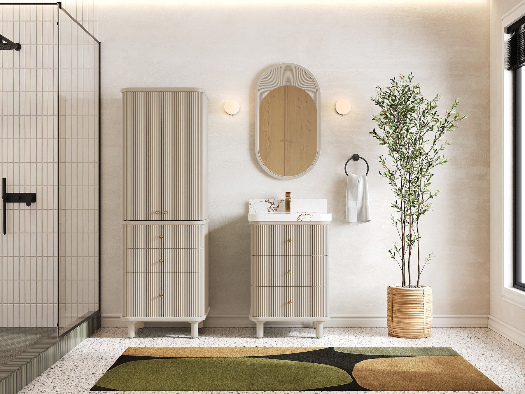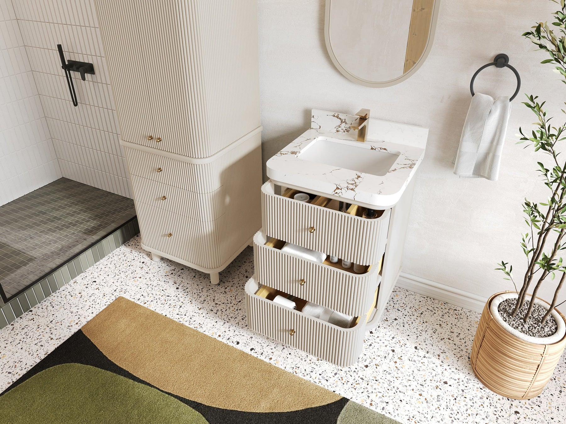 The Miami Vanity is an elegant centerpiece inspired by Miami’s iconic blend of contemporary flair and classic Art Deco charm. Featuring striking fluted detailing, softly rounded edges, and sleek, modern legs, this vanity delivers a luxurious yet approachable style. Its thoughtfully designed interior includes practical organizers and an integrated power station, making everyday routines effortlessly organized. Available in various sizes, beautiful color choices, and countertop materials like quartz, marble, quartzite, or terrazzo, the Miami Vanity easily adapts to your personal aesthetic. Complete with spacious soft-close drawers and premium hardware, this vanity brings functionality, refined design, and exceptional quality to your bathroom space.