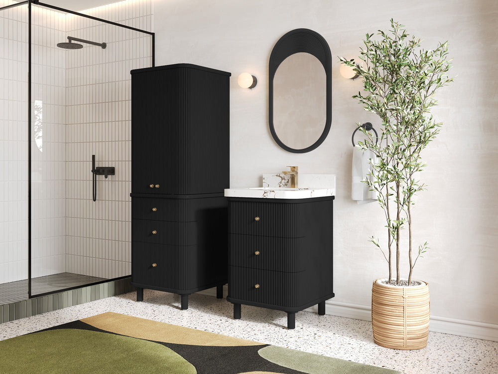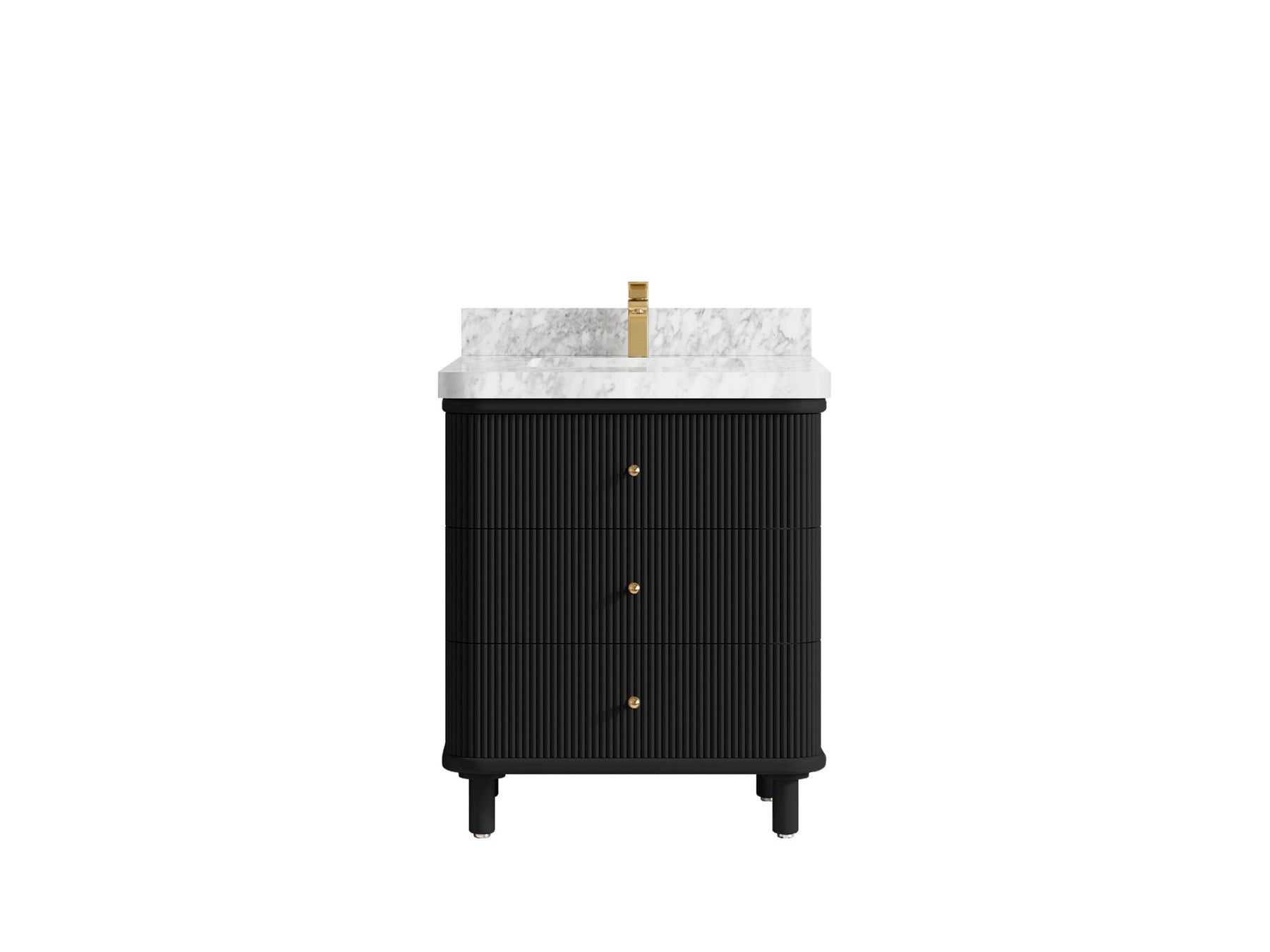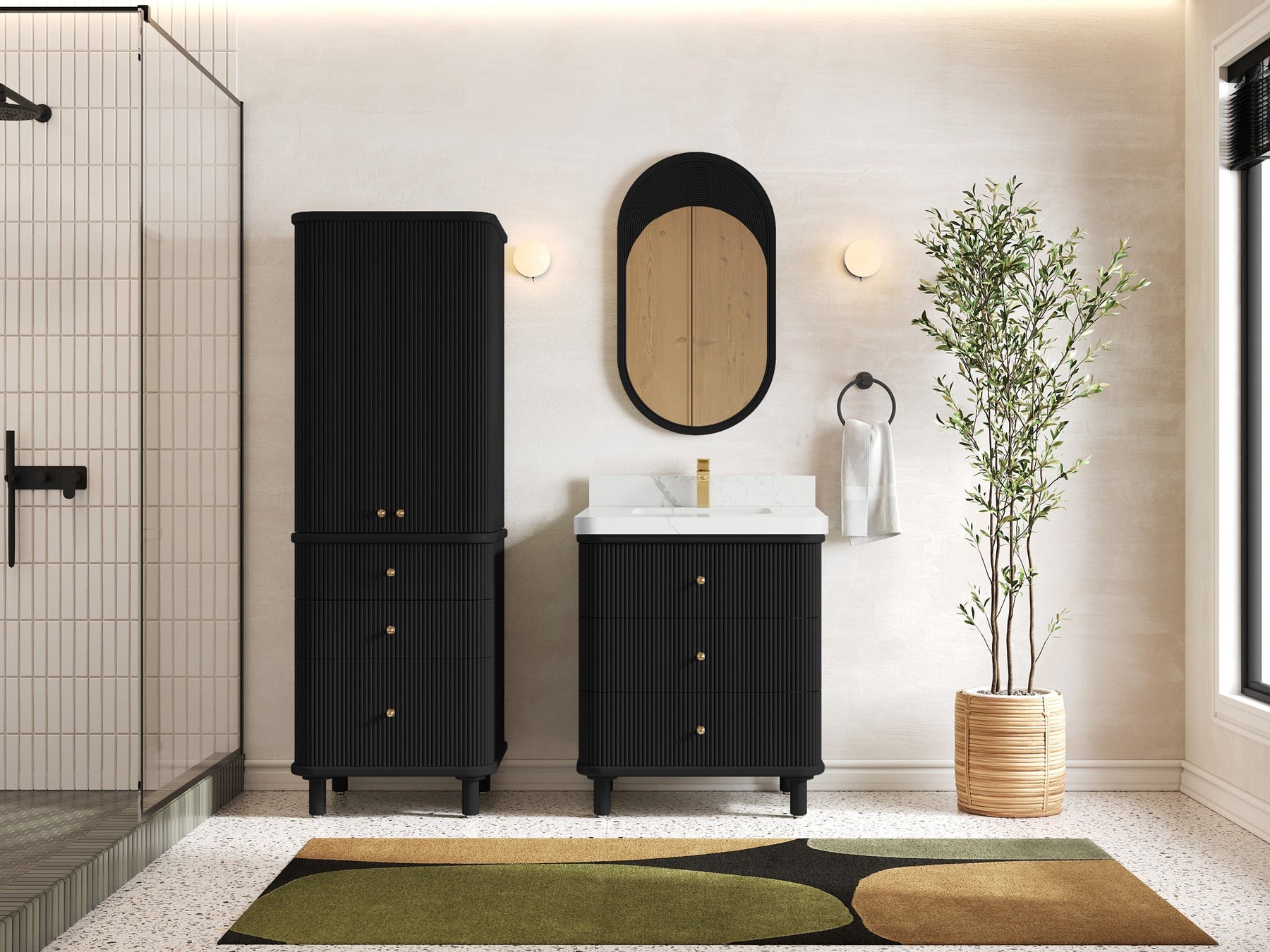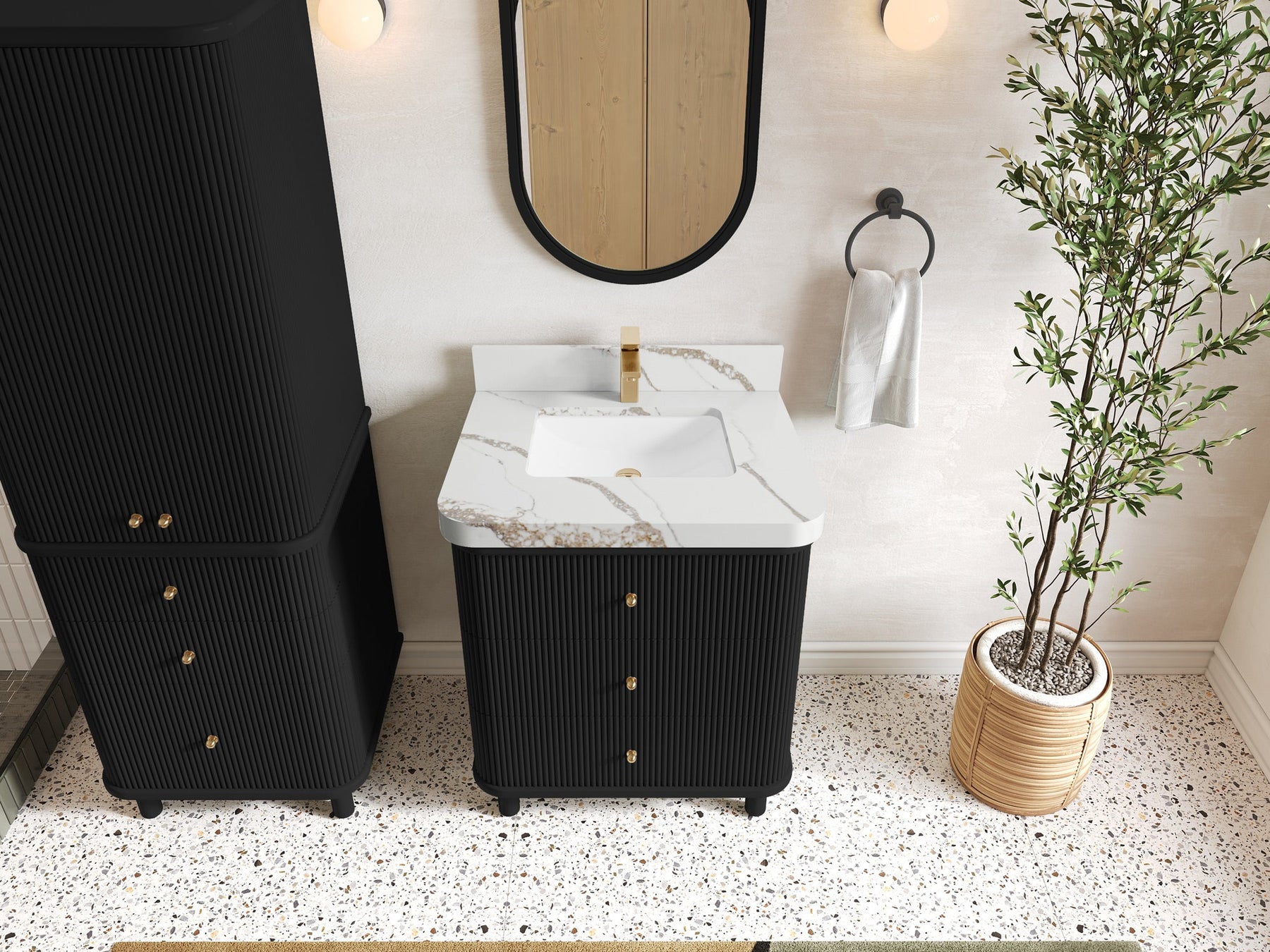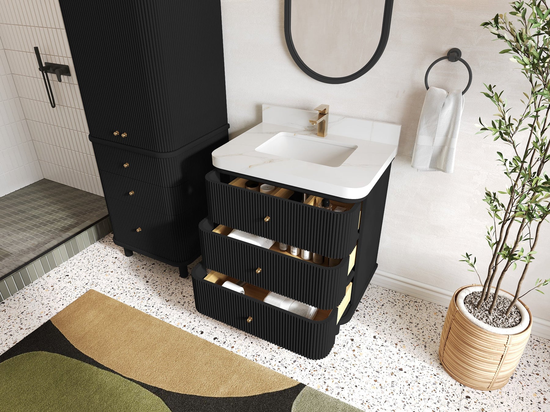 The Miami Vanity is an elegant centerpiece inspired by Miami's iconic blend of contemporary flair and classic Art Deco charm. Featuring striking fluted detailing, softly rounded edges, and sleek, modern legs, this vanity delivers a luxurious yet approachable style. Its thoughtfully designed interior includes practical organizers and an integrated power station, making everyday routines effortlessly organized. Available in various sizes, beautiful color choices, and countertop materials like quartz, marble, quartzite, or terrazzo, the Miami Vanity easily adapts to your personal aesthetic. Complete with spacious soft-close drawers and premium hardware, this vanity brings functionality, refined design, and exceptional quality to your bathroom space.