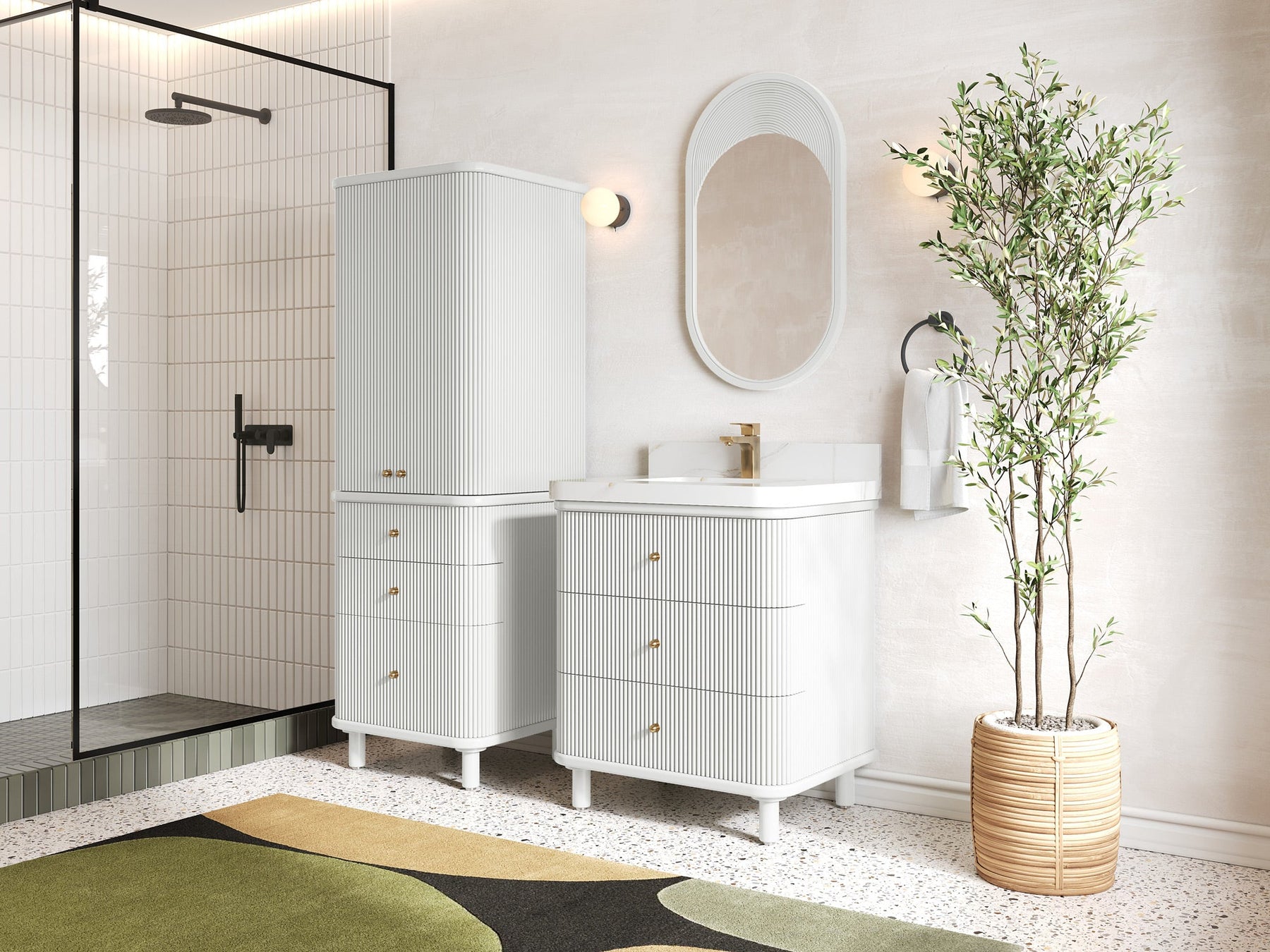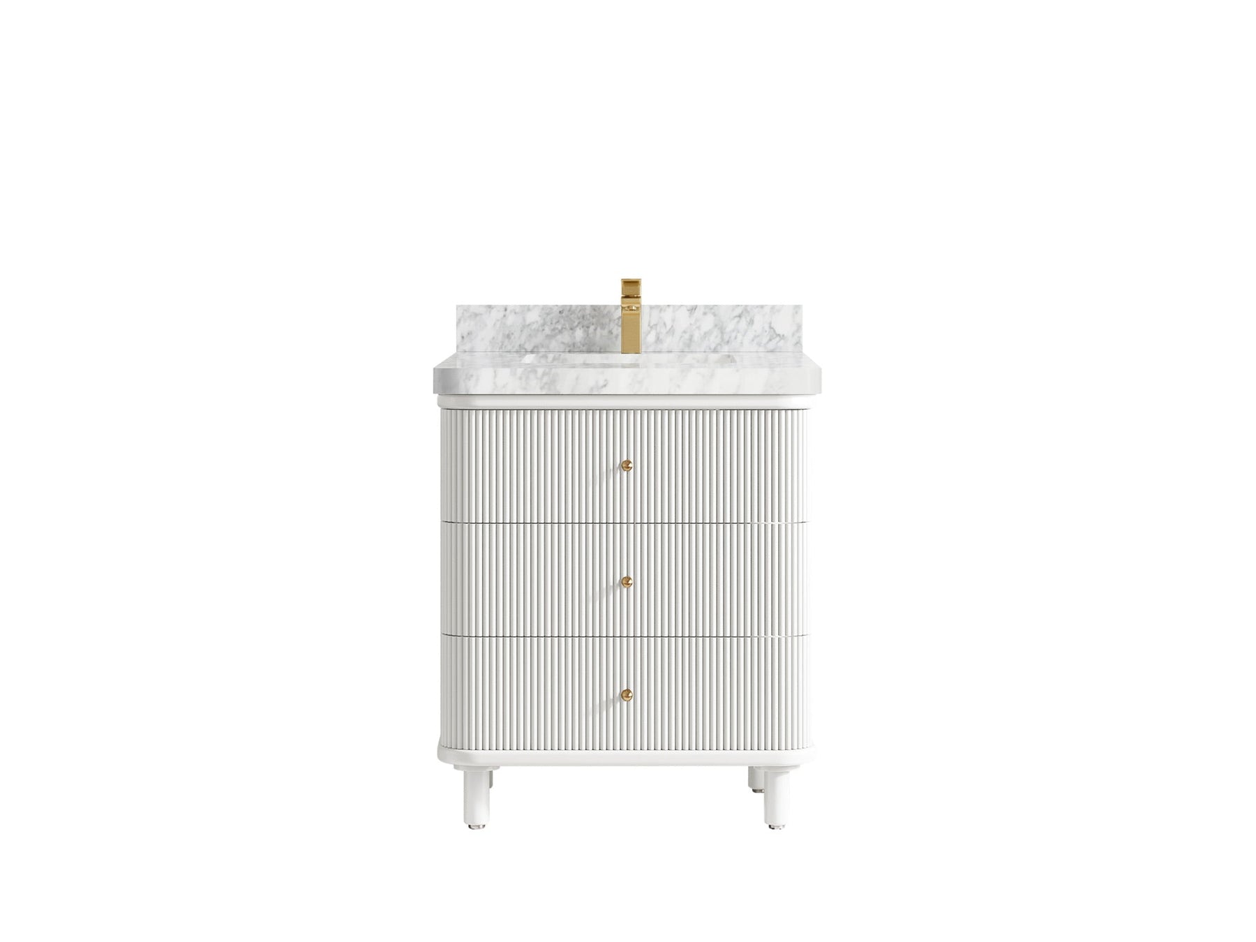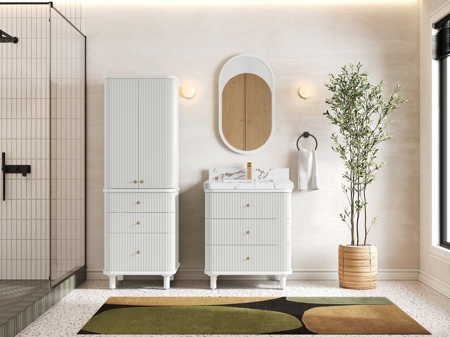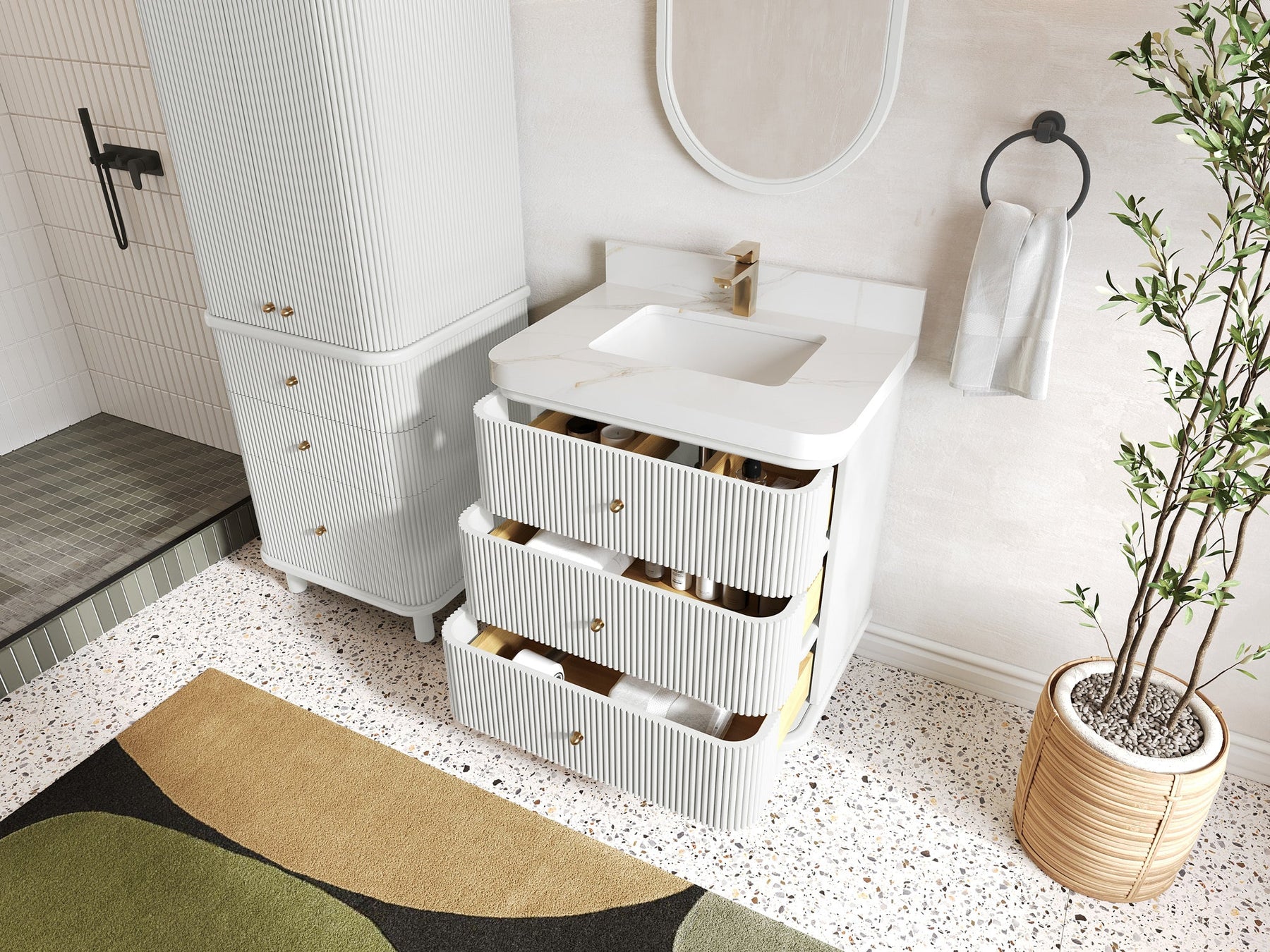The Miami Vanity is an elegant centerpiece inspired by Miami’s iconic blend of contemporary flair and classic Art Deco charm. Featuring striking fluted detailing, softly rounded edges, and sleek, modern legs, this vanity delivers a luxurious yet approachable style. Its thoughtfully designed interior includes practical organizers and an integrated power station, making everyday routines effortlessly organized. Available in various sizes, beautiful color choices, and countertop materials like quartz, marble, quartzite, or terrazzo, the Miami Vanity easily adapts to your personal aesthetic. Complete with spacious soft-close drawers and premium hardware, this vanity brings functionality, refined design, and exceptional quality to your bathroom space.