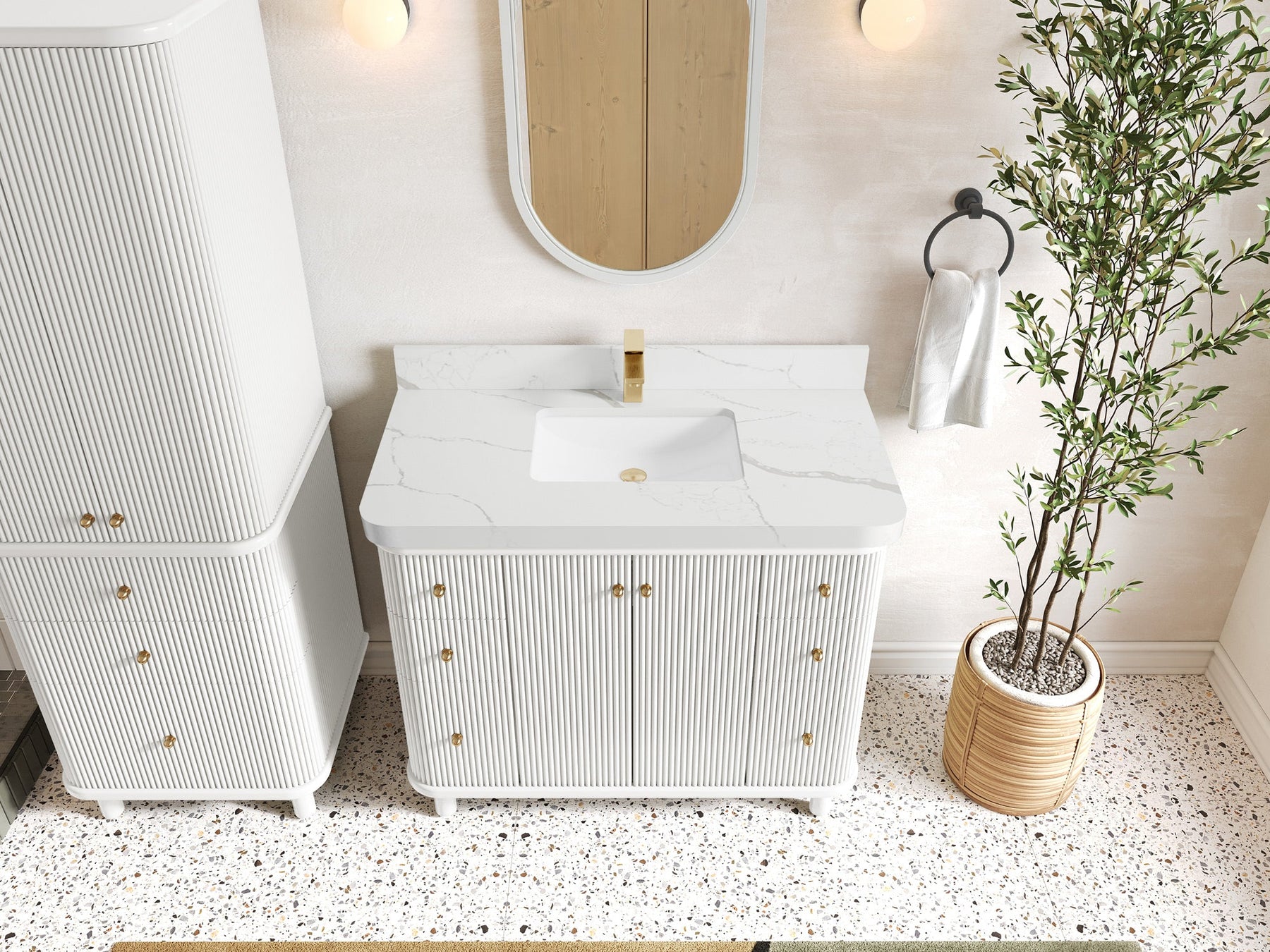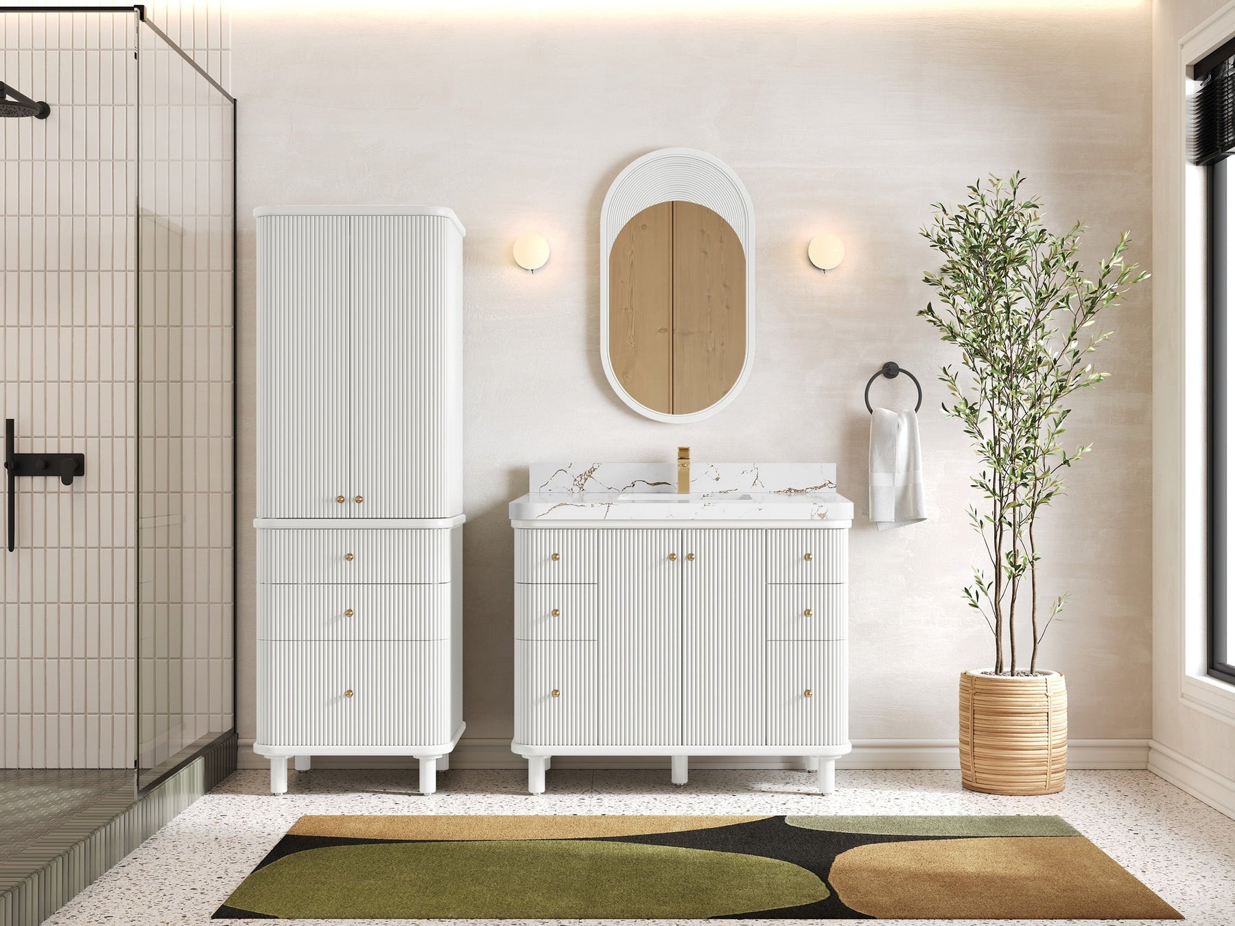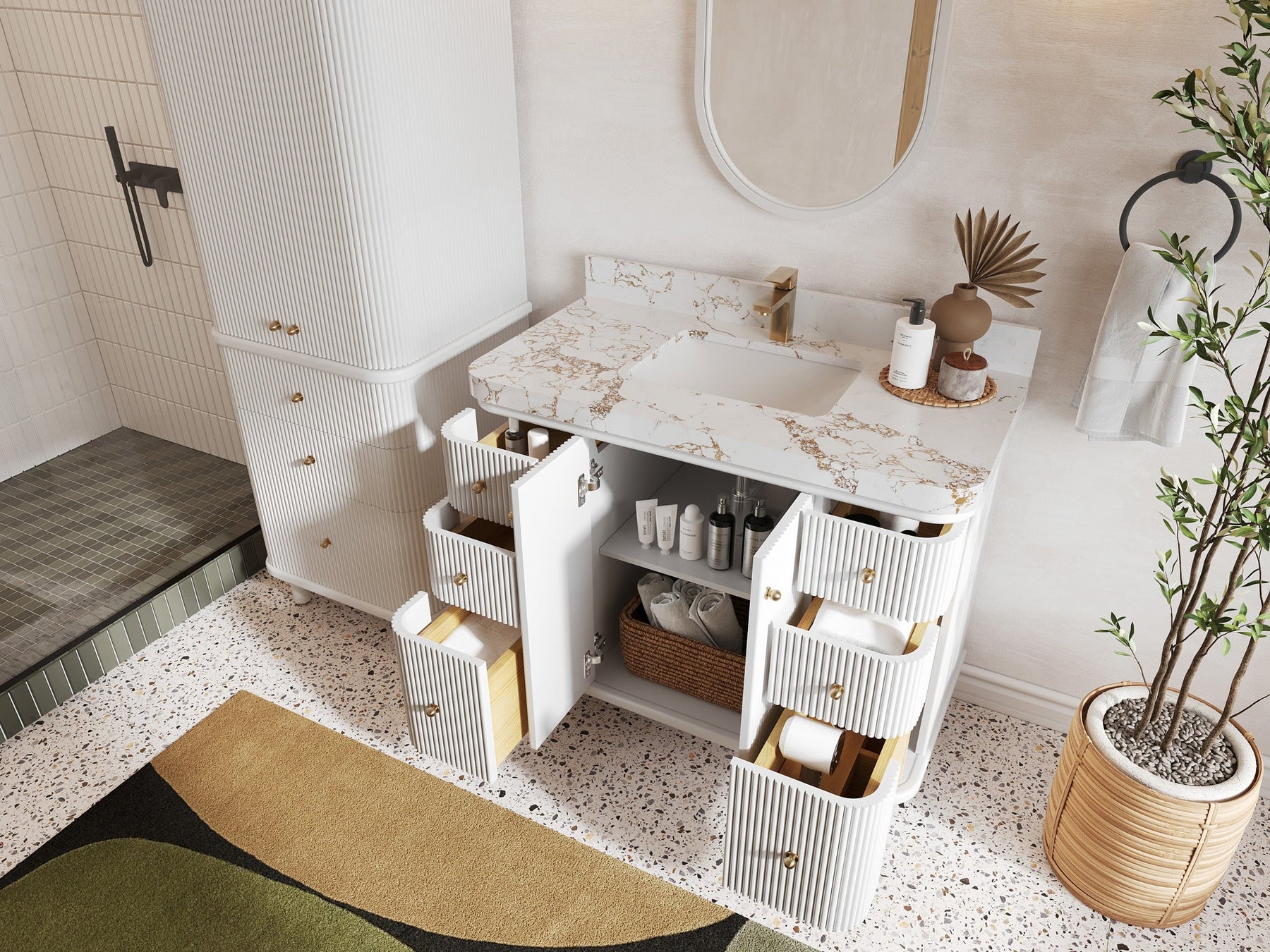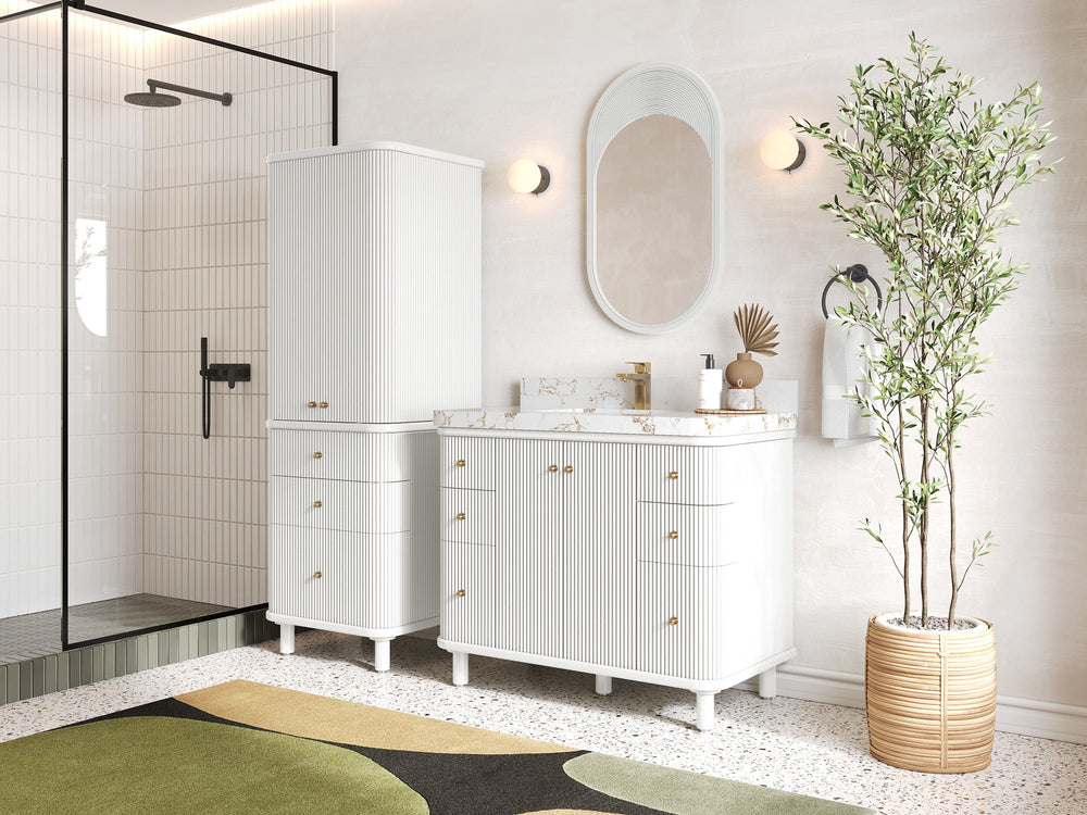 The Miami Vanity is an elegant centerpiece inspired by Miami’s iconic blend of contemporary flair and classic Art Deco charm. Featuring striking fluted detailing, softly rounded edges, and sleek, modern legs, this vanity delivers a luxurious yet approachable style. Its thoughtfully designed interior includes practical organizers and an integrated power station, making everyday routines effortlessly organized. Available in various sizes, beautiful color choices, and countertop materials like quartz, marble, quartzite, or terrazzo, the Miami Vanity easily adapts to your personal aesthetic. Complete with spacious soft-close drawers and premium hardware, this vanity brings functionality, refined design, and exceptional quality to your bathroom space.
