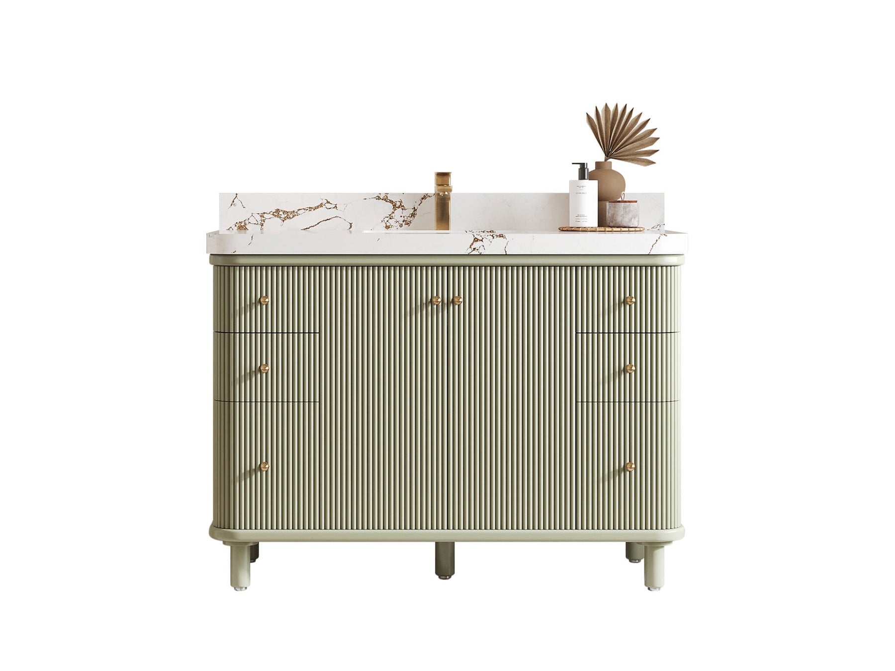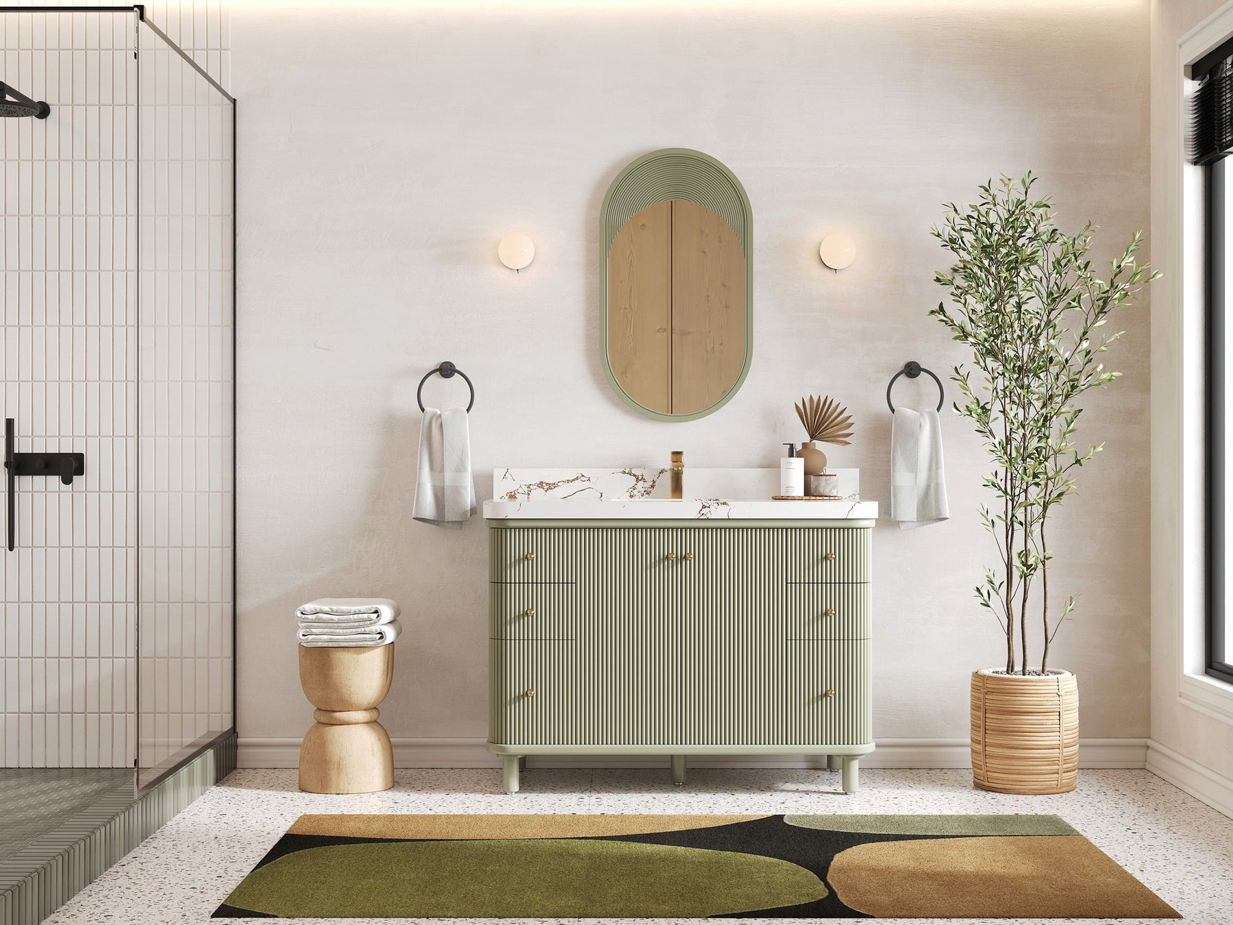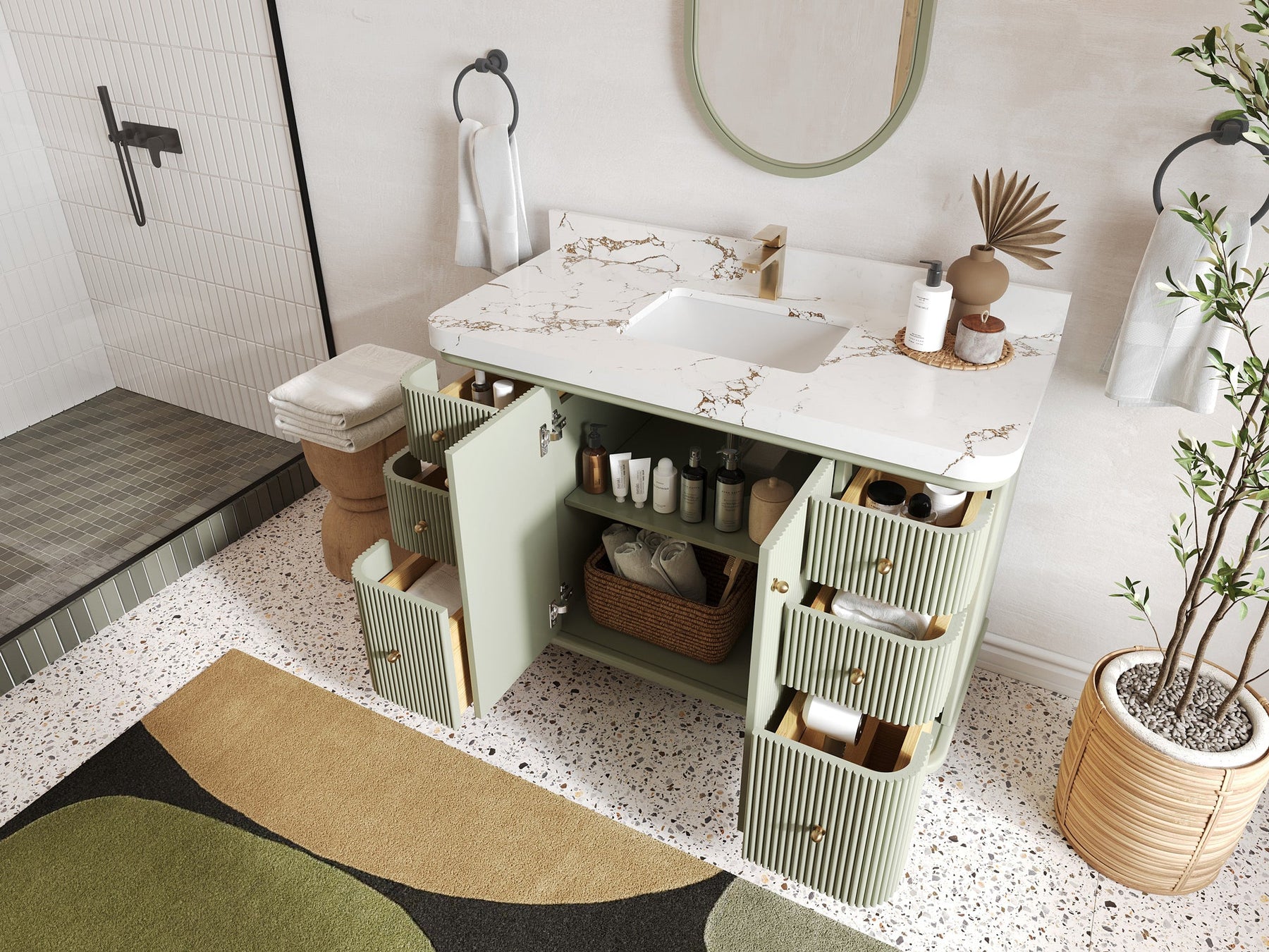 The Miami Vanity is an elegant centerpiece inspired by Miami’s iconic blend of contemporary flair and classic Art Deco charm. Featuring striking fluted detailing, softly rounded edges, and sleek, modern legs, this vanity delivers a luxurious yet approachable style. Its thoughtfully designed interior includes practical organizers and an integrated power station, making everyday routines effortlessly organized. Available in various sizes, beautiful color choices, and countertop materials like quartz, marble, quartzite, or terrazzo, the Miami Vanity easily adapts to your personal aesthetic. Complete with spacious soft-close drawers and premium hardware, this vanity brings functionality, refined design, and exceptional quality to your bathroom space.