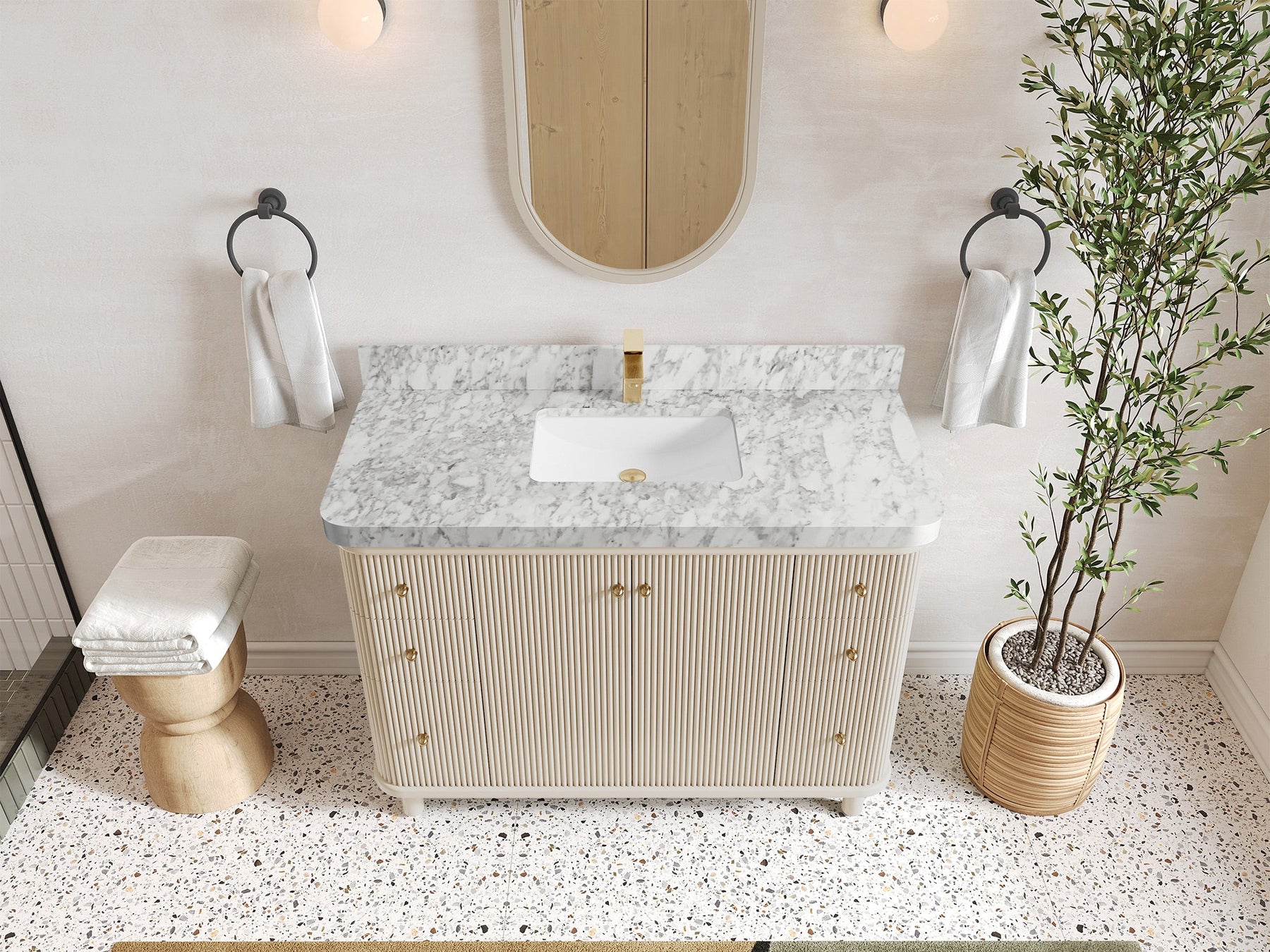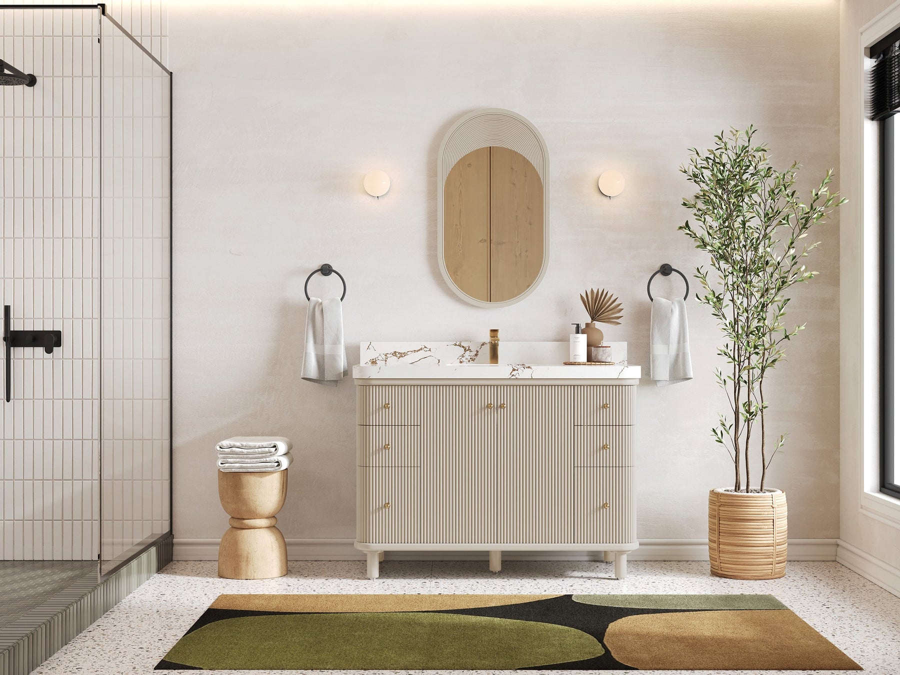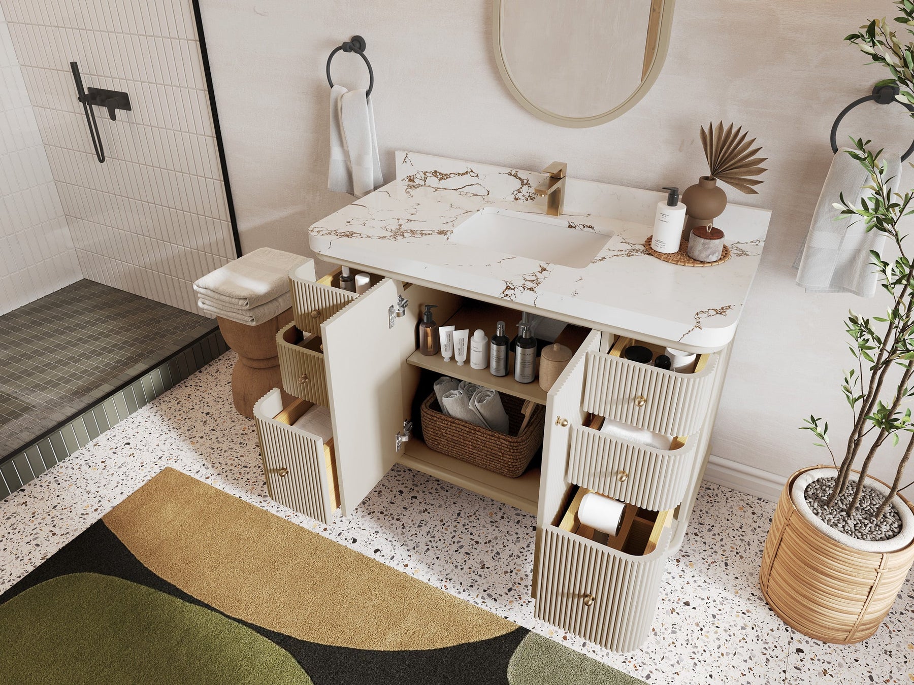 The Miami Vanity is an elegant centerpiece inspired by Miami’s iconic blend of contemporary flair and classic Art Deco charm. Featuring striking fluted detailing, softly rounded edges, and sleek, modern legs, this vanity delivers a luxurious yet approachable style. Its thoughtfully designed interior includes practical organizers and an integrated power station, making everyday routines effortlessly organized. Available in various sizes, beautiful color choices, and countertop materials like quartz, marble, quartzite, or terrazzo, the Miami Vanity easily adapts to your personal aesthetic. Complete with spacious soft-close drawers and premium hardware, this vanity brings functionality, refined design, and exceptional quality to your bathroom space.