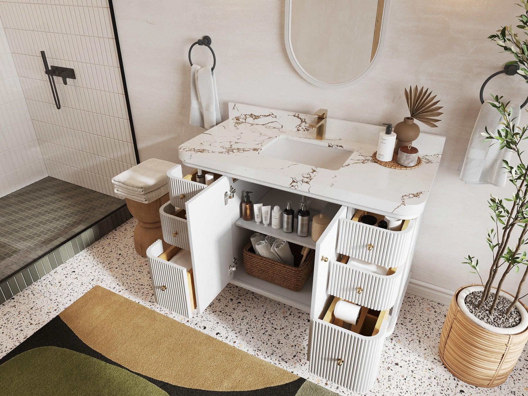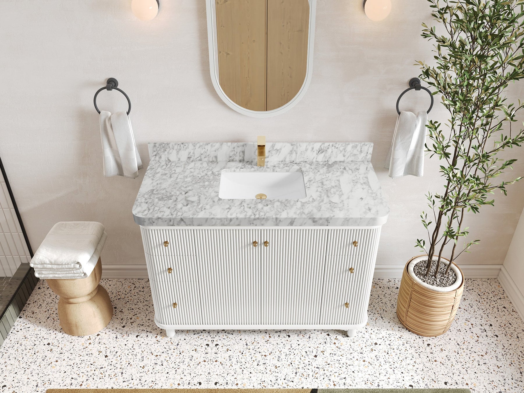 Vanity Countertops options: For Calacatta Laza Quartz, Empira White Quartz, Pure White Quartz, Palissandro Quartz, Calacatta Nuvo Quartz, Carrara Quartz, Carrara Marble, Calacatta Gold Quartz, Calacatta Sienna Quartz we have Straight - Mitered Edge option.