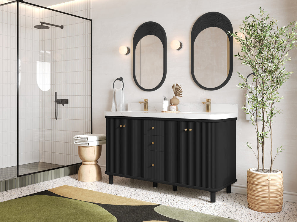 Vanity Countertops options: For Calacatta Laza Quartz, Empira White Quartz, Pure White Quartz, Palissandro Quartz, Calacatta Nuvo Quartz, Carrara Quartz, Carrara Marble, Calacatta Gold Quartz, Calacatta Sienna Quartz we have Straight - Mitered Edge option.