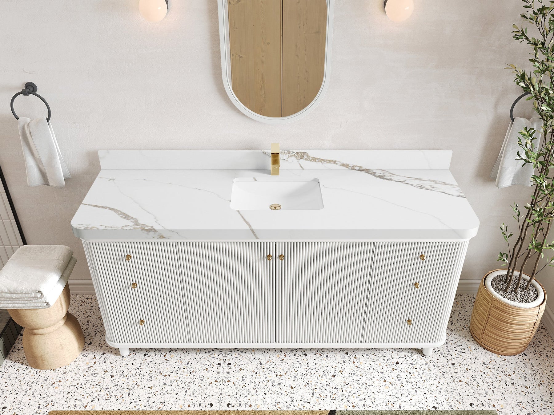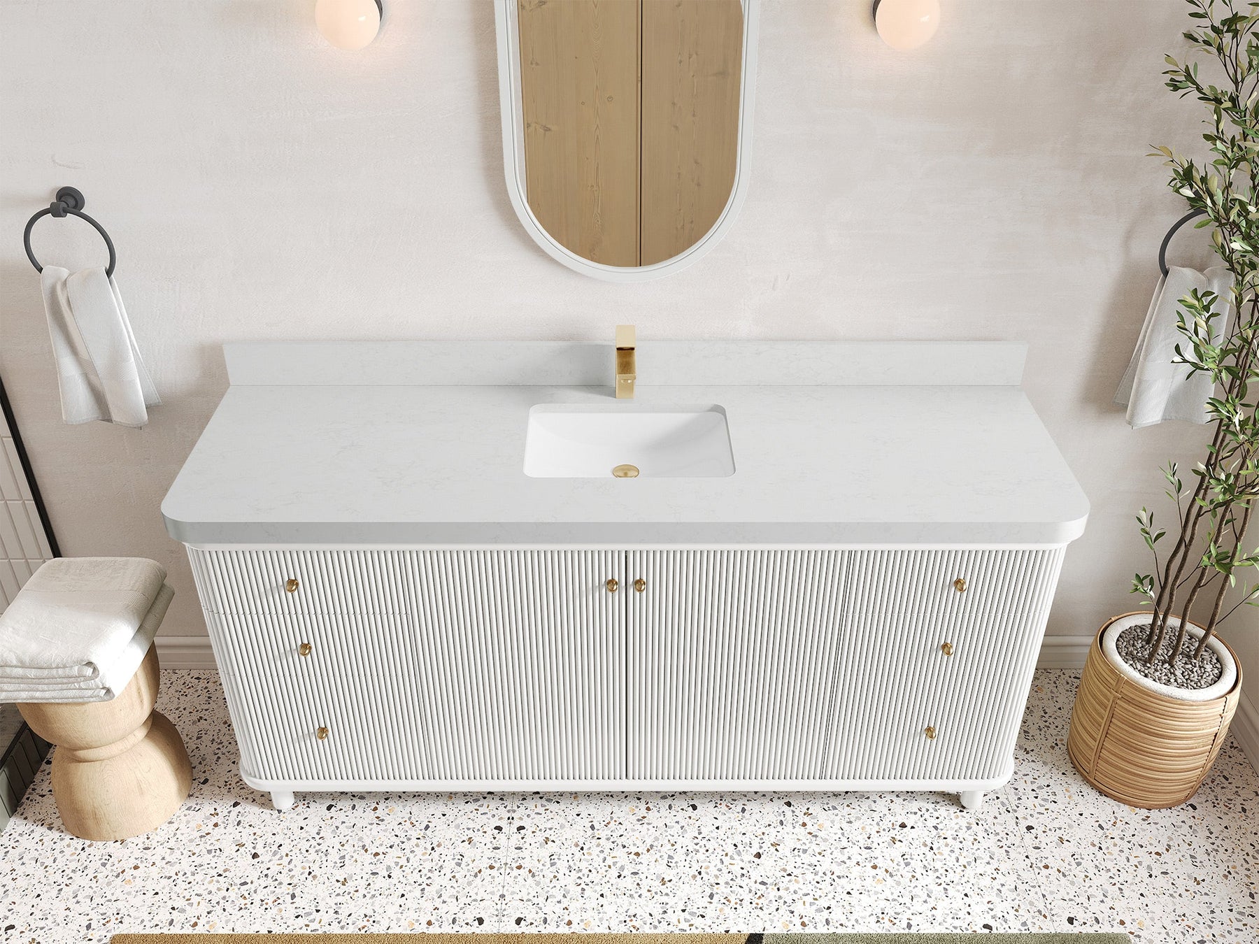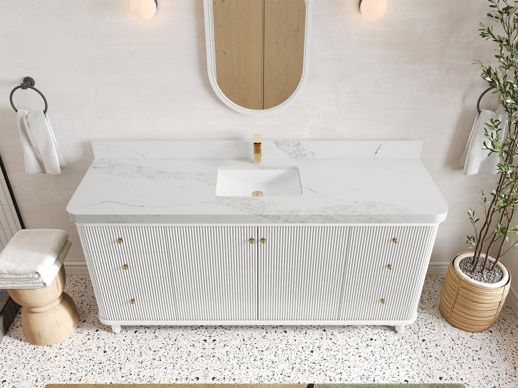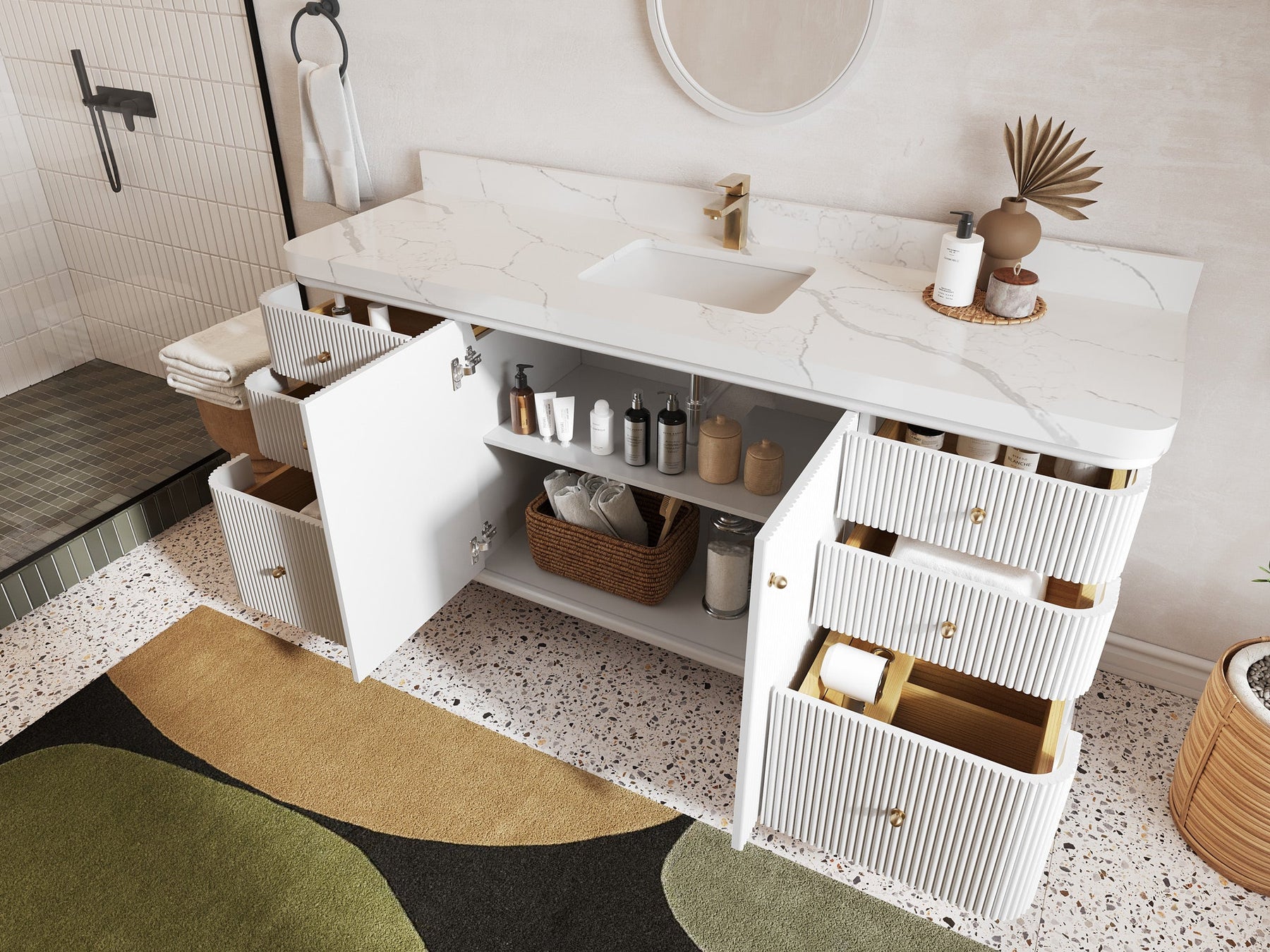The Miami Vanity is an elegant centerpiece inspired by Miami’s iconic blend of contemporary flair and classic Art Deco charm. Featuring striking fluted detailing, softly rounded edges, and sleek, modern legs, this vanity delivers a luxurious yet approachable style. Its thoughtfully designed interior includes practical organizers and an integrated power station, making everyday routines effortlessly organized. Available in various sizes, beautiful color choices, and countertop materials like quartz, marble, quartzite, or terrazzo, the Miami Vanity easily adapts to your personal aesthetic. Complete with spacious soft-close drawers and premium hardware, this vanity brings functionality, refined design, and exceptional quality to your bathroom space.