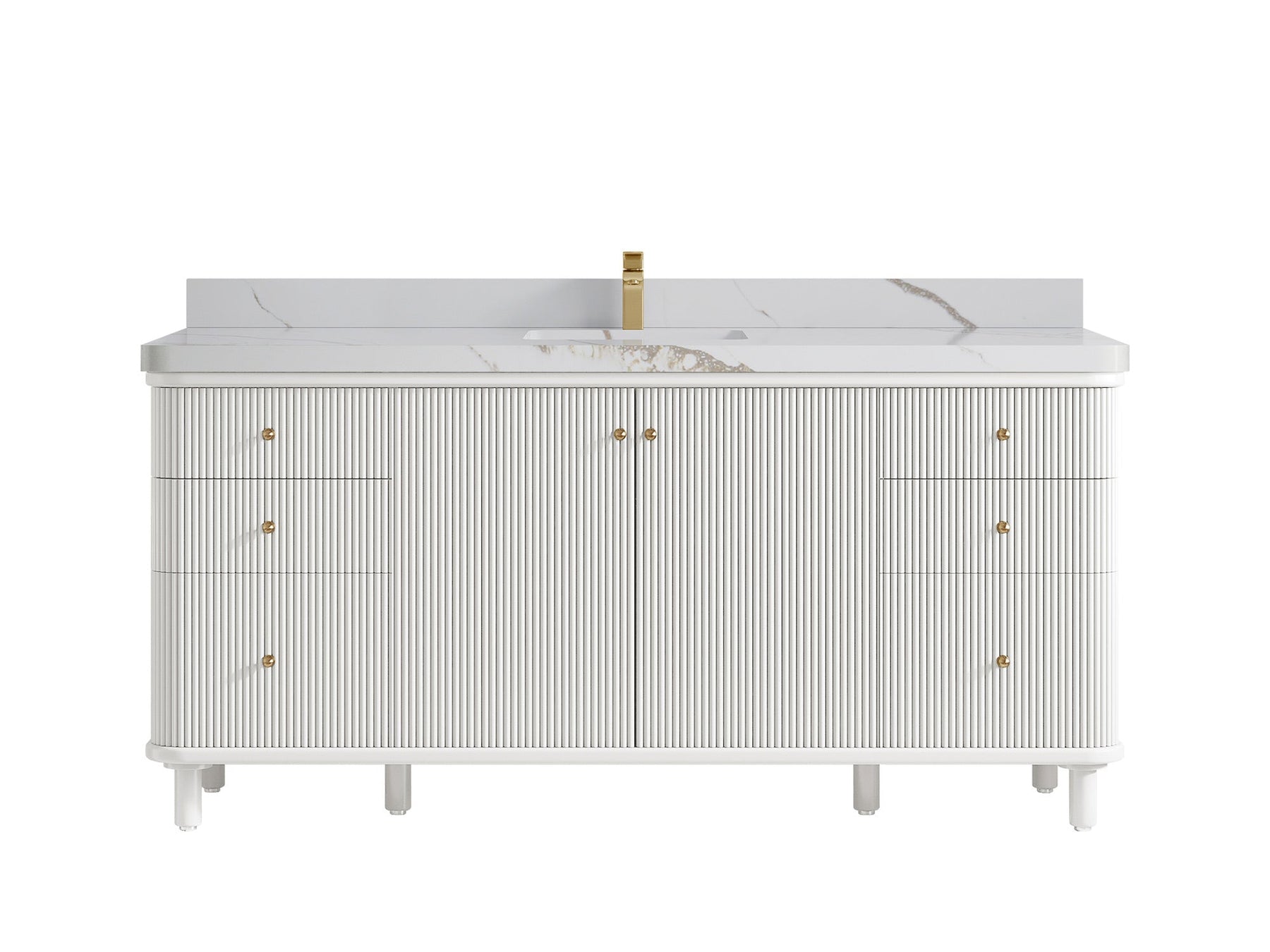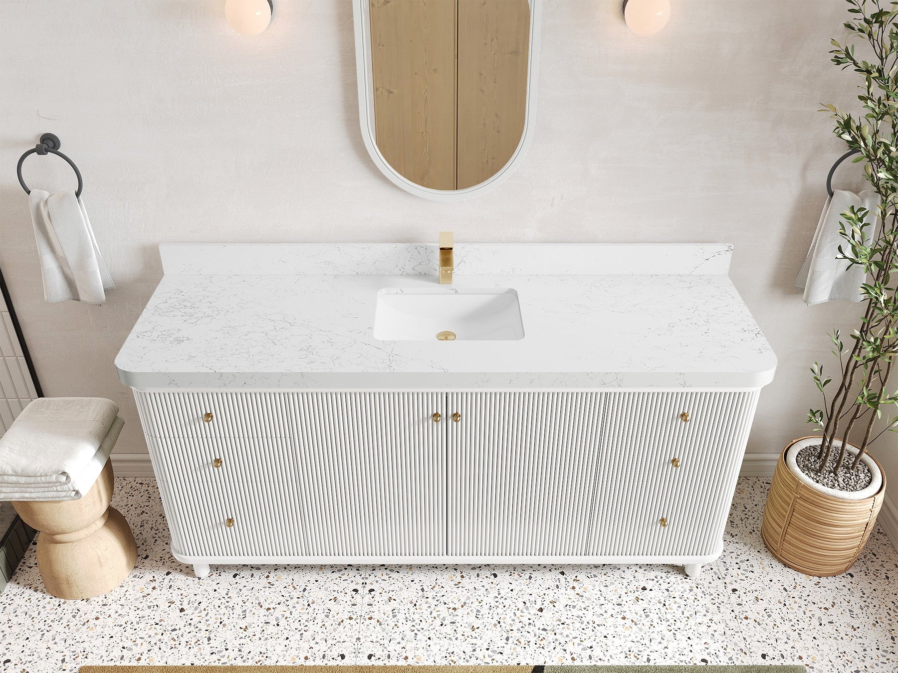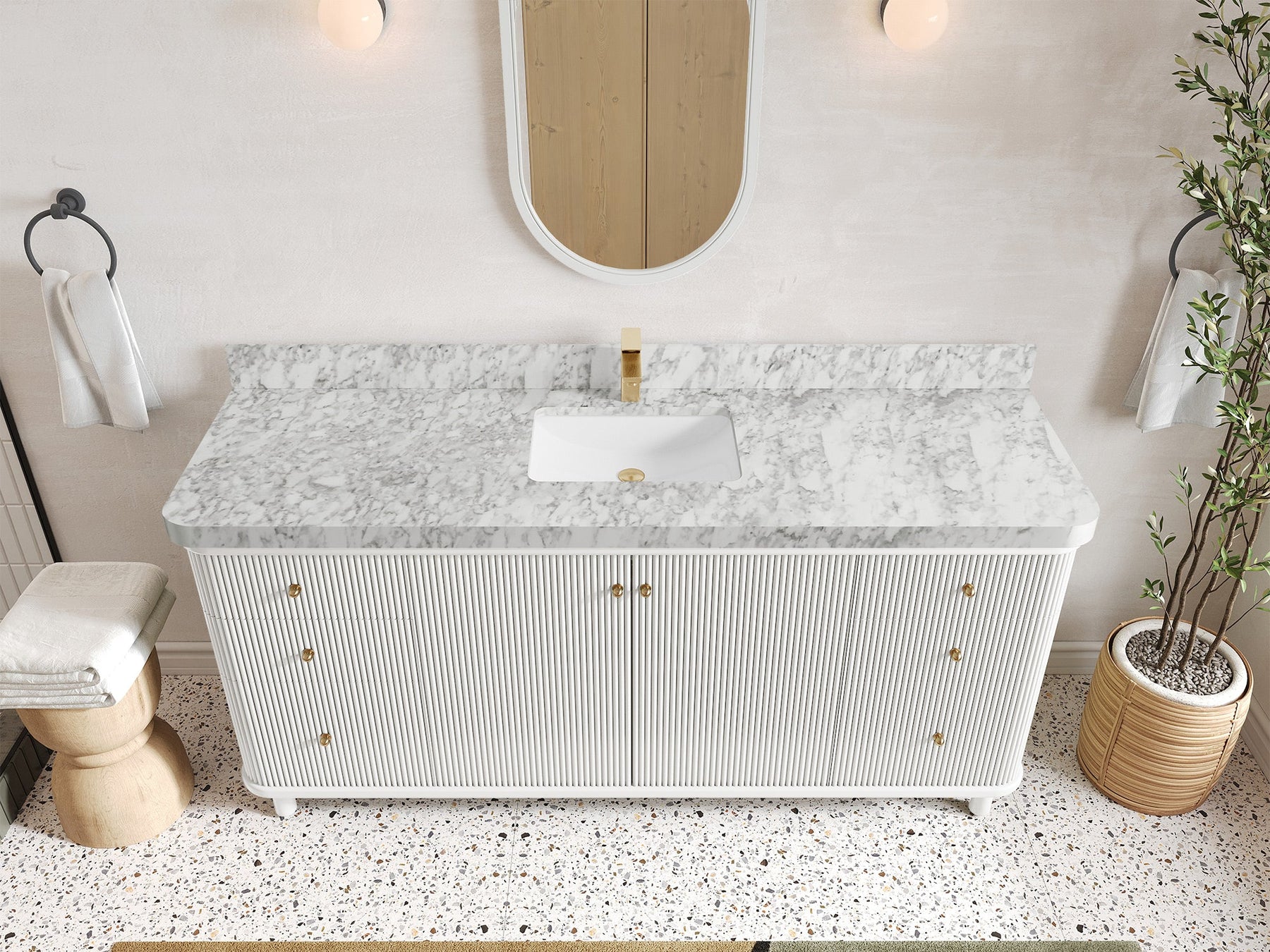 The Miami Vanity is an elegant centerpiece inspired by Miami’s iconic blend of contemporary flair and classic Art Deco charm. Featuring striking fluted detailing, softly rounded edges, and sleek, modern legs, this vanity delivers a luxurious yet approachable style. Its thoughtfully designed interior includes practical organizers and an integrated power station, making everyday routines effortlessly organized. Available in various sizes, beautiful color choices, and countertop materials like quartz, marble, quartzite, or terrazzo, the Miami Vanity easily adapts to your personal aesthetic. Complete with spacious soft-close drawers and premium hardware, this vanity brings functionality, refined design, and exceptional quality to your bathroom space.