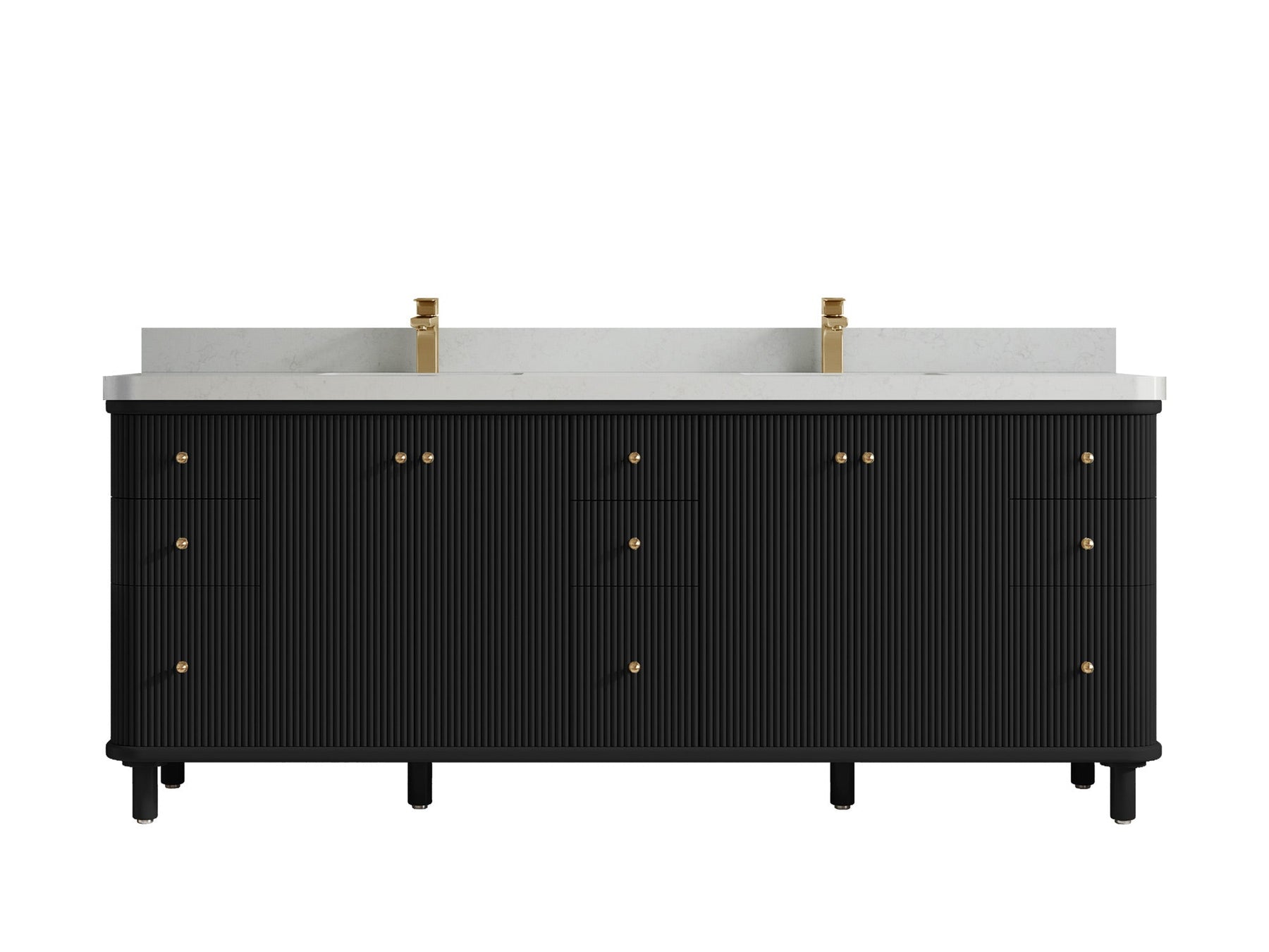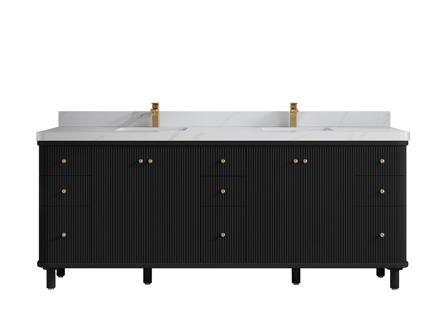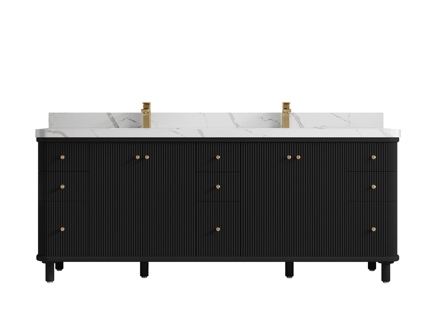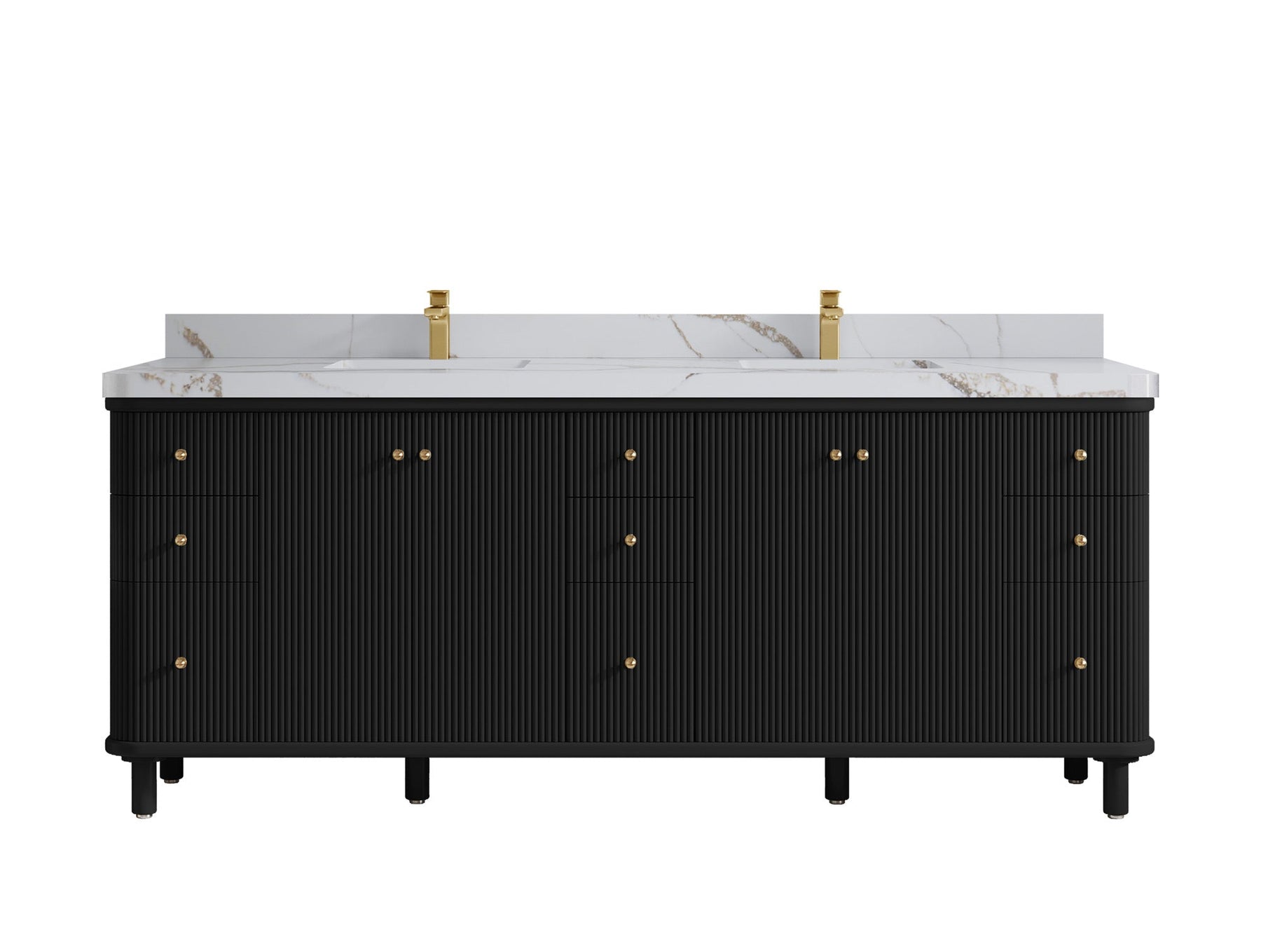 Miami 84 in. W x 22 in. D Double Sink Bathroom Vanity in Black with 2 in Calacatta Sienna Quartz Countertop - Top View