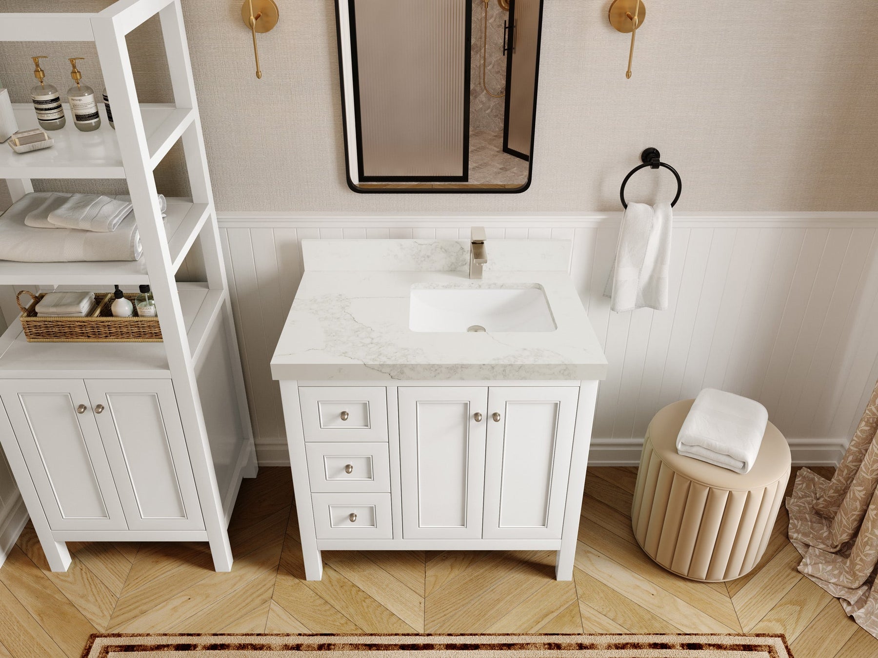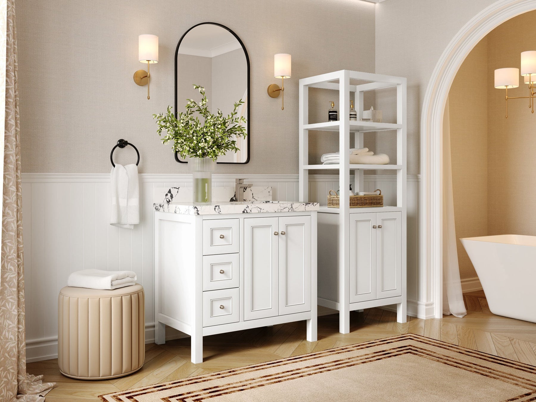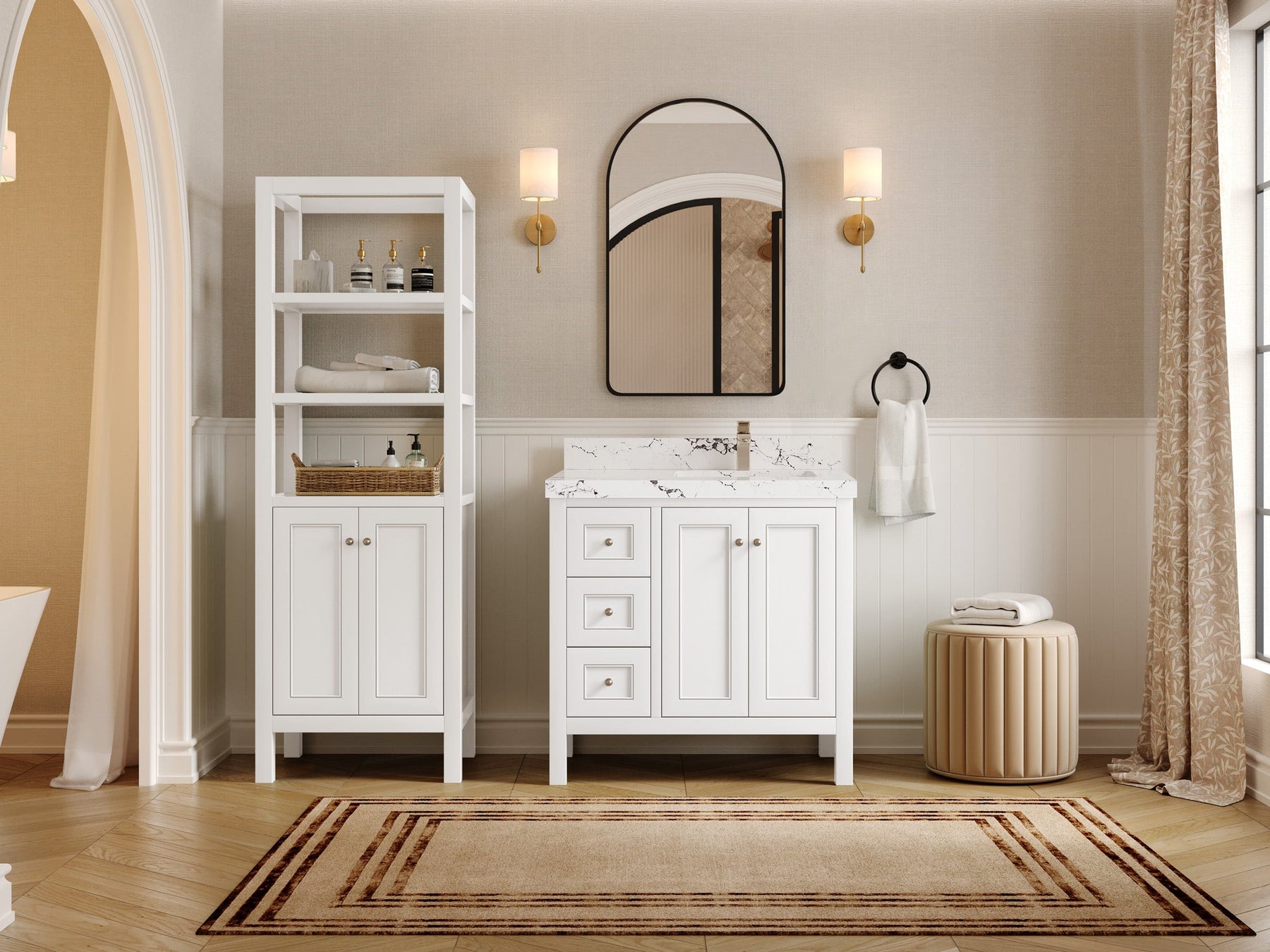 Hardware Finish: Fine Grain, White comes with Brushed Nickel Finish; Alabaster, Black, Evergreen comes with Brushed Gold Finish