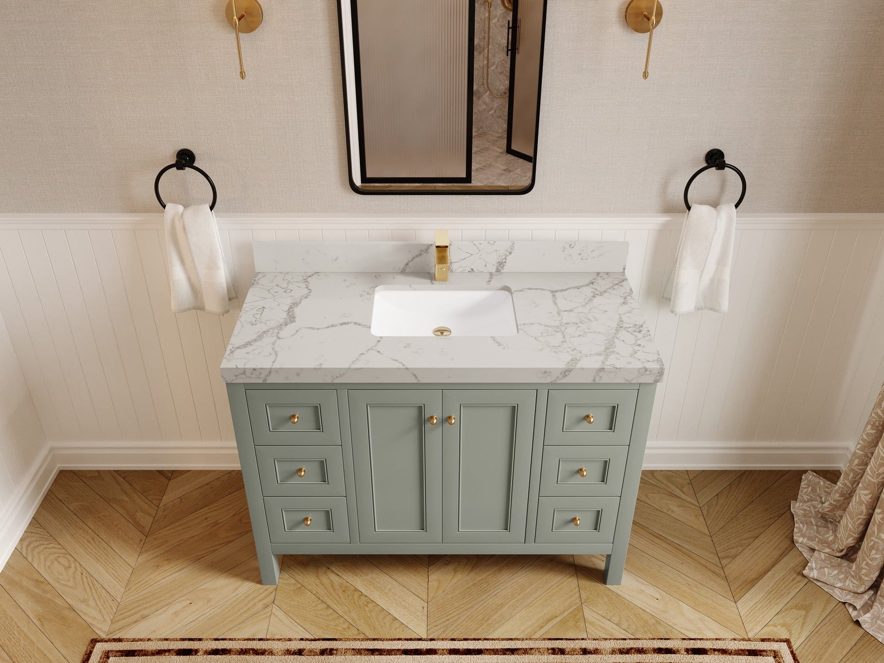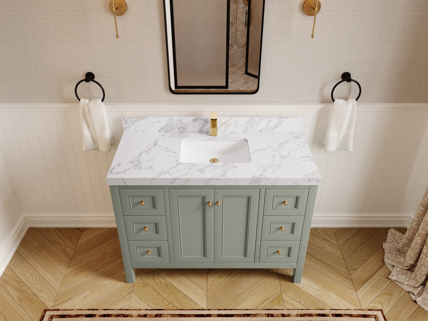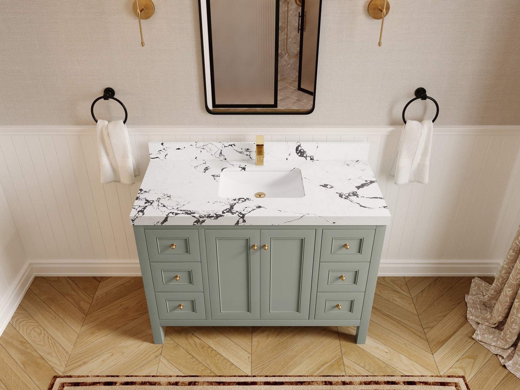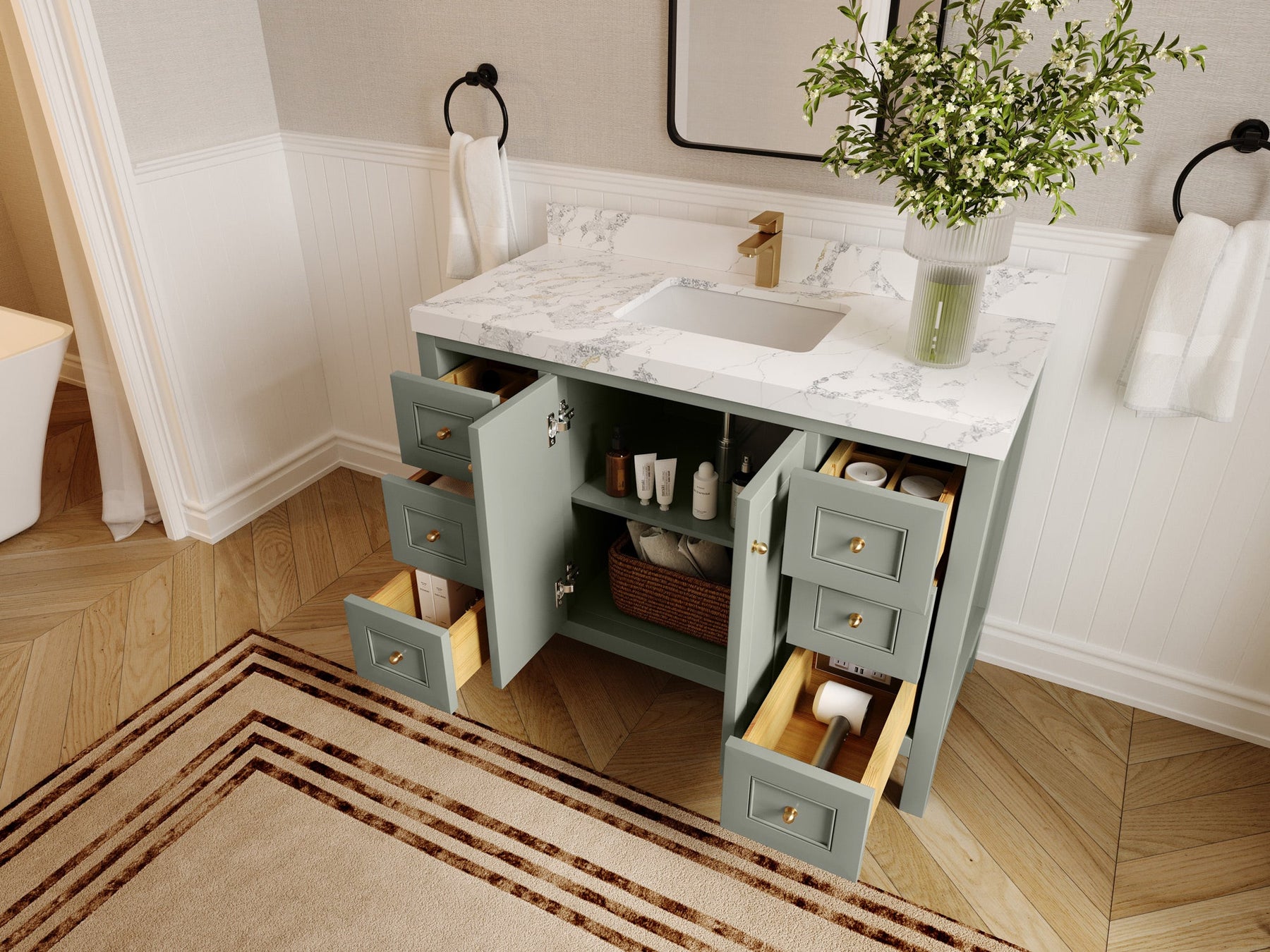 • 3 Customizable Options: Flexible in terms of cabinet color, countertop materials, and hardware finishes, allowing for a personalized touch.