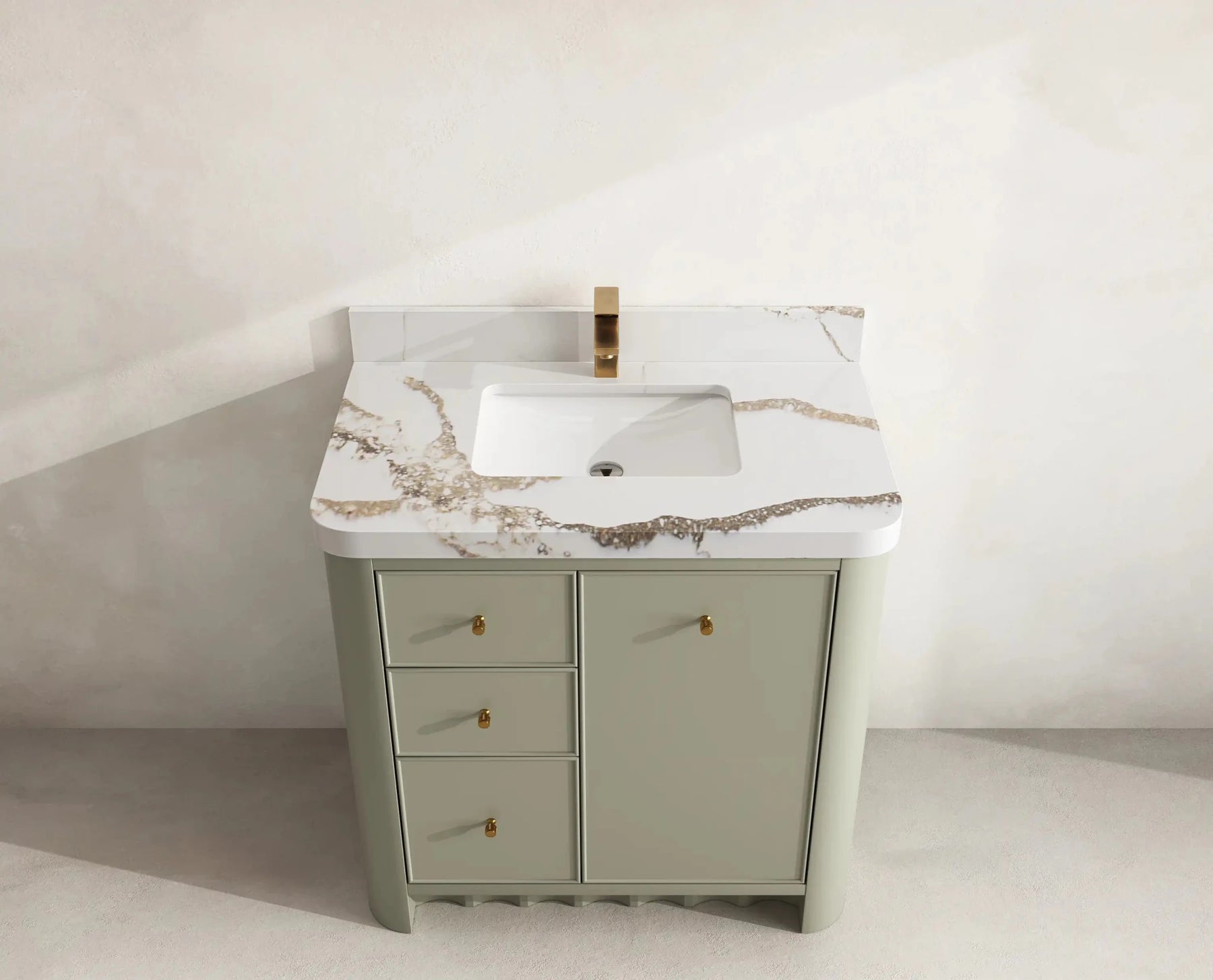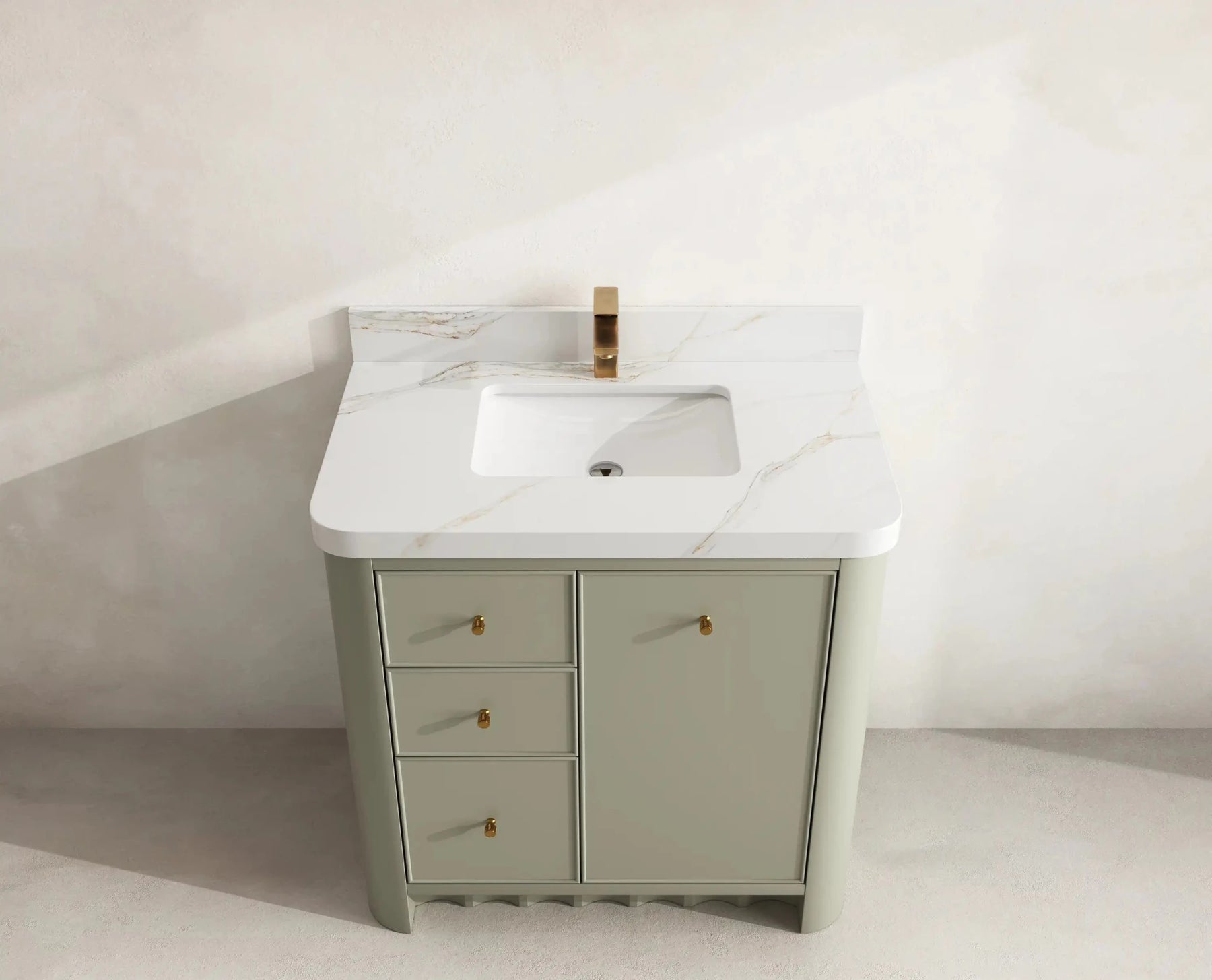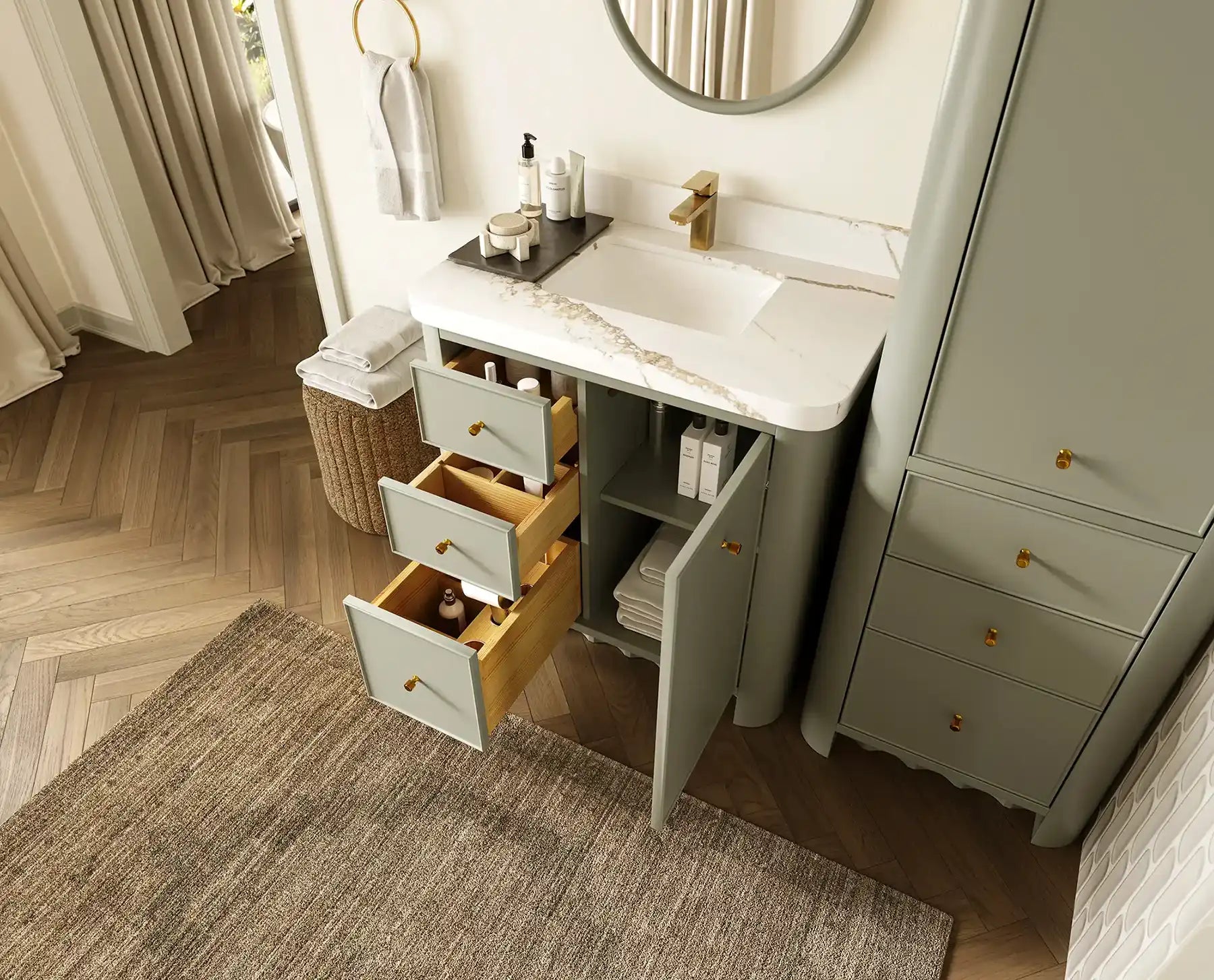 The Orlando Vanity features clean contemporary lines, natural wood-tone interiors, and smooth-glide joinery built for exceptional durability. Its rounded-edge countertop enhances comfort while adding a refined, high-end visual appeal. Gold hardware accents complete the sophisticated aesthetic, making this vanity a true statement piece in any bathroom setting.