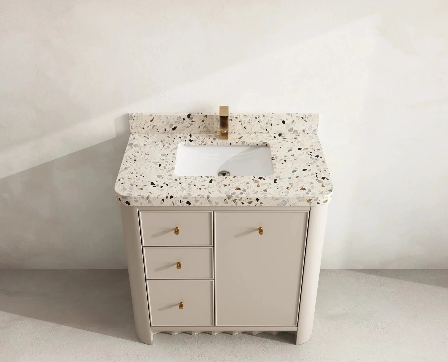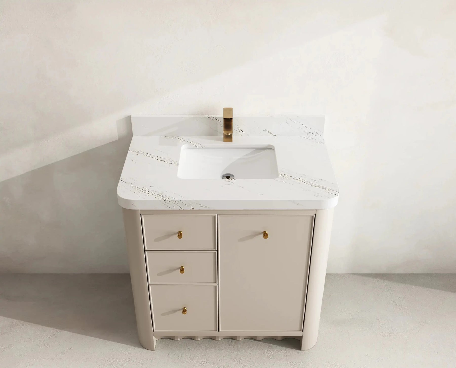 Vanity Countertops options: For Calacatta Laza Quartz, Calacatta Gold Quartz, Empira White Quartz, Pure White Quartz, Palissandro Quartz, Calacatta Nuvo Quartz, Carrara Marble, Carrara Quartz, Calacatta Sienna Quartz, Terrazzo Golden Dusk we have Rounded - Edge option.