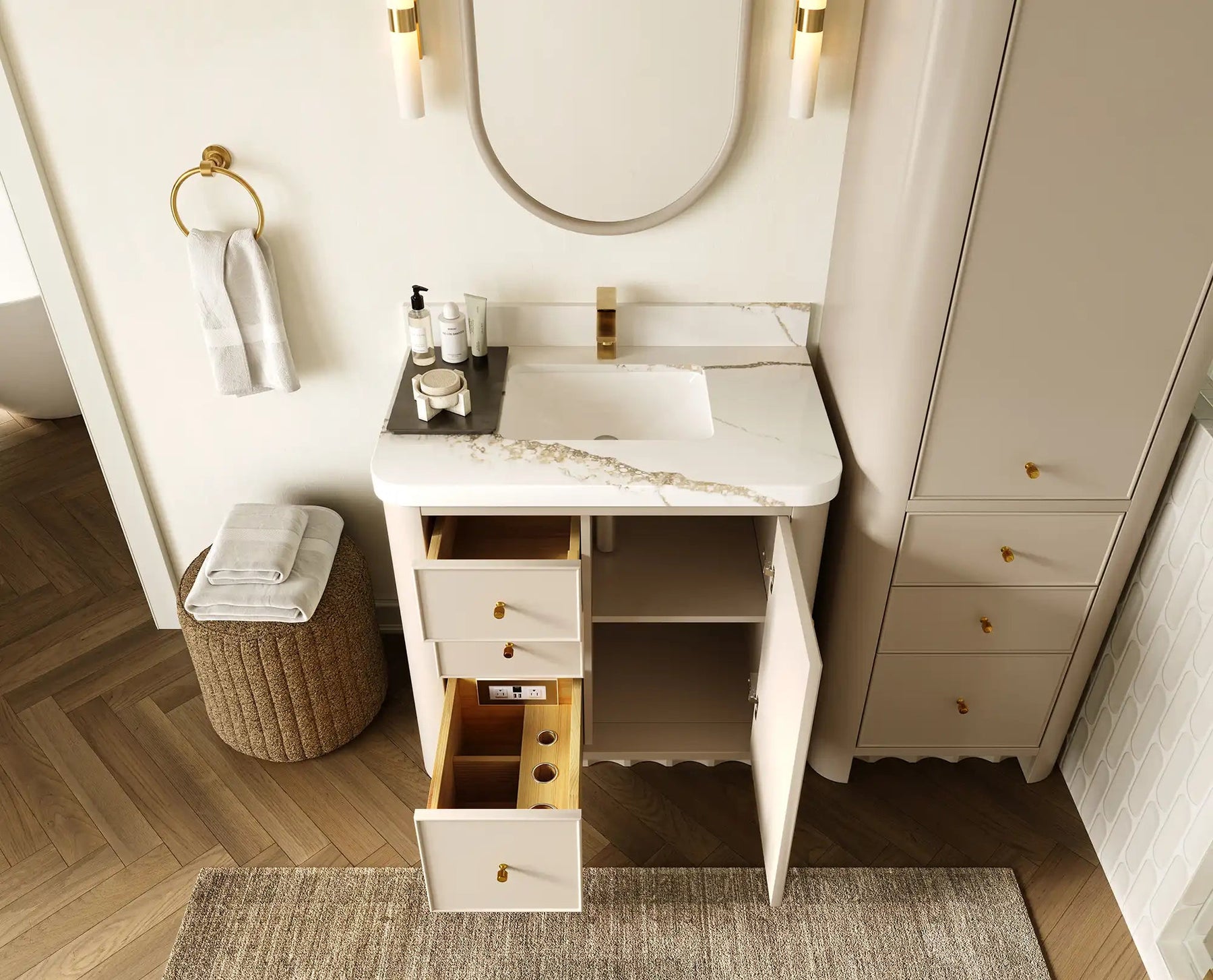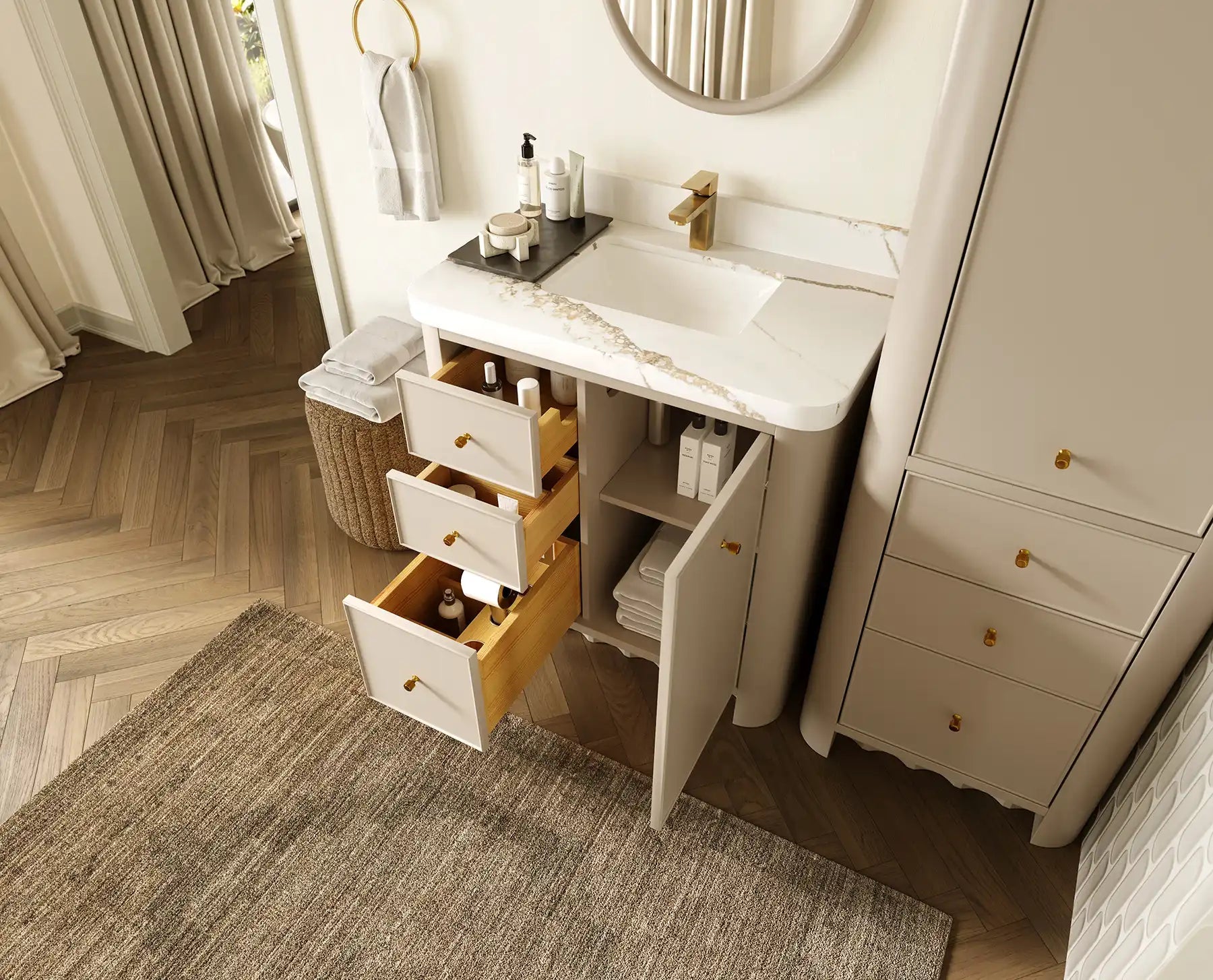 The Orlando Vanity features clean contemporary lines, natural wood-tone interiors, and smooth-glide joinery built for exceptional durability. Its rounded-edge countertop enhances comfort while adding a refined, high-end visual appeal. Gold hardware accents complete the sophisticated aesthetic, making this vanity a true statement piece in any bathroom setting.