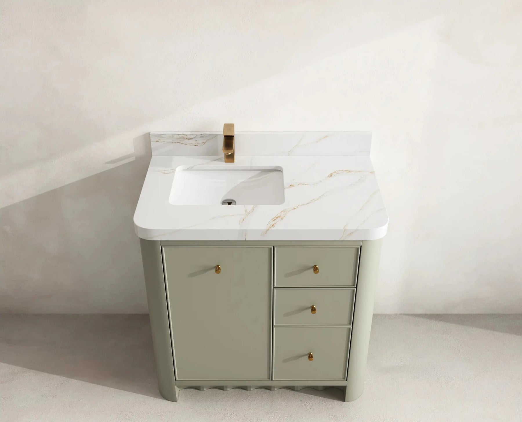 The Orlando Vanity features clean contemporary lines, natural wood-tone interiors, and smooth-glide joinery built for exceptional durability. Its rounded-edge countertop enhances comfort while adding a refined, high-end visual appeal. Gold hardware accents complete the sophisticated aesthetic, making this vanity a true statement piece in any bathroom setting.