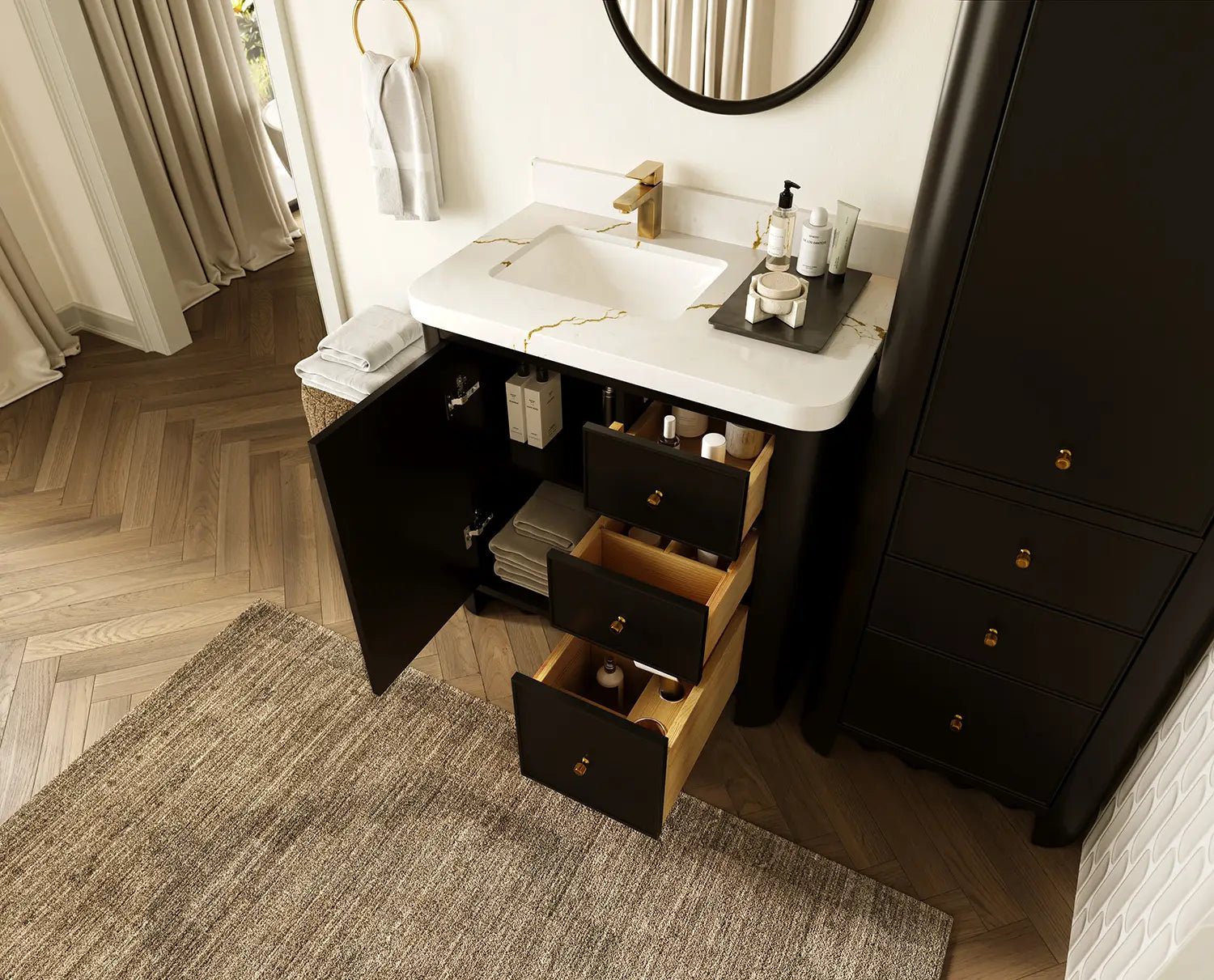 The Orlando Vanity features clean contemporary lines, natural wood-tone interiors, and smooth-glide joinery built for exceptional durability. Its rounded-edge countertop enhances comfort while adding a refined, high-end visual appeal. Gold hardware accents complete the sophisticated aesthetic, making this vanity a true statement piece in any bathroom setting.