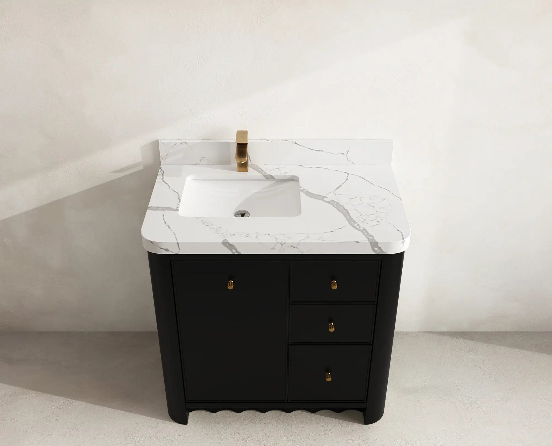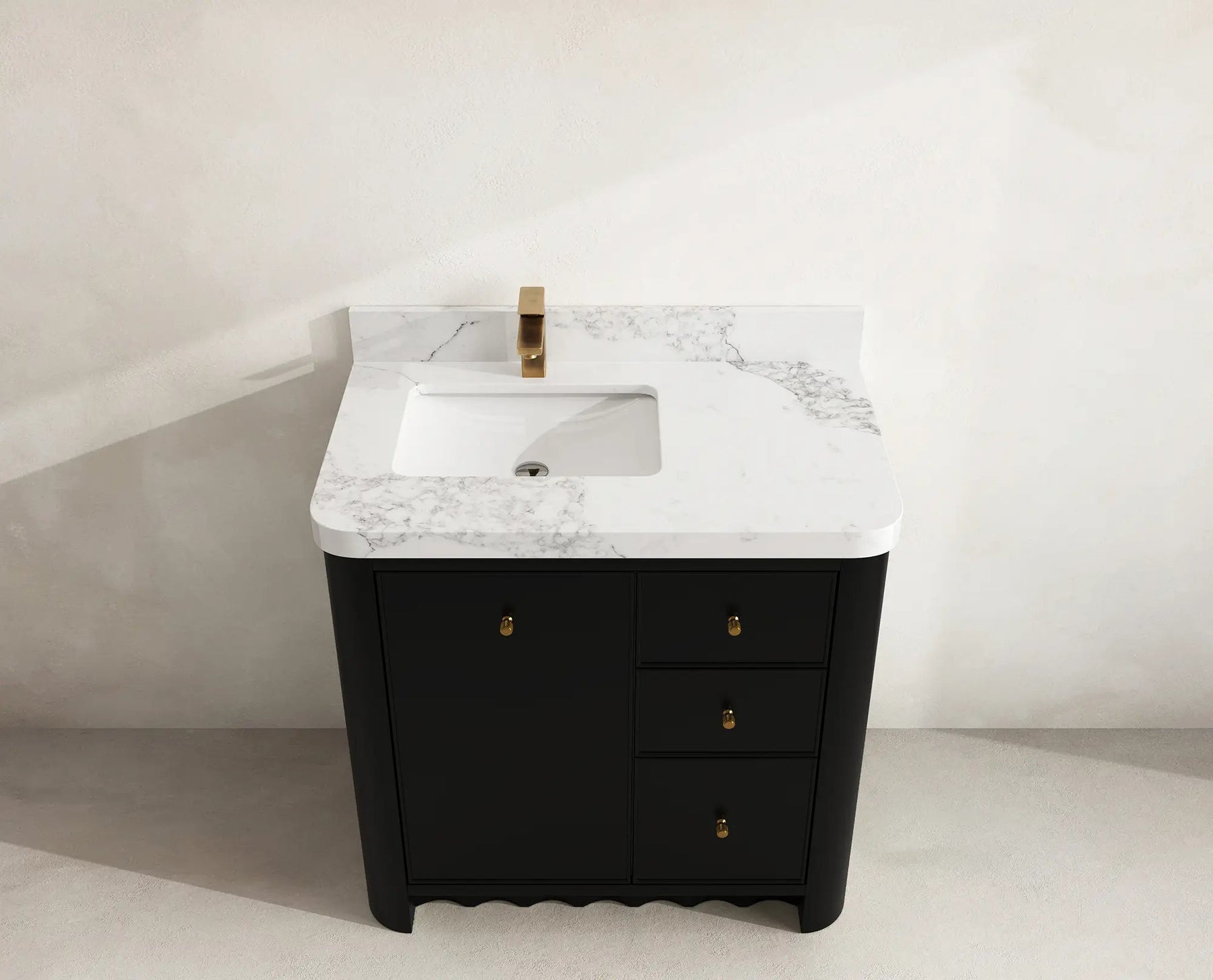Vanity Countertops options: For Calacatta Laza Quartz, Calacatta Gold Quartz, Empira White Quartz, Pure White Quartz, Palissandro Quartz, Calacatta Nuvo Quartz, Carrara Marble, Carrara Quartz, Calacatta Sienna Quartz, Terrazzo Golden Dusk we have Rounded - Edge option.