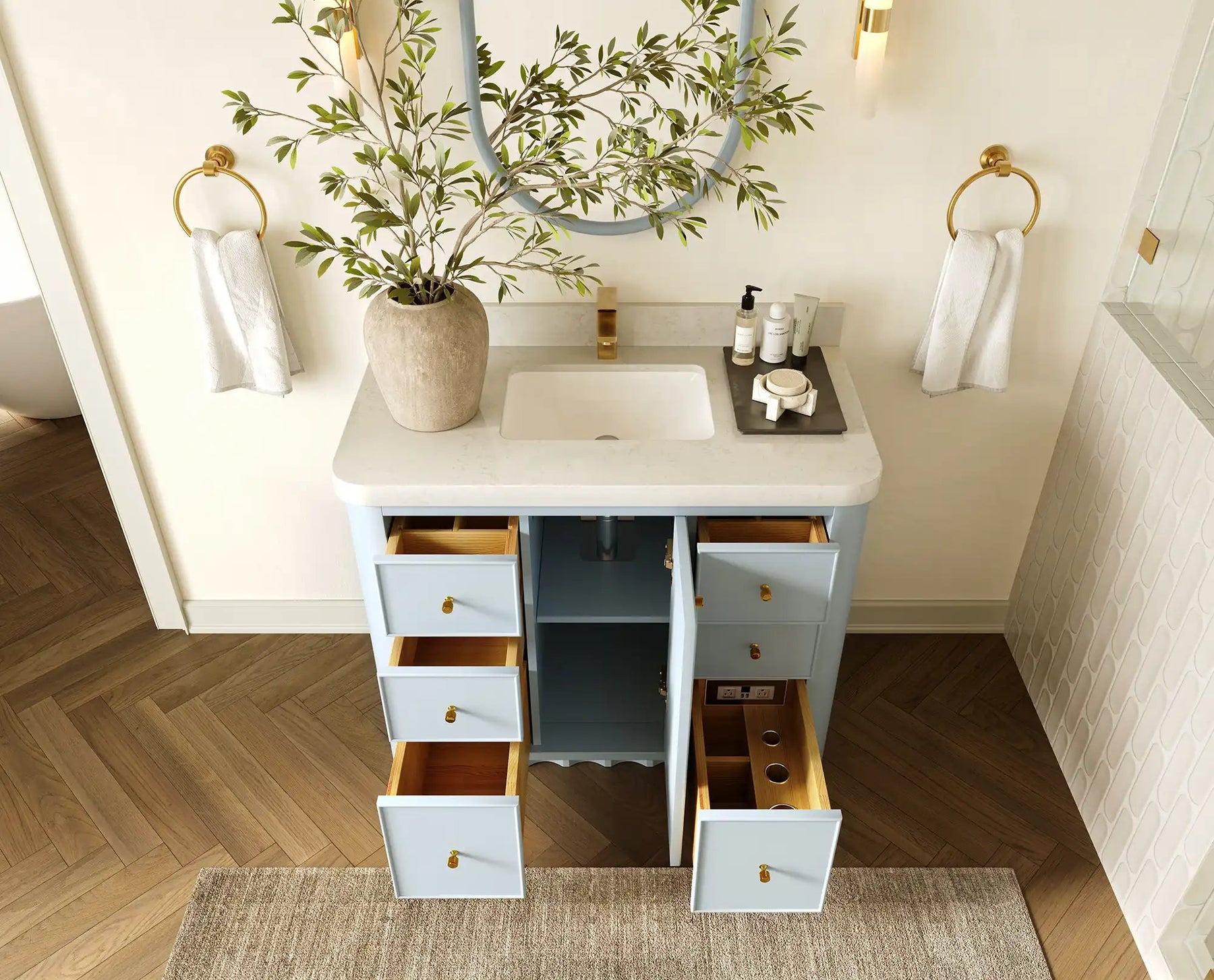 The Orlando Vanity features clean contemporary lines, natural wood-tone interiors, and smooth-glide joinery built for exceptional durability. Its rounded-edge countertop enhances comfort while adding a refined, high-end visual appeal. Gold hardware accents complete the sophisticated aesthetic, making this vanity a true statement piece in any bathroom setting.