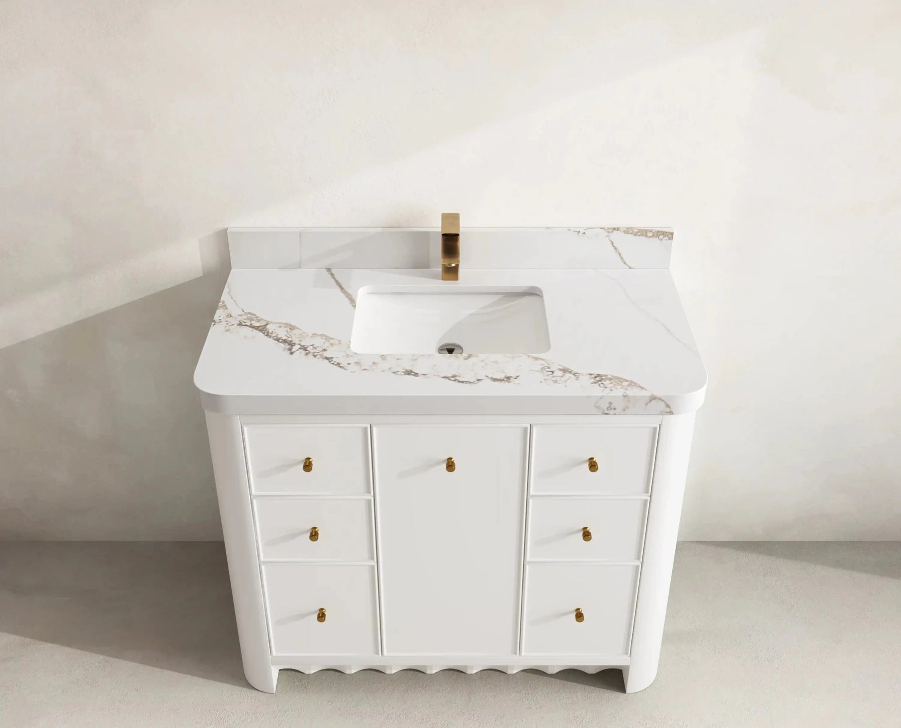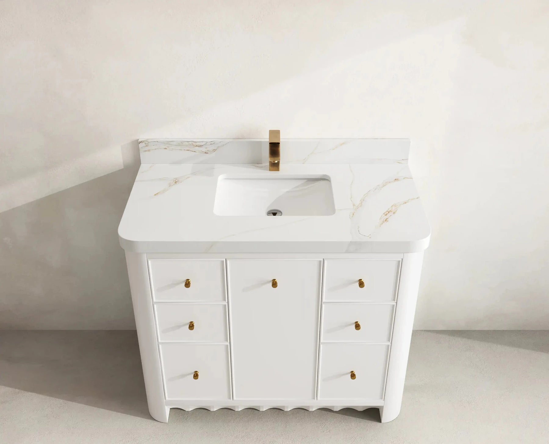 Vanity Countertops options: For Calacatta Laza Quartz, Calacatta Gold Quartz, Empira White Quartz, Pure White Quartz, Palissandro Quartz, Calacatta Nuvo Quartz, Carrara Marble, Carrara Quartz, Calacatta Sienna Quartz, Terrazzo Golden Dusk we have Rounded - Edge option.