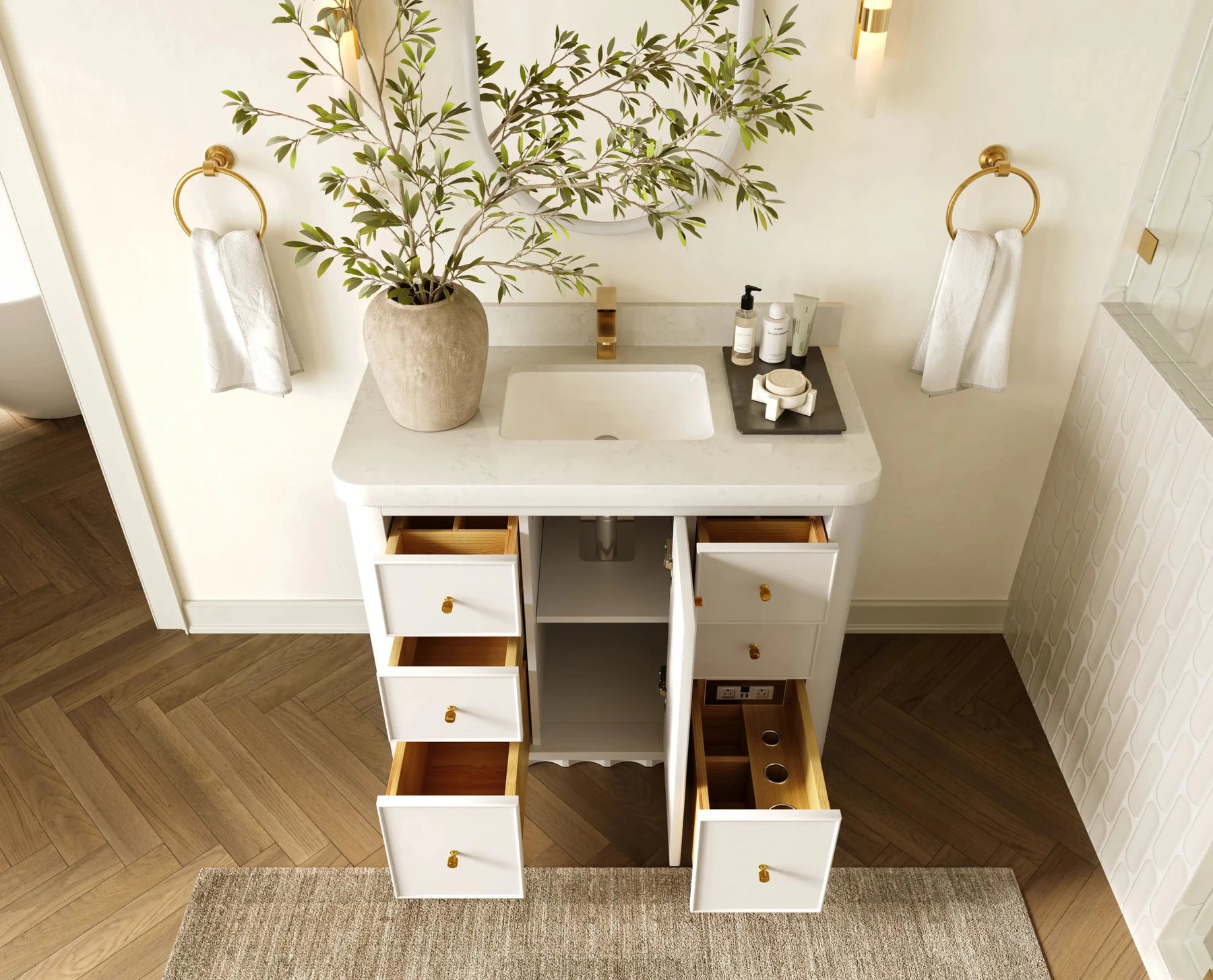 The Orlando Vanity features clean contemporary lines, natural wood-tone interiors, and smooth-glide joinery built for exceptional durability. Its rounded-edge countertop enhances comfort while adding a refined, high-end visual appeal. Gold hardware accents complete the sophisticated aesthetic, making this vanity a true statement piece in any bathroom setting.