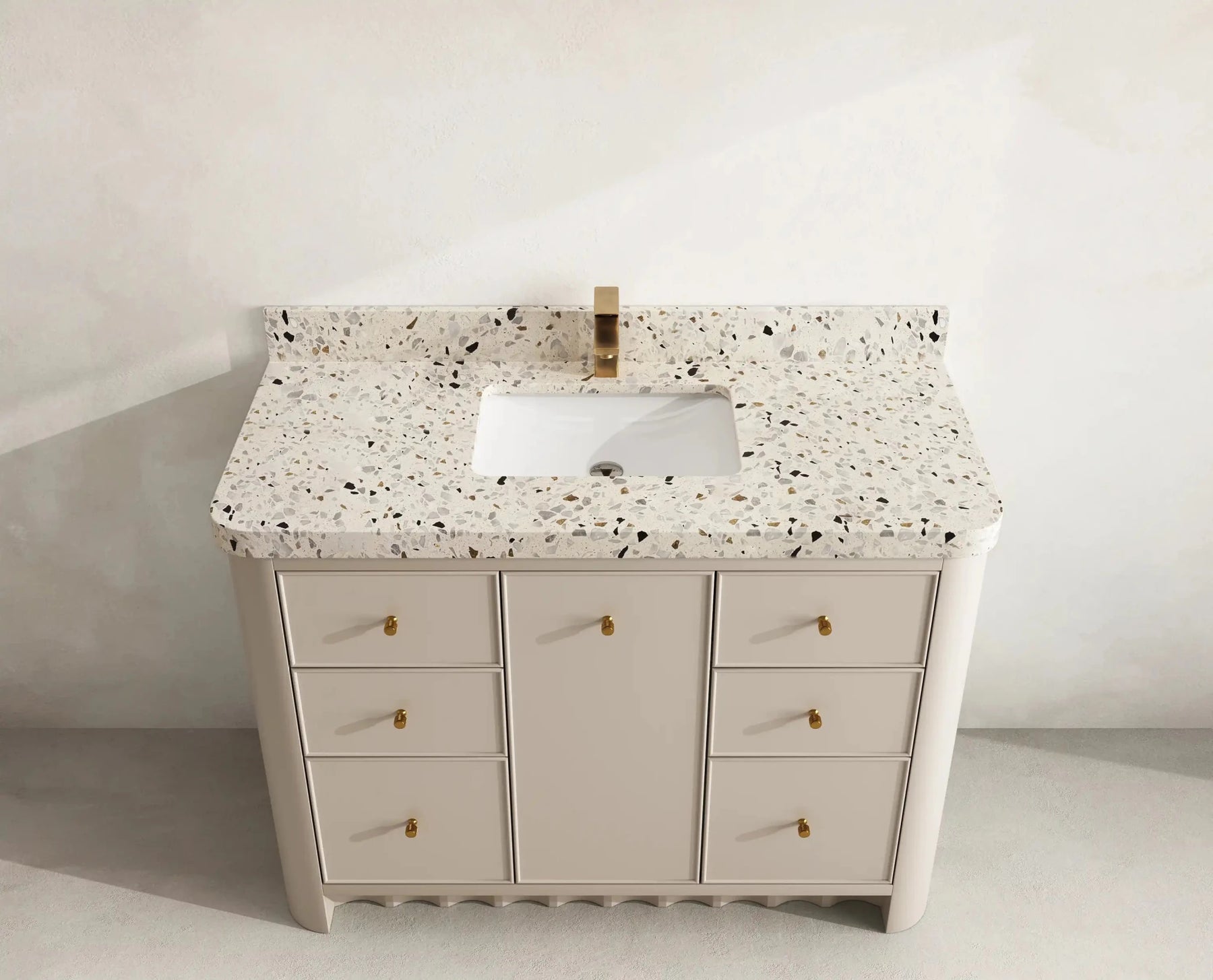 Vanity Countertops options: For Calacatta Laza Quartz, Calacatta Gold Quartz, Empira White Quartz, Pure White Quartz, Palissandro Quartz, Calacatta Nuvo Quartz, Carrara Marble, Carrara Quartz, Calacatta Sienna Quartz, Terrazzo Arctic Breeze, Terrazzo Golden Dusk we have Rounded - Edge option.