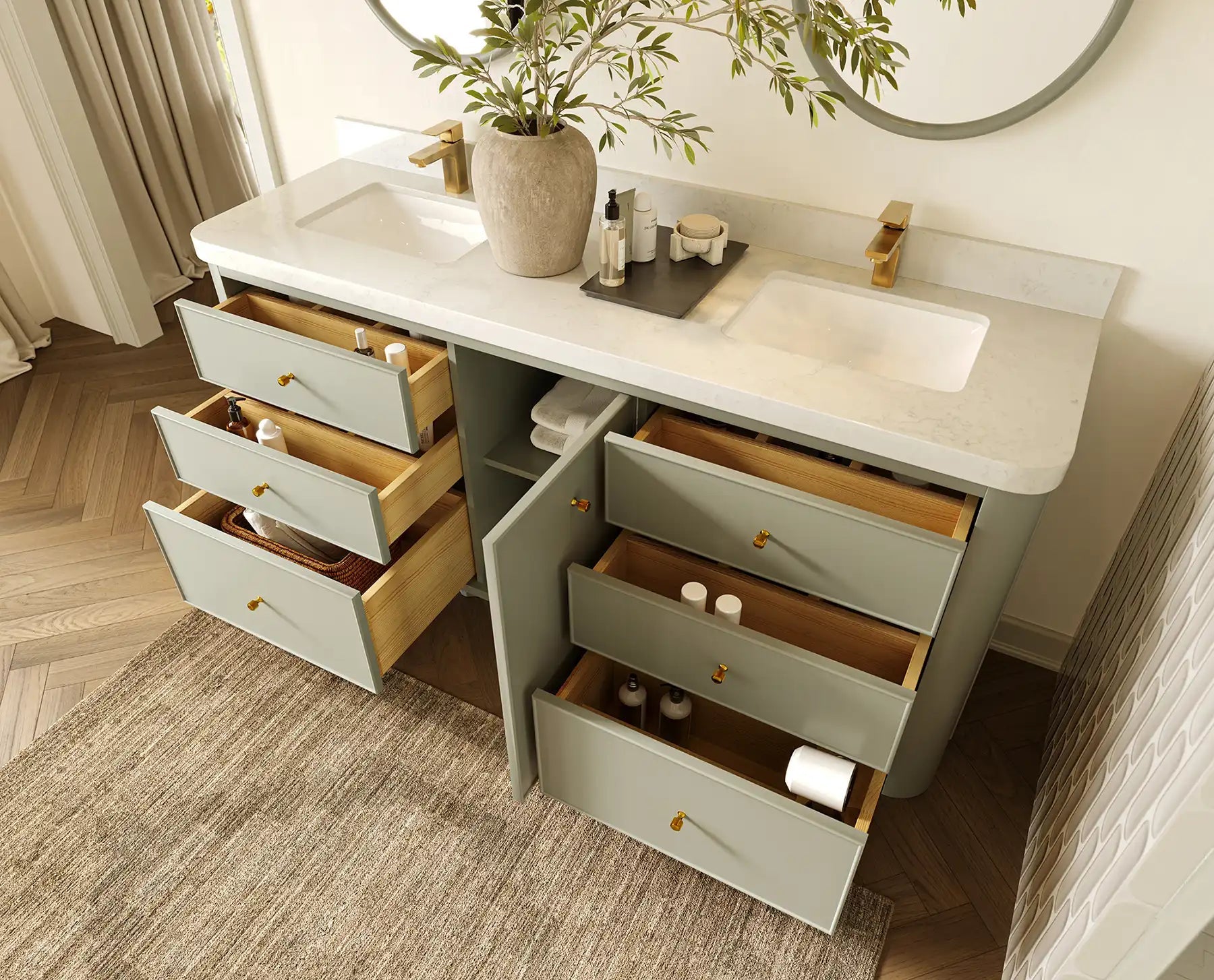 Inside, the vanity delivers generous storage with multiple drawers, open shelving, and spacious cabinet compartments—ideal for organizing towels, toiletries, skincare essentials, and grooming items. Its symmetrical, well-balanced layout keeps your bathroom neat, organized, and clutter-free while elevating both functionality and style.